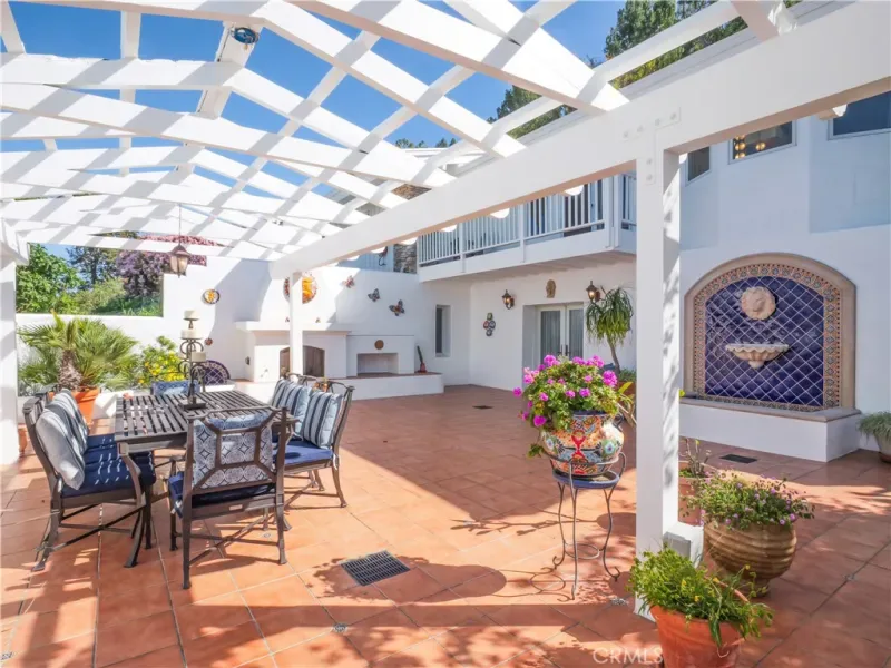 Vaulted ceilings, recessed lighting, curated alabaster light fixtures, hardwood floors, wide hallways, and generously sized bathrooms create an airy environment that feels both elegant and inviting. The oversized basement features a fitness room, storage room, full bathroom and wet bar, French doors openi to a Large Mediterranean style patio complete with an outdoor fireplace—offering additional space to retreat- or entertain!