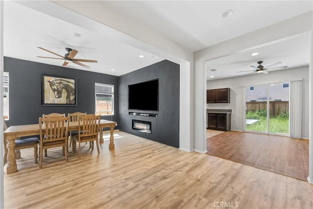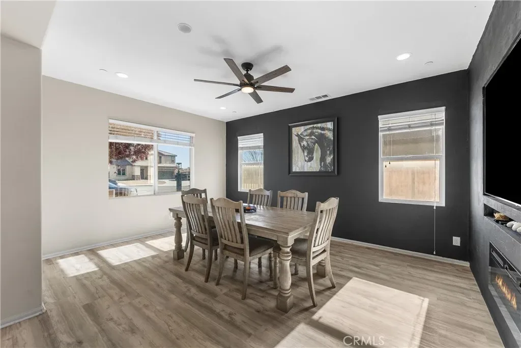 Cozy Dining Room: The dining room features an exquisite electric LED chimney, creating a warm and inviting ambiance for your meals and gatherings.