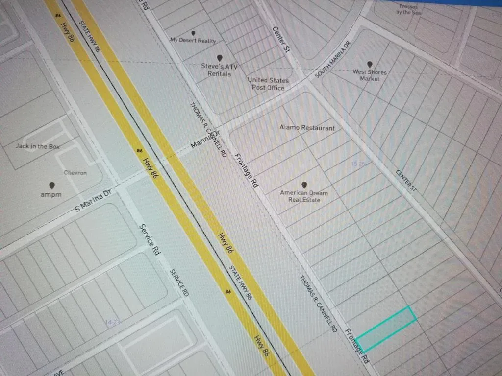 Salton City, Ca. 2072 Thomas R Cannell Road. Large lot 14,909 sf M/L located on frontage Road to Hwy 86. Zoned Commercial (C-2), lot has approx. 61 feet M/L of frontage on what happens to be one of the busiest connecting highways from Riverside County the Coachella Valley to Imperial County. You own the land, next door to existing commercial building. Utilities at adjacent property. Property sold ‘As-Is’. Seller and/or agent make no warranties except as to Title. You own the land. Lower IID electric in this area. Many Many potential uses for property. Salton Sea Area is becoming increasingly popular with geothermal and lithium developers as well as builders and investors. Buyer to do their own due diligence to satisfy themselves, also please check with Imperial County planning & Development for many uses and potential.