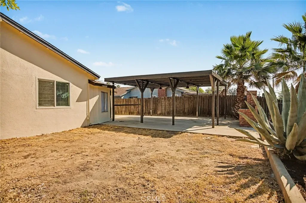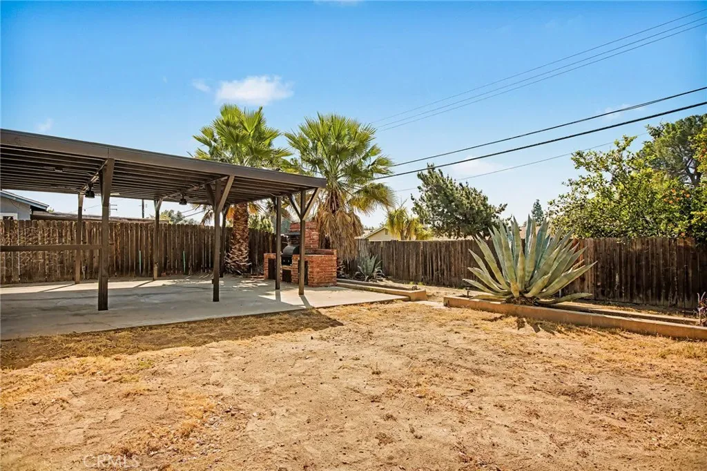 The extra-deep attached garage provides direct access to the kitchen and includes a lighted workbench and automatic garage door opener. The backyard is designed for entertaining, featuring a large covered patio with ceiling fans, lighting outlets, and a brick barbecue—perfect for festive gatherings.