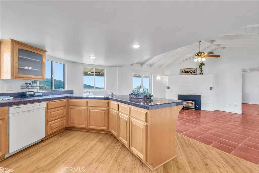 Drive up to your own private paradise! Perched atop the city on 1.92 acres, this 4 bedroom, 3 bathroom home offers incredible 360 degree views, from snow capped mountains in winter to unforgettable sunsets at night. Step inside through double doors into a home freshly painted inside and out, with new carpet in the primary and two guest bedrooms, while the rest of the home features durable tile and laminate flooring. The spacious kitchen boasts stone countertops, a wraparound bar with ample seating, recessed lighting, and a bay window framing stunning views. The living room and family room share a double sided brick fireplace and feature vaulted wood beam ceilings, creating an open and inviting space perfect for entertaining or relaxing. The primary bedroom is a serene retreat with a vaulted wood beam ceiling and dual ceiling fans, while the other bedrooms feature charming wood beam ceilings. The primary bathroom includes a separate soaking tub and an oversized shower. Additional highlights include a large laundry room with plenty of cabinet space, a 2-car attached garage, and expansive outdoor areas to enjoy the breathtaking surroundings. Enjoy the large covered patio at the front of the home perfect for morning coffee or evening sunsets. This home combines comfort, style, and spectacular views, truly a hilltop oasis you won’t want to miss.
