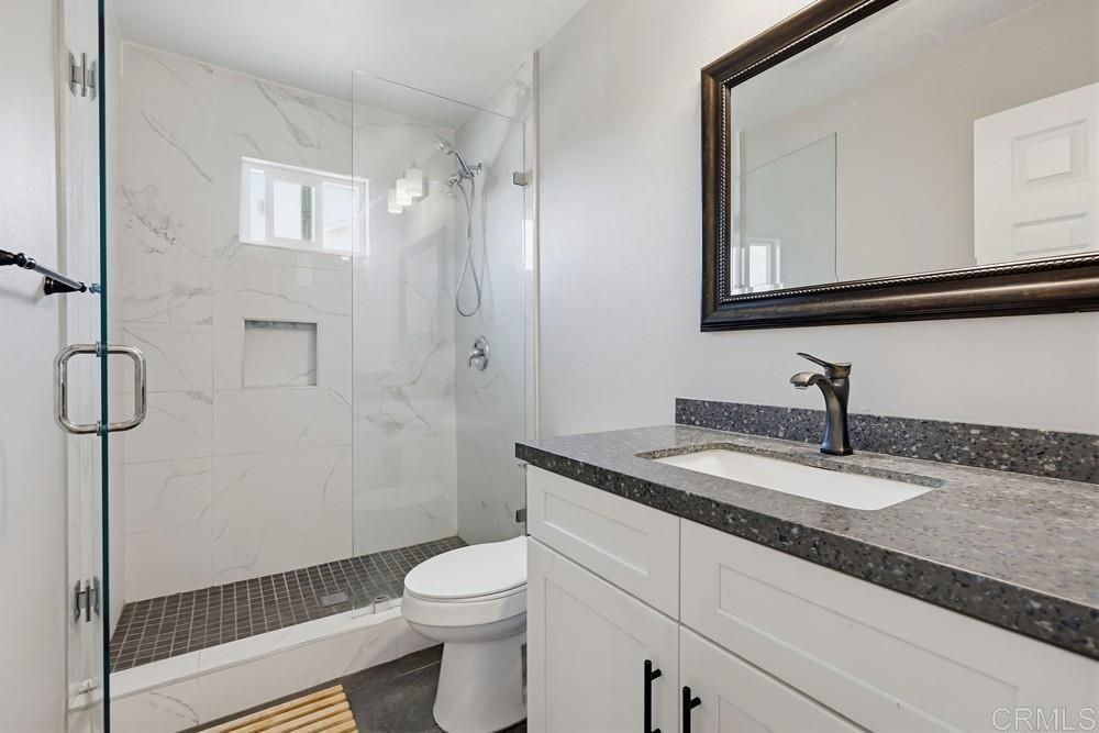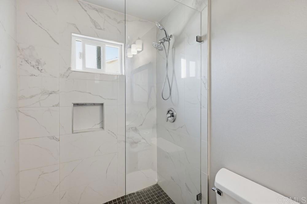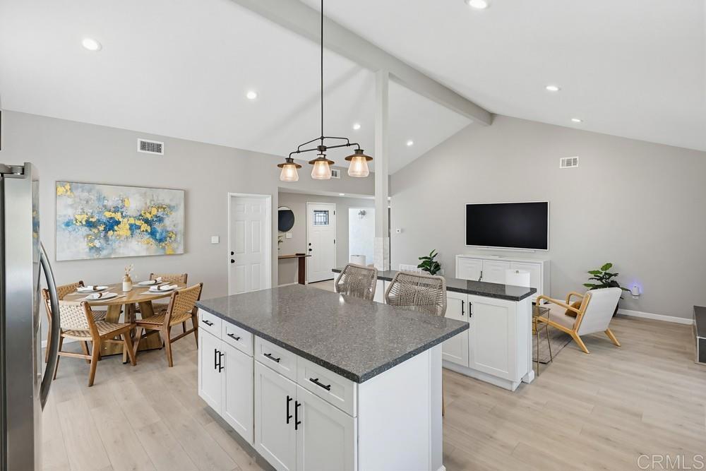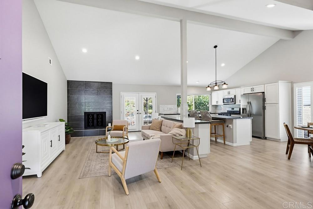 Beautifully remodeled single-story home in the highly desirable San Carlos neighborhood, showcasing thoughtful upgrades, modern finishes, and exceptional functionality throughout. The open-concept floor plan seamlessly connects the kitchen, family, and dining areas, creating an ideal space for both everyday living and entertaining. The home features high ceilings, abundant natural light, recessed lighting, a tile fireplace, laminate wood flooring, and dual-pane windows and doors. The upgraded kitchen is designed to impress with quartz countertops, ample cabinetry, stainless steel appliances, and two oversized islands—perfect for hosting and gathering. Both bathrooms have been tastefully remodeled with updated vanities and custom tile work. Additional interior upgrades include a fully insulated garage with finished flooring, plantation shutters throughout, and a whole-house water softener system. The exterior has been equally enhanced with vinyl fencing, upgraded landscaping, and poured concrete along the sides of the home for clean, low-maintenance functionality. The front and backyard feature artificial turf, and the covered patio provides a great space to relax or entertain outdoors. The home also includes central heat and A/C, along with an upgraded 200-amp electrical panel that is pre-plumbed for solar and battery backup. Ideally located near shopping, dining, Mission Trails Regional Park, and Lake Murray, this home offers a perfect balance of comfort, upgrades, and convenience.