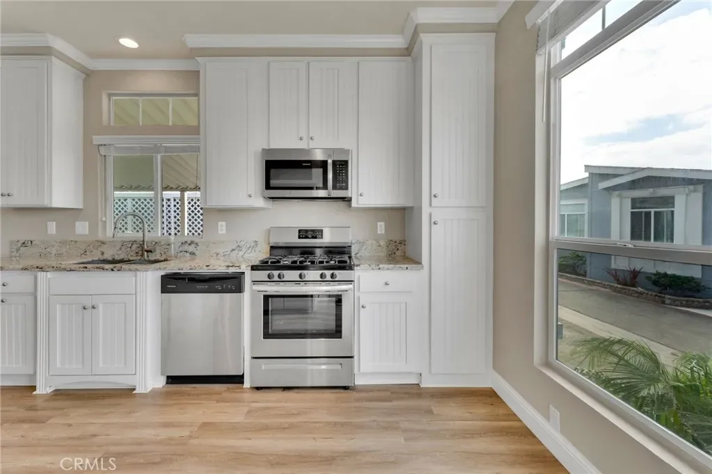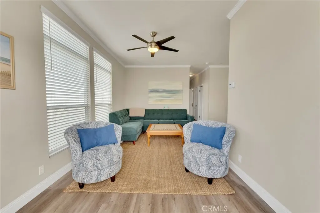 Welcome to coastal living in the heart of San Clemente! This charming two-bedroom, two-bathroom manufactured home is located in the highly sought-after 55+ community, Capo Beach Cottages, just a short walk from the Pacific Ocean. Step inside the home to find an inviting open-concept layout, where natural light pours through the many doors and windows. The kitchen features crisp white cabinetry, granite countertops, stainless steel appliances, and a convenient bar seating area! This makes it the perfect spot for casual meals or entertaining. The crown molding and matching finishes throughout the home create a cohesive, polished look that showcases the pride of ownership! French-style tandem doors open to a front patio area, an ideal spot to sip your morning coffee or enjoy the cool ocean breeze.