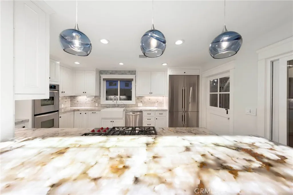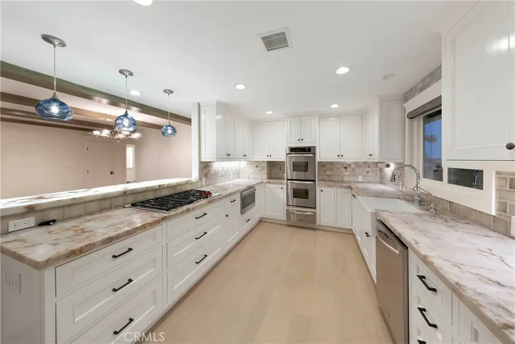 Natural light fills the thoughtfully curated interior, where warm wood flooring, new windows, and solid wood doors elevate the home’s timeless coastal aesthetic. The chef’s kitchen is both stylish and functional, featuring a open concept design, 5-burner cooktop, double ovens, stainless steel appliances, and a seamless built-in refrigerator—perfectly suited for entertaining or relaxed coastal living.