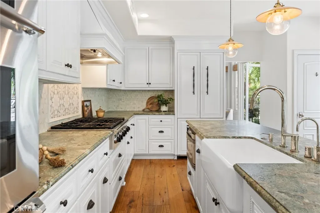 Inside, the five-bedroom, three-bath home blends refined design with everyday comfort. A dramatic two-story entry is complemented by a striking double staircase with solid oak treads and iron railings. The gourmet kitchen is appointed with custom cabinetry, Dacor appliances, Brazilian granite countertops, farmhouse sink, and a generous center island, flowing effortlessly into the inviting family room. A main-level bedroom and beautifully updated bath offer flexibility, while upstairs includes three secondary bedrooms and a spacious primary suite with a private balcony and sitting area.