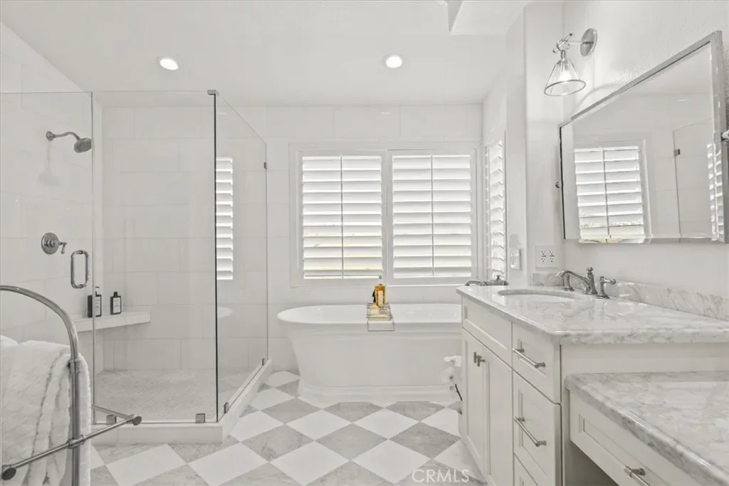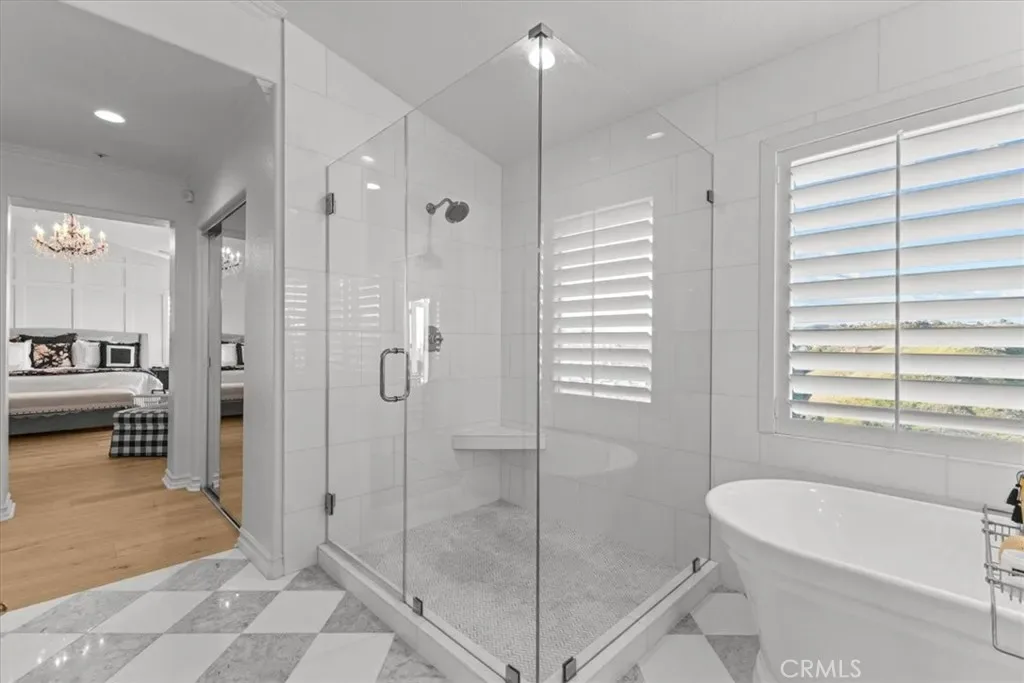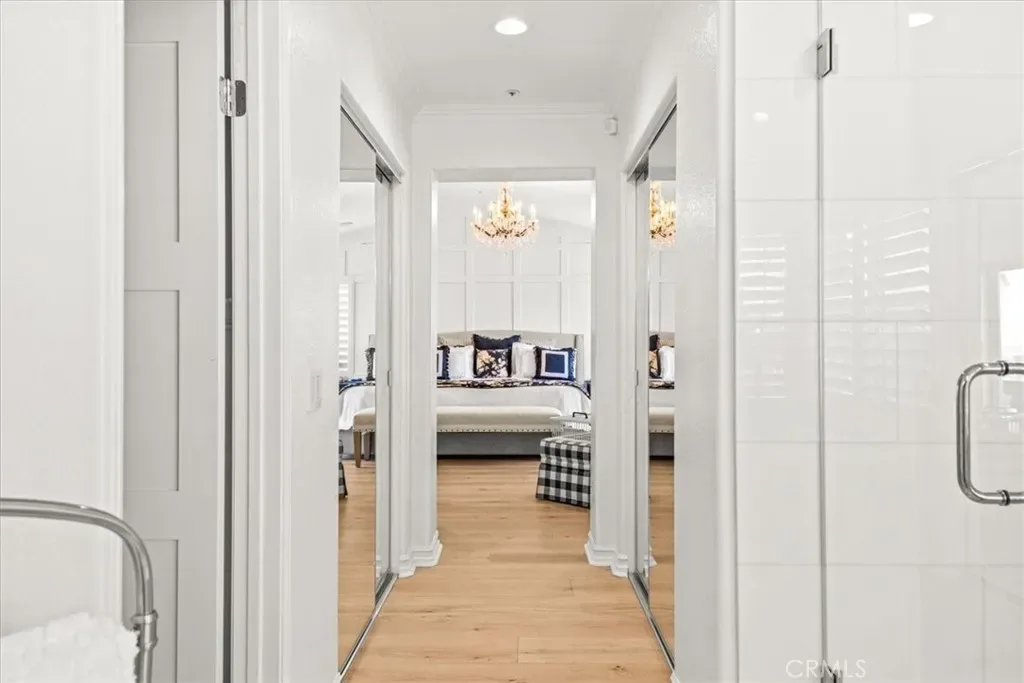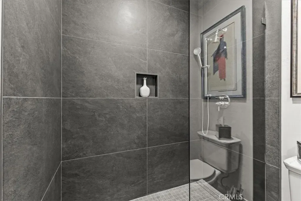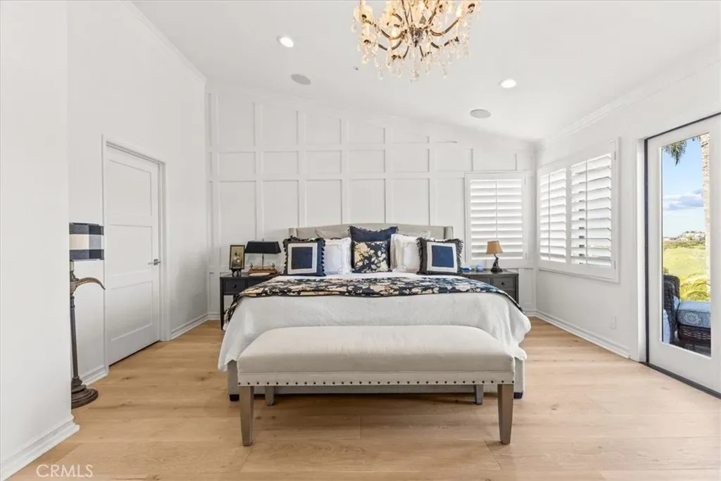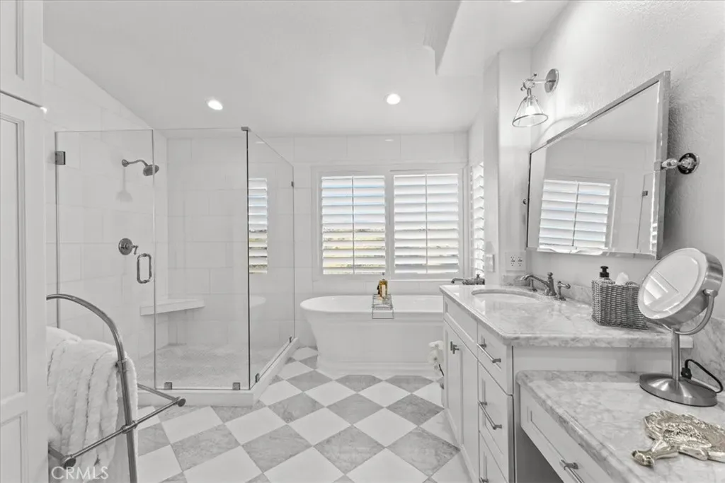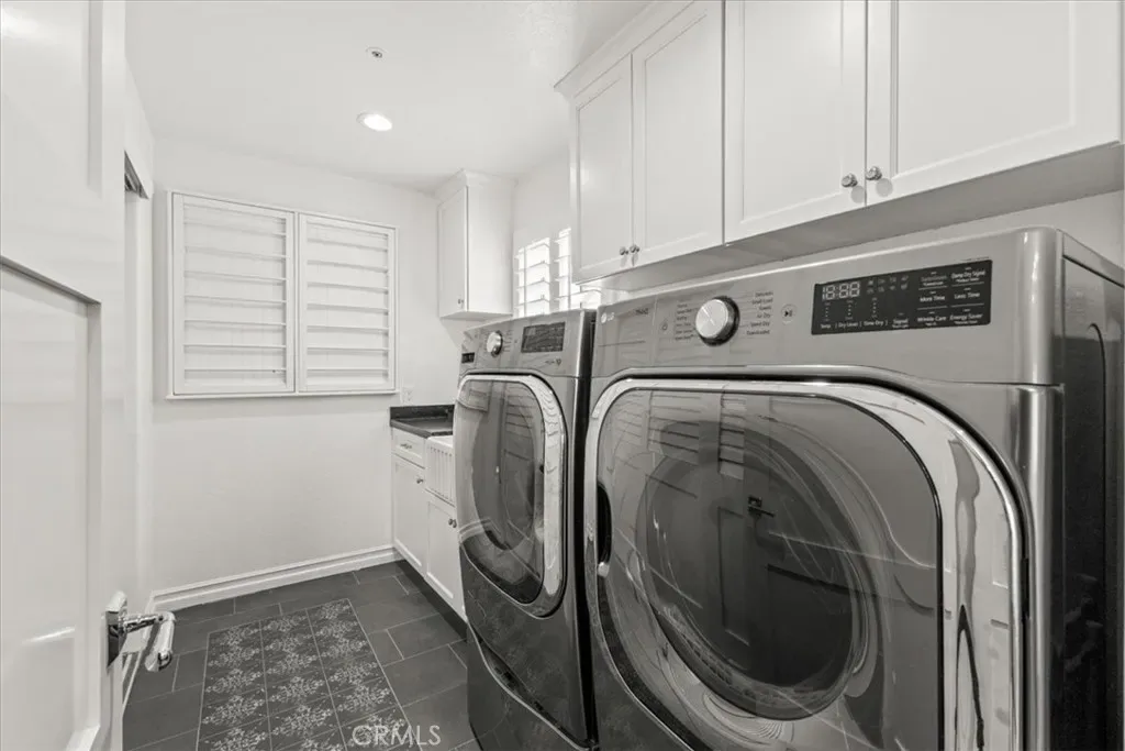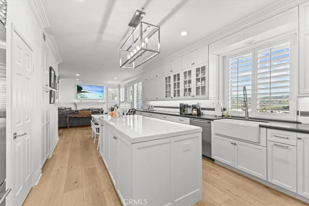 Upstairs, the primary suite is a private retreat with a generous view balcony oriented to maximize Catalina, ocean, hillside, and city-light views. The spa-inspired primary bath includes custom marble flooring, a custom sink, new frameless shower doors, and designer fixtures. An upstairs laundry room with custom storage is conveniently close to the bedrooms. All closets feature high-end custom closet systems, and the secondary bedrooms are spacious.