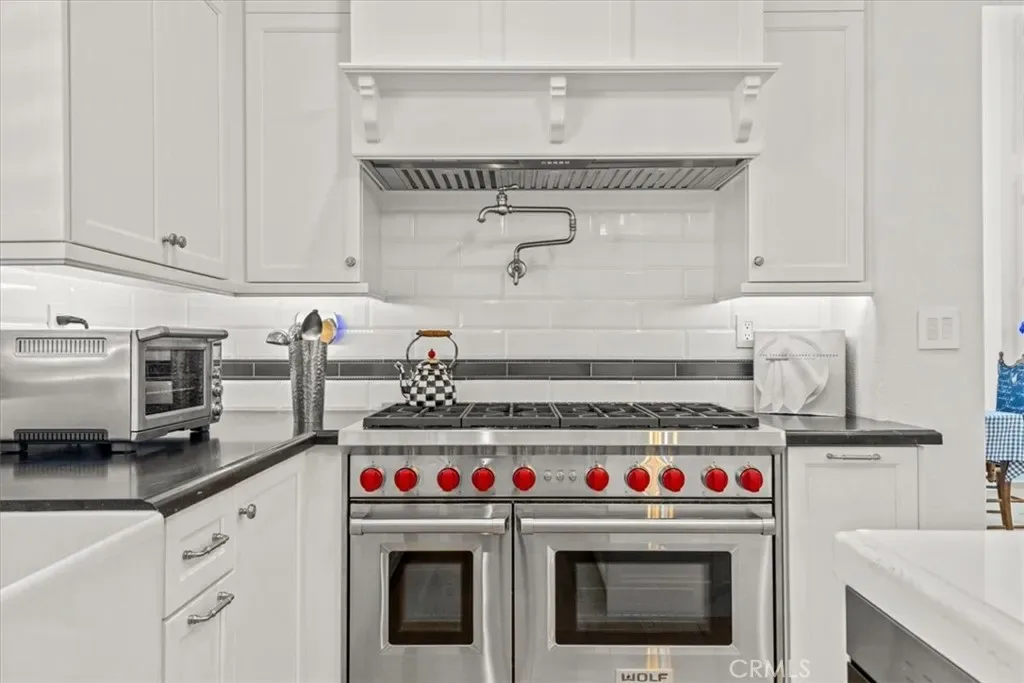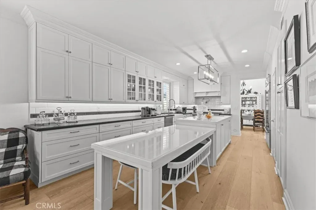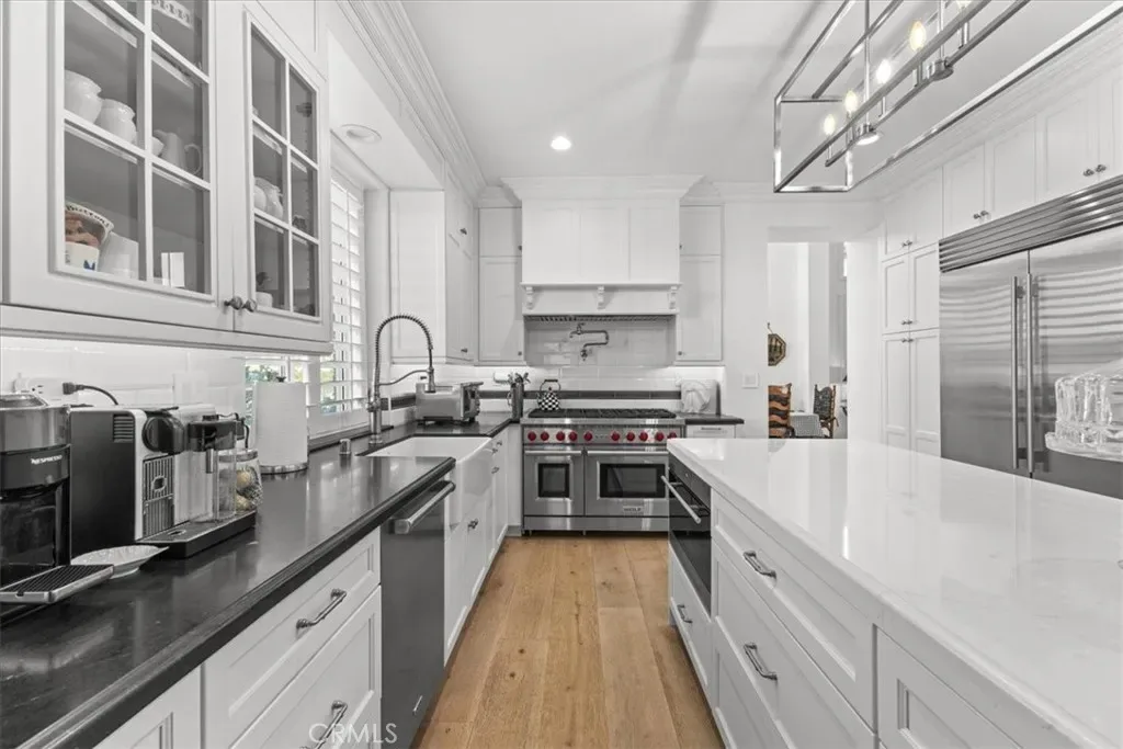 The designer chef’s kitchen offers honed granite perimeter counters, an oversized quartzite island with bar seating, and top-of-the-line appliances including a Sub-Zero refrigerator, Wolf range and microwave. Custom solid-wood cabinetry with soft-close doors, dovetail construction, and thoughtful pull-outs provide beautiful and highly functional storage.