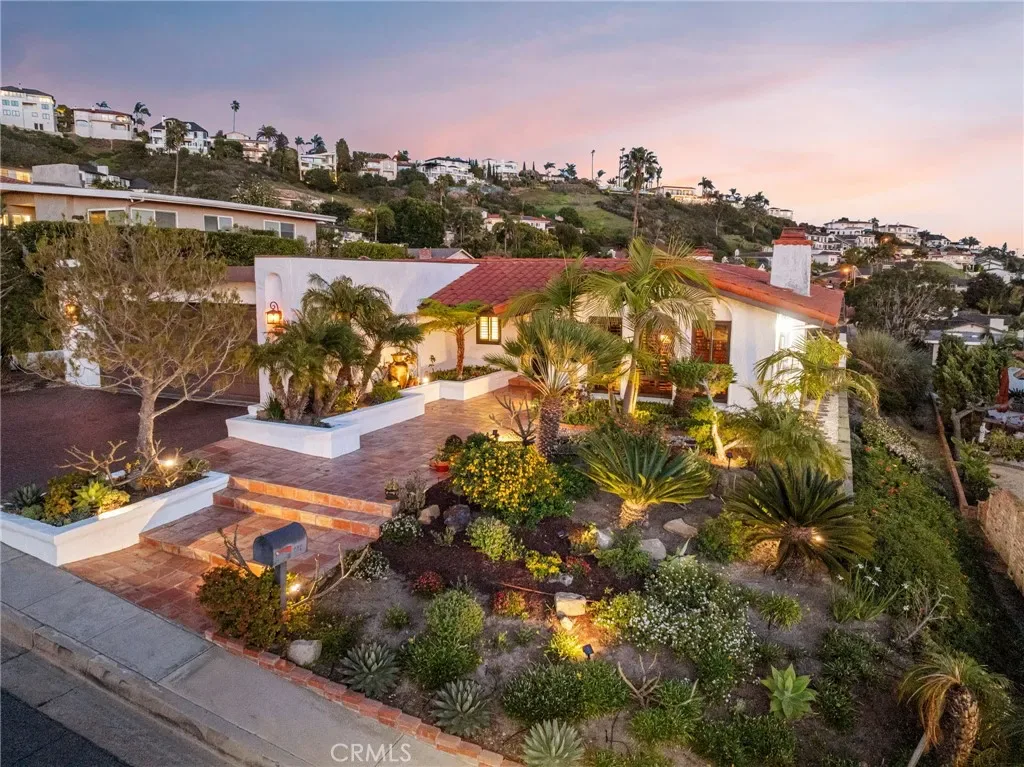 Experience panoramic OCEAN VIEWS from this beautifully designed spacious SINGLE STORY residence where open-concept living meets timeless Spanish architecture. Non-pass thru street, paid Solar and NO HOA make this a self sustaining choice. Incredible views of CATALINA ISLAND north, San Clemente Island west and La Jolla to the south. Designed for effortless entertaining, the chef’s kitchen showcases custom cabinetry, stainless steel appliances, a beverage refrigerator, and a custom wine room. Mediterranean engineered hardwood flooring flows throughout, complemented by marble accents & quartz countertops. Elegant pendant lighting, glass chandeliers, and fully dimmable custom lighting highlight the exceptional attention to detail. The front entrance showcases a tranquil floor fountain, original Spanish tile art, a lush pathway of ferns, palms, and flowering plants while original octagon pavers accent the driveway. La Cantina doors open the southwest corner of the home to a spectacular ocean-facing patio, seamlessly blending indoor and outdoor living. Enjoy morning coffee or evening sunsets beside the built-in gas fire table, pick fresh rosemary from the raised flower beds, and plant an additional garden on the south facing hillside. With only a few dozen homes, this street does not have pass thru traffic and is walkable to ILYA & SC Cafe. DOUBLE DOOR ENTRY, Spanish arches, a step-down living room featuring cathedral wood ceilings, and a cozy gas fireplace. The great room offers another stunning gas fireplace with wood mantle and a custom alcove housing a Samsung television and sound bar. A pop up electrical plug in the kitchen bar can transform the space into a surprisingly great work-from-home spot. The serene en suite primary includes dual sinks upgraded with neutral granite tones, a spa tub with a view, separate walk-in shower, and a walk-in closet. The large primary includes a seating area and sliding doors that open directly to the patio and sweeping OCEAN VIEWS! Energy-efficient dual-pane windows enhance comfort throughout the common areas and primary bedroom. ELECTRIC VEHICLE CHARGING STATION in the garage. OCEAN VIEW ASSURANCE in neighborhood tract deed. A rare opportunity to own a thoughtfully upgraded coastal sanctuary on almost one fourth of an acre where luxury, sustainability, and panoramic views converge. Price adjusted for buyer to perform any personal upgrades. Make an offer!