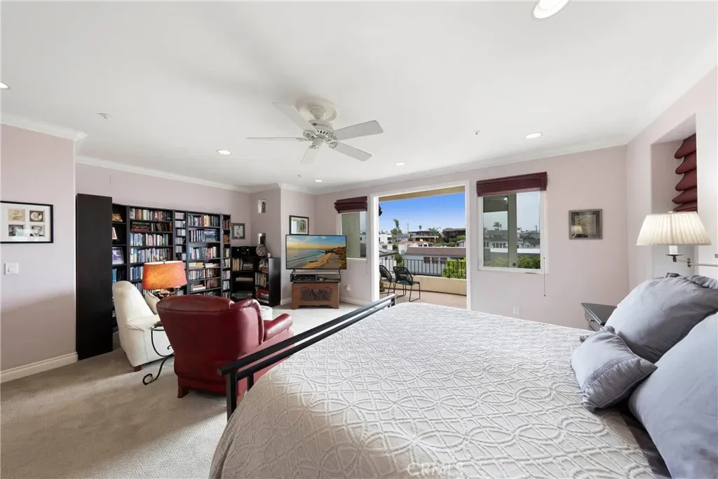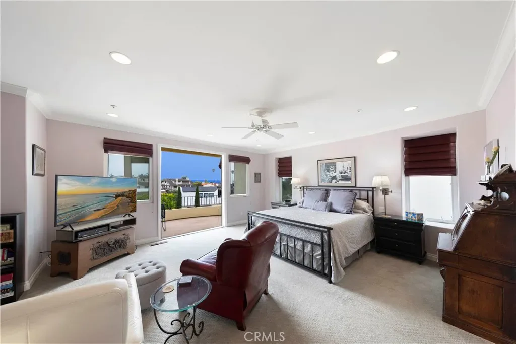 The main level includes one bedroom, a full bath, and a laundry room with ample storage. Upstairs, the primary suite offers a private sitting area with a large TV, an en suite bathroom with soaking tub and walk-in shower, and a private deck with ocean views.