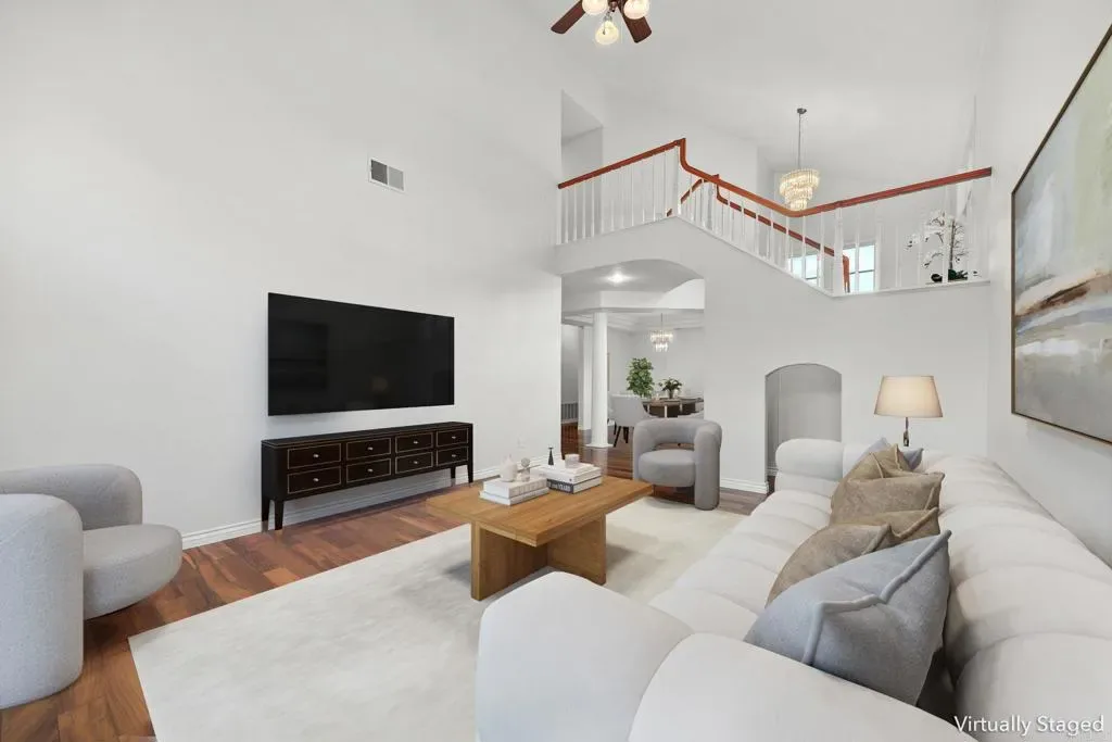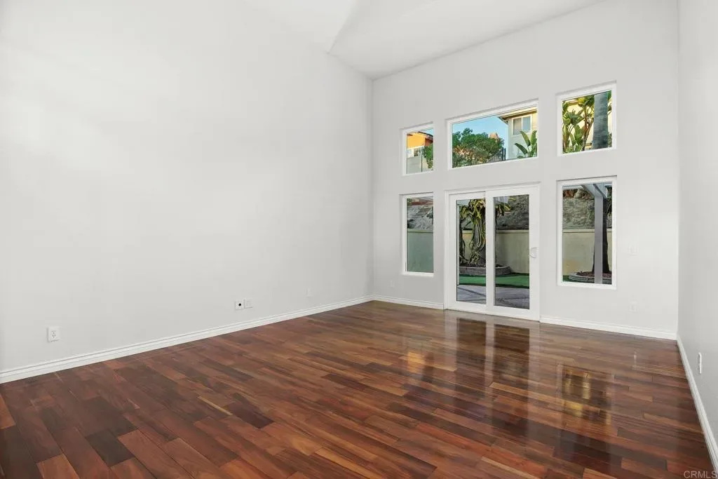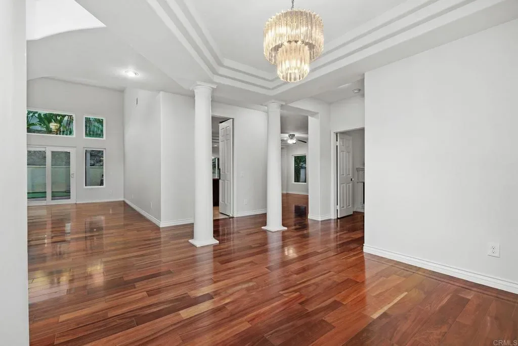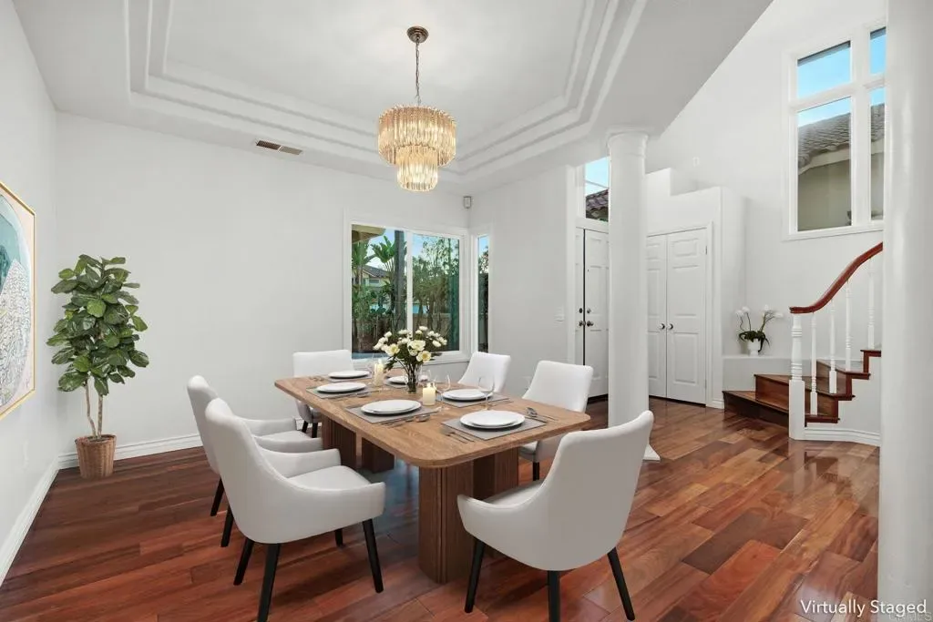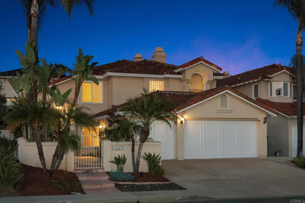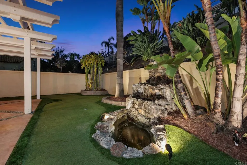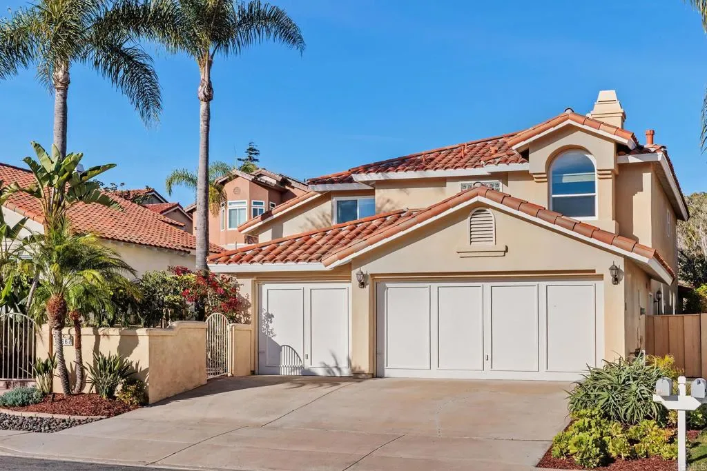 Nestled in one of Carmel Valley’s most desirable neighborhoods, this home makes a striking first impression with lush tropical curb appeal and a warm, inviting presence. Mature palms, vibrant bougainvillea, sugar apple, and dragon fruit frame a private front courtyard, creating a peaceful sense of arrival. The grand dual door entry, accented by clerestory windows above, welcomes you inside as natural light fills the space and highlights the home’s architectural design. The entry opens to a sweeping spiral staircase and elevated catwalk, creating a strong architectural focal point filled with natural light. The formal dining room features circular pillars and a statement chandelier, positioned to overlook the front courtyard. Hardwood floors lead into the expansive living room, where soaring two story ceilings and oversized windows create a bright, open space with natural flow to the backyard. The kitchen offers a warm and functional layout with cherry toned cabinetry, granite countertops, and a center island suited for everyday use. Stainless steel appliances include a KitchenAid wall oven, convection microwave, and a PacAir hood vent, bringing both performance and style. The kitchen opens seamlessly to the family room, creating a natural flow for everyday living. The expanded family room serves as the central gathering space, enhanced by motorized skylights with rain sensors, large picture windows, and direct access to the backyard. Anchored by a dual-sided fireplace, it creates a comfortable setting for hosting, relaxing, and daily living. Additional first floor spaces include a central bedroom with a fireplace, a dedicated laundry room with a utility sink and storage, a powder room, and a three-car garage with a built-in workbench. Upstairs, the primary suite offers a peaceful retreat with vaulted ceilings, abundant natural light, and serene backyard views. A dual-sided fireplace adds a touch of luxury between the bedroom and the spa inspired bathroom, complete with dual vanities, a soaking tub, and an oversized walk-in shower finished with decorative tile. Two additional bedrooms share a Jack and Jill style bathroom, with a dual vanity area separate from the shower and bath, allowing for added privacy and ease of use. The backyard continues the home’s inviting lifestyle with a covered pergola, large patio, and a turf area that doubles as a putting green or play space. A cascading rock fountain and mature tropical landscaping provide privacy and a resort like setting, complemented by a diverse collection of fruit trees including red and white dragon fruit, passion fruit, loquat, eggfruit, lemon, pomegranate, and fig, along with Japanese maple, palms, and bird of paradise. Located in a rare Carmel Valley pocket near the Bay Club, with no HOA and low Mello-Roos, this home offers exceptional access to top rated schools, parks, shopping, dining, and coastal amenities. Recent improvements include updated roof underlayment in 2025, adding long term value and peace of mind, making this an outstanding opportunity in one of North County’s most sought-after communities.