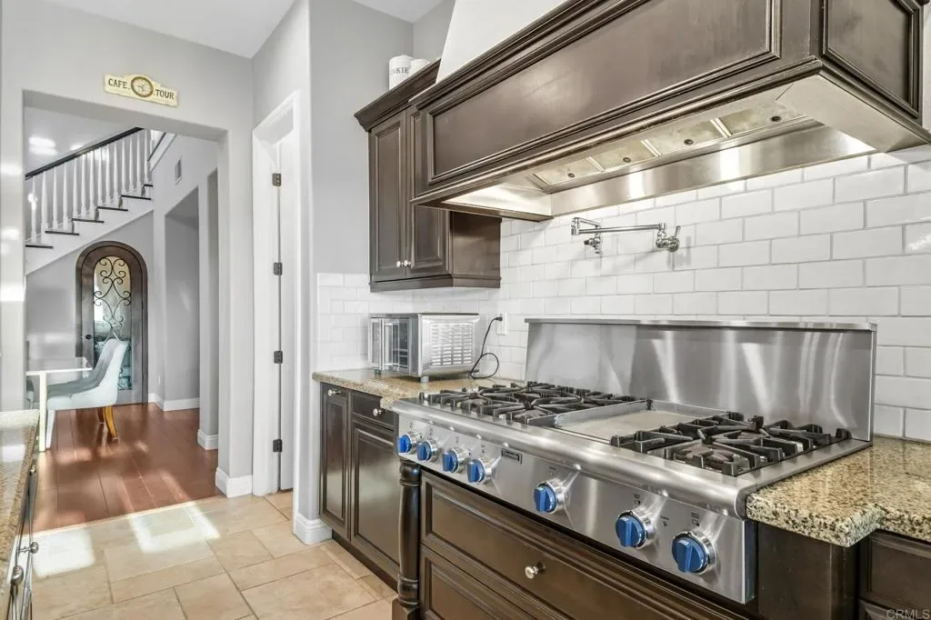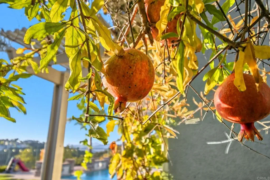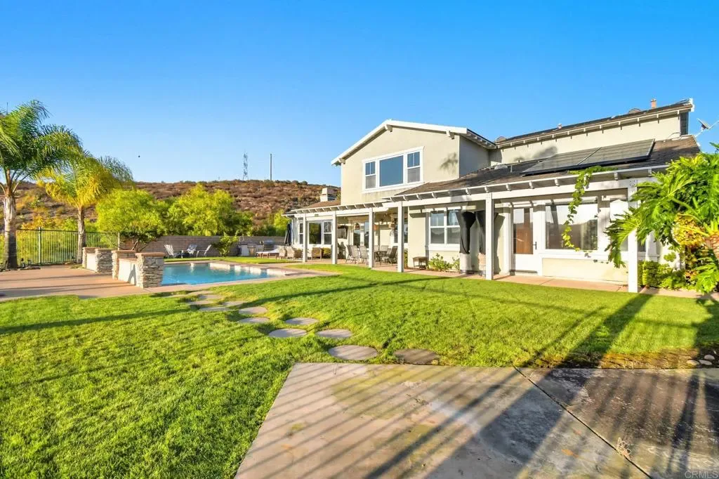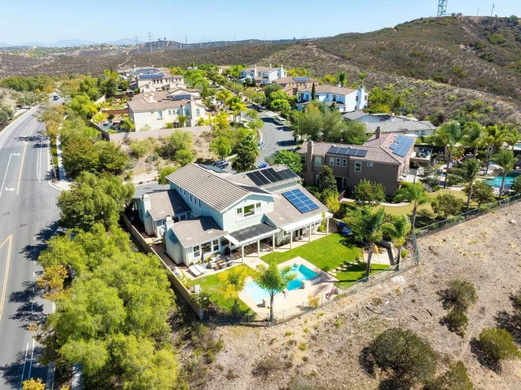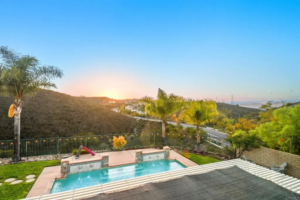 Luxury Retreat in Stonebridge Estates | Premium Corner View Lot Experience resort-style living in this beautifully designed Stonebridge Estates home, ideally situated on a premium corner lot with no neighbors to the side or behind, offering exceptional privacy and sweeping open-space views. Inside, soaring ceilings, abundant natural light, and elegant hardwood and stone flooring create a warm yet sophisticated atmosphere. The gourmet kitchen features Thermador appliances, a built-in refrigerator, and a commercial-grade range, opening seamlessly to the spacious family room perfect for everyday living and entertaining. The flexible floor plan includes two bedrooms on the main level, including a luxurious primary suite with direct backyard access. The spa-inspired bathroom features dual vanities, a soaking tub, stone shower, and an oversized walk-in closet. A second downstairs suite with private bath and walk-in closet provides an ideal space for guests or multi-generational living. Upstairs offers four additional bedrooms, including one with an en-suite bath and retreat area perfect for an office or playroom. Another oversized bedroom showcases stunning panoramic views and can easily function as a loft, media room, or additional suite. Step outside to a resort-style backyard featuring a designer pool, lush landscaping, and an impressive collection of fruit trees including pomegranate, peaches, lemons, avocados, persimmons, loquat, and grapevine. Additional features include paid solar for the home and pool, Nest thermostat, crown molding, wine cellar, three-car garage, and converted guest quarters. Located within the highly acclaimed Poway Unified School District and close to parks and trails, this exceptional home blends luxury, privacy, and everyday comfort.