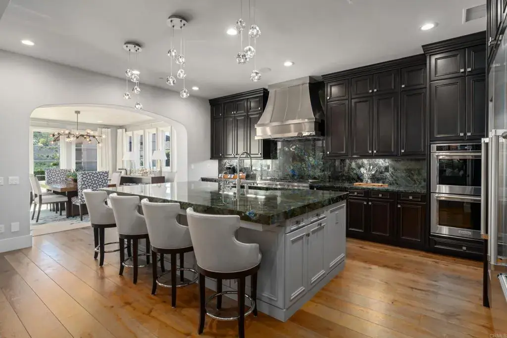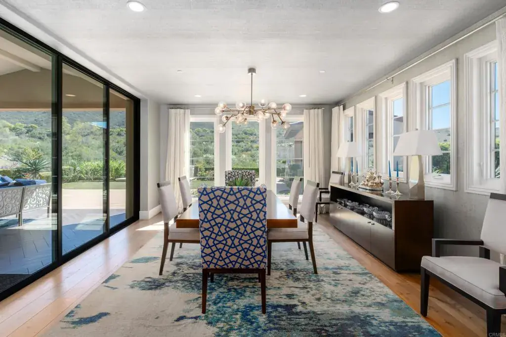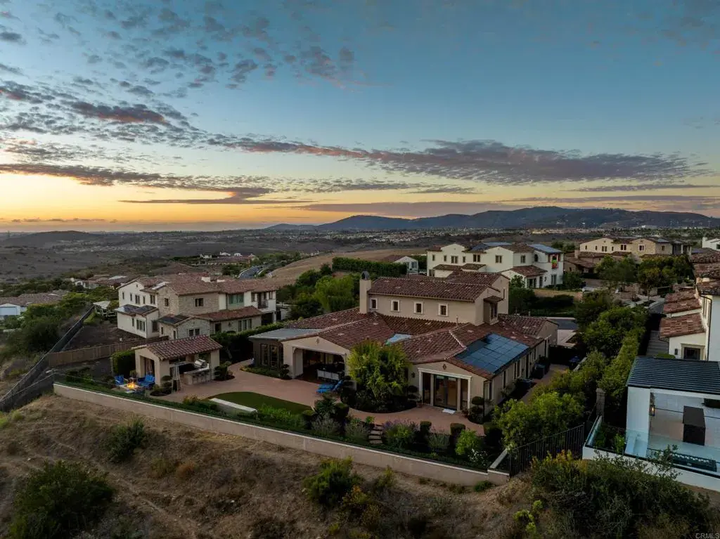 Tailored for elevated living, this exquisitely upgraded residence in the Estates at Del Sur blends refined design, intuitive functionality, and serene privacy. Every detail has been thoughtfully curated—from custom millwork and handcrafted finishes to extensive storage and a smart, flowing floor plan. A seamless indoor-outdoor experience unfolds through vanishing pocket doors and a motorized screen, opening the heart of the home to the expansive California Room, complete with built-in heaters and a fireplace. Inside, the gourmet kitchen makes a statement with rare Lemurian Blue granite counters, dual refrigerators, a walk-in pantry, and extensive custom cabinetry—designed for both everyday comfort and elevated entertaining. Wide-plank Duchateau oak flooring runs throughout the main living areas, complemented by dramatic lighting from top-tier designers and handmade Phillip Jeffries wallpaper in the dining room, powder room, and primary suite. The luxurious primary bath features Carrara marble, heated floors, and a spa-like atmosphere, while a secondary suite includes a walk-in jetted tub with chromatherapy, fast-fill and fast-drain functionality. Outdoors, a thoughtfully positioned fire pit provides front-row views of soaring paragliders off Black Mountain, occasional hot air balloons, and roaming local wildlife. The built-in BBQ pavilion includes granite counters, a sink, refrigerator, and mature fruit trees—pomegranate, lime, lemon, and Valencia orange. Additional highlights: wide paver walkways designed for strollers or mobility access, five-zone HVAC system, custom cabinetry throughout (including casita, living room, kitchen, and multiple bedrooms), central vacuum, epoxy-coated garage floors with built-in storage, double-insulated walls, paid solar, and a security system with motion sensors. Set within a private, gated enclave of just over 50 homes, with access to all Del Sur amenities—resort-style pools, scenic trails, parks, and a staffed resident clubhouse—this residence offers rare quality and comfort in one of San Diego’s most sought-after communities.