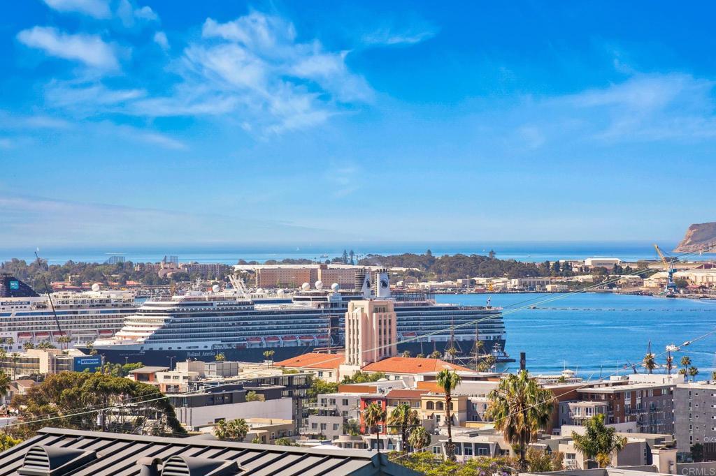 One for the money & two for the show! Top-floor, west-facing condo in south Bankers Hill offers amazingly big panoramic views for under $1 million. The pretty blue waters of San Diego Bay and the Pacific Ocean set the stage, and this condo captures the dynamic atmosphere of San Diego’s waterfront. The 2 bdrm, 2 bath, end-unit condo has a split bdrm floorplan, with 2 west-facing balconies. There are 2 gated parking spaces (tandem). New flooring & paint; dual-pane windows. Located across the street from the iconic Hob Nob Hill restaurant, and easy walking to Balboa Park & museums, eateries, and coffee houses of Bankers Hill. Close to downtown, Little Italy, SAN airport, beaches & freeway.