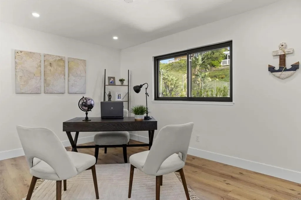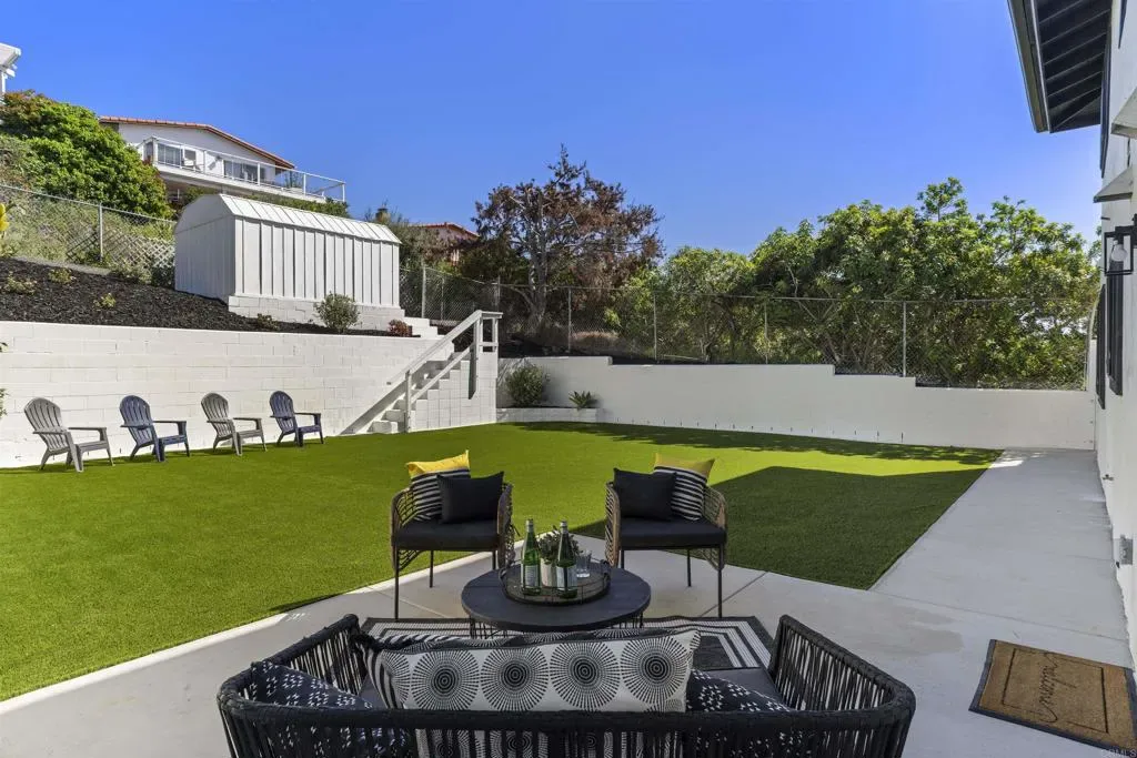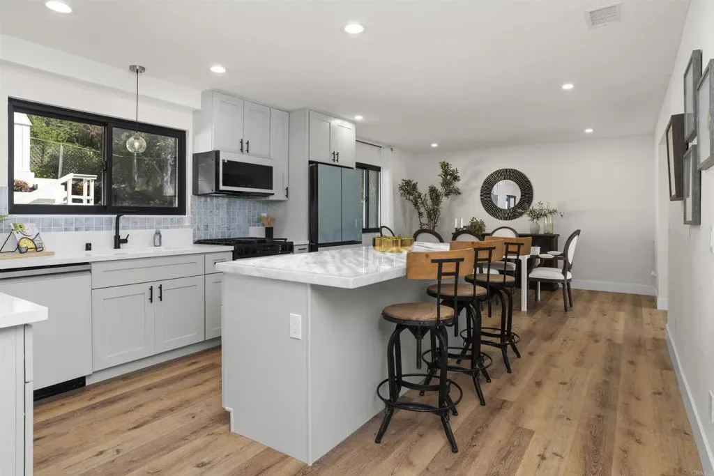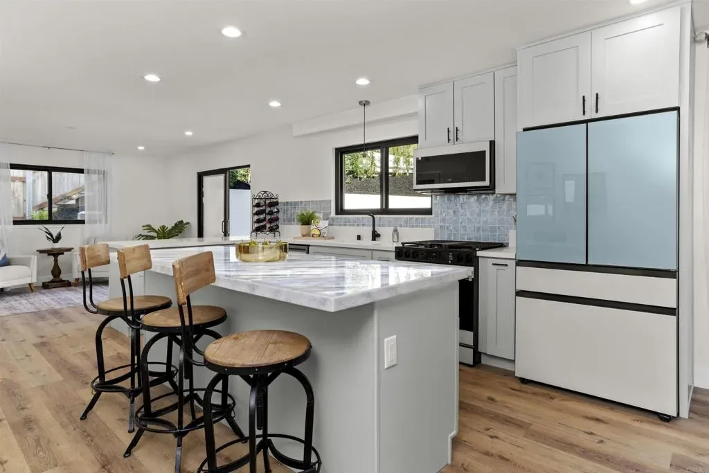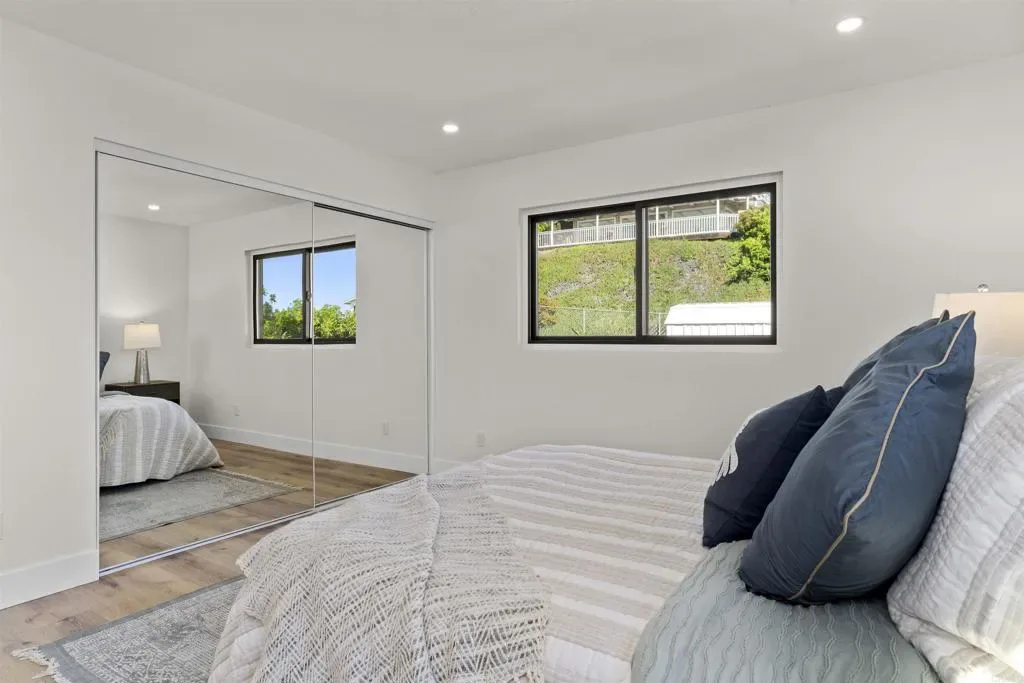 Stunning Bay Park View Property with Fully Remodeled Main Home + Detached Guest House Perched in the heart of Bay Park, this beautifully reimagined coastal property captures breathtaking panoramic views of Mission Bay and SeaWorld from both the main residence and the detached guest house. With five bedrooms and 3.5 bathrooms across two thoughtfully designed living spaces, this fully renovated property offers the perfect blend of modern luxury, versatility, and San Diego lifestyle. The home has undergone a complete top-to-bottom renovation including all new electrical and plumbing throughout, creating a truly turnkey living experience. The designer kitchen has been completely reconfigured and features WiFi-enabled Samsung Bespoke appliances, including a refrigerator with a built-in beverage center—perfect for entertaining or enjoying a refreshing drink while taking in the coastal views. A dramatic lighted Quartzite du island and fireplace create a stunning focal point in the main living space. Throughout the home you’ll find new flooring, beautifully upgraded bathrooms with LED mirrors, and an expanded laundry room designed for modern convenience. The detached ADU has been fully upgraded from top to bottom, offering its own remodeled kitchen, bathroom, laundry, and dedicated storage—ideal for guests, extended family, or rental income potential. Step outside to enjoy low-maintenance landscaping with drought-tolerant plants and turf in both the front and backyard, creating inviting outdoor spaces without the upkeep. Additional highlights include owned solar, maximizing energy efficiency and long-term savings. Located in one of San Diego’s most charming coastal neighborhoods, this home is within walking distance to Mission Bay Park’s playgrounds, waterfront paths, and recreational activities, as well as the new trolley station for convenient access throughout San Diego. The property is also centrally located near major freeways, shopping, dining, and the coast—making it easy to enjoy everything San Diego has to offer. This rare Bay Park property combines spectacular views, high-end finishes, flexible living spaces, and an unbeatable location—a true coastal retreat in one of San Diego’s most sought-after communities