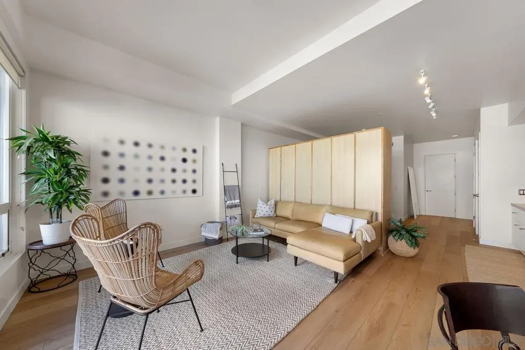 The HOA is exceptionally strong, currently 106% funded, which adds a layer of confidence for homeowners and buyers alike. Discover elevated urban living in this sophisticated 9th-floor studio, ideally situated in Little Italy. This thoughtfully designed single-level residence offers 674 sq. ft. of contemporary living, highlighted by soaring 10–10.75 ft ceilings and a full north-facing wall of glass that fills the space with natural light. From this vantage point, enjoy city and Point Loma views, along with a peek of the San Diego Bay to the west. You’ll also have a front row seat to planes making their approach to San Diego International Airport, one of the uniquely charming and iconic elements of Little Italy living. The modern galley kitchen features quartz countertops, sleek cabinetry, and stainless-steel appliances. A rare 1.5-bath layout maximizes functionality, and the in-unit washer/dryer adds everyday convenience. Step out onto your private balcony to take in the neighborhood’s activity below. Additional highlights include 8′ interior doors, central A/C and heat, and one assigned parking space. A well-funded HOA provides added value by covering water, trash, and sewer services. Set within one of San Diego’s most vibrant neighborhoods, you’re moments from renowned restaurants, cafés, boutiques, the waterfront, and the beloved Saturday Farmer’s Market. This is stylish, walkable urban living at its best in Little Italy Proper, a perfect blend of style, walkability, and effortless urban living.