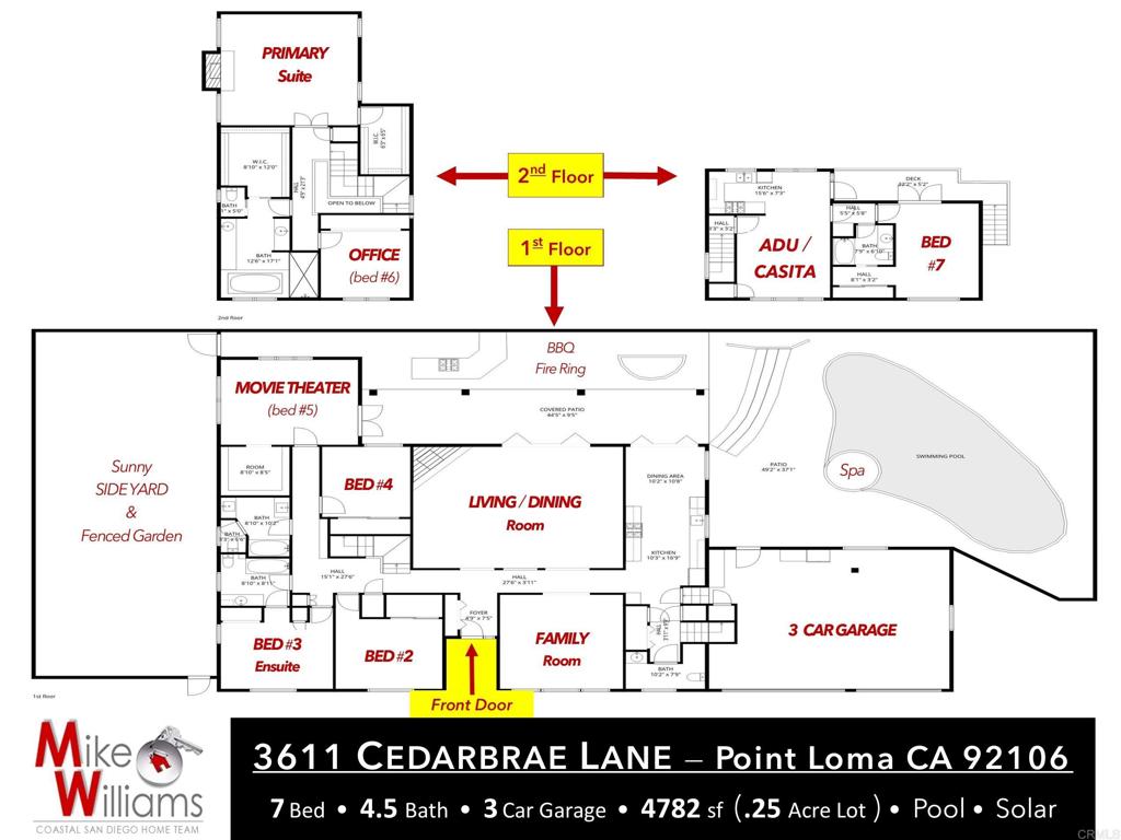 Welcome to 3611 CEDARBRAE LANE in the “Wooded Area” at the coveted southern end of POINT LOMA *** This spacious home is situated on a tree-lined CULDESAC CORNER LOT (.25 acre) with an attached ADU/CASITA (ideal for MULTI-GEN living or rental income) *** Extensively remodeled with designer selected materials has created a warm inviting space to breath, cook, work & play in one of the most beautiful residential areas of San Diego *** STANDOUT FEATURES include; 7 potential bedrooms + Chef-caliber Kitchen finishes + POOL / SPA / Waterslide + SOLAR & EV Chargers + Cantina Folding French Doors off the Great Room & Kitchen + Primary bathroom suite is stunning *** MAIN HOME specs = 4 Bedrooms + OFFICE (bed 5 option) + MOVIE Theater (bed 6 option) + 3.5 Bath + 3 Car Garage *** The ADU/CASITA has a private entrance OR can be entered from inside the home *** ADU/Casita layout = Living Room, Full Kitchen, Full bath, spacious bedroom & private balcony *** TRUE BACKYARD OASIS … unwind, entertain & relax Poolside or get cozy warming your toes around the tumbled glass gas Fire-Ring *** BONUS AREA is the large Side Yard + Fenced Garden *** So close to some of the best San Diego lifestyle has to offer – Jensen’s Grocery Market (1 mi), Sunset Cliffs (1.5 mi), Yacht Clubs along Shelter Island (2 mi), Cabrillo Nat’l Monument & Lighthouse (3 mi), International Airport (4 mi), Mission Beach (6 mi), Downtown Petco Park (8 mi) … Call to schedule a private tour today!