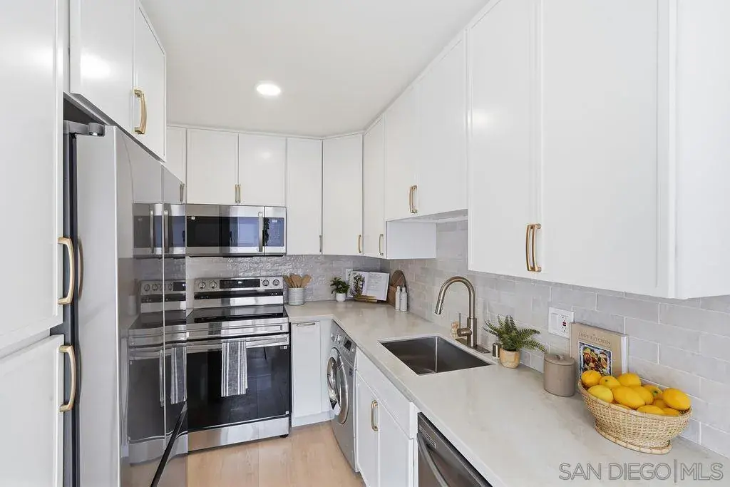 Welcome to this fully remodeled Pacific Beach retreat, ideally situated in the highly desirable Pacific Heights complex. This bright, south-facing corner unit offers an open, airy feel and features in-unit laundry, a private covered patio, two tandem parking spots, and all-new finishes throughout. Recent upgrades include luxury vinyl plank flooring, fresh paint, custom built bathroom, new cabinetry, stainless steel appliances, luxury counter tops and recessed lighting. Enjoy unbeatable convenience, just a few minutes to the beach, the freeway, Kate Sessions Park and nearby shopping. Come enjoy all the amazing things Pacific Beach has to offer!