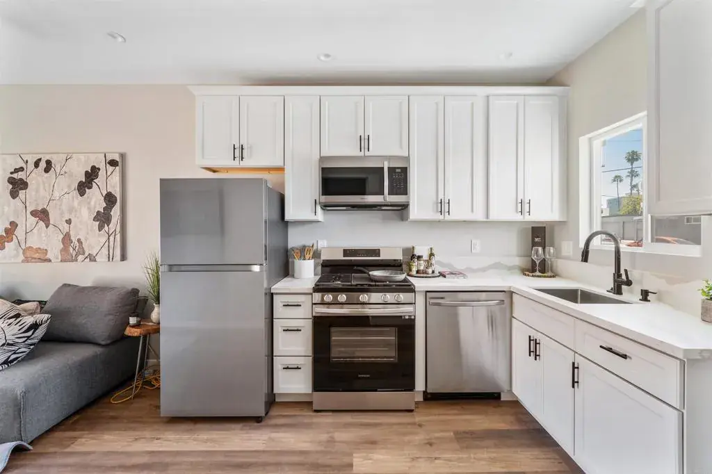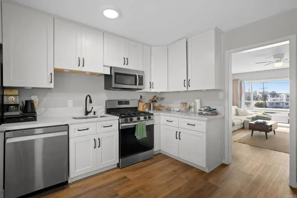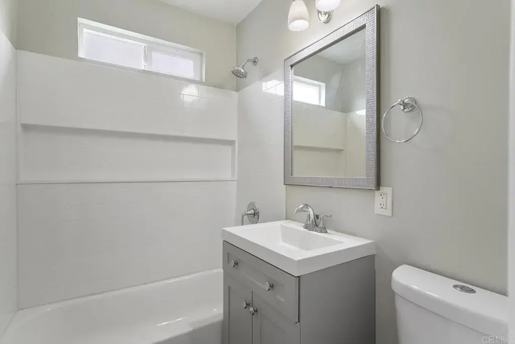 Wonderful 4-unit property in the Bay Park area. All 4 units are turnkey and fully occupied. Property consists of 3 -2 bed/1 bath homes and 1 – 1 bed/1 bath home. All have private yards and all renovated in 2022. All kitchen and baths come with quartz counter tops, stainless steel appliances, LVP flooring throughout. All 4 come with their own in unit washer & dryers. All 4 units are individually metered for Gas & Electric. Front building consists of 2 matching units (2 bed/1 bath) and the middle unit is a converted garage to the 1 bed/1 bath unit. The back building was added a few years ago with a downstairs garage with two separate 1 car garages and upstairs is a 2 bed/1 bath unit with a panoramic view of Mission Bay and the ocean. The tenants in the upstairs unit get the use of one of the 1 car garages and one unit in the front gets the use of the other 1 car garage and driveway. One water bill for the property. All tenants pay an additional $45 per month for water bill which averages about $400 every other month.