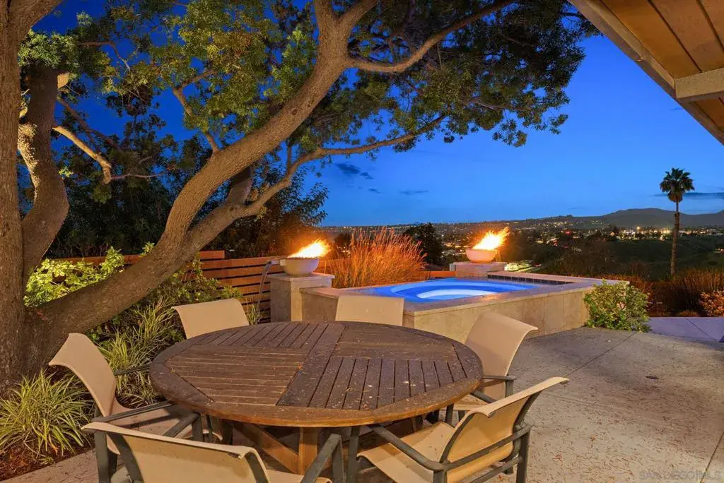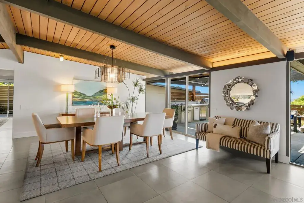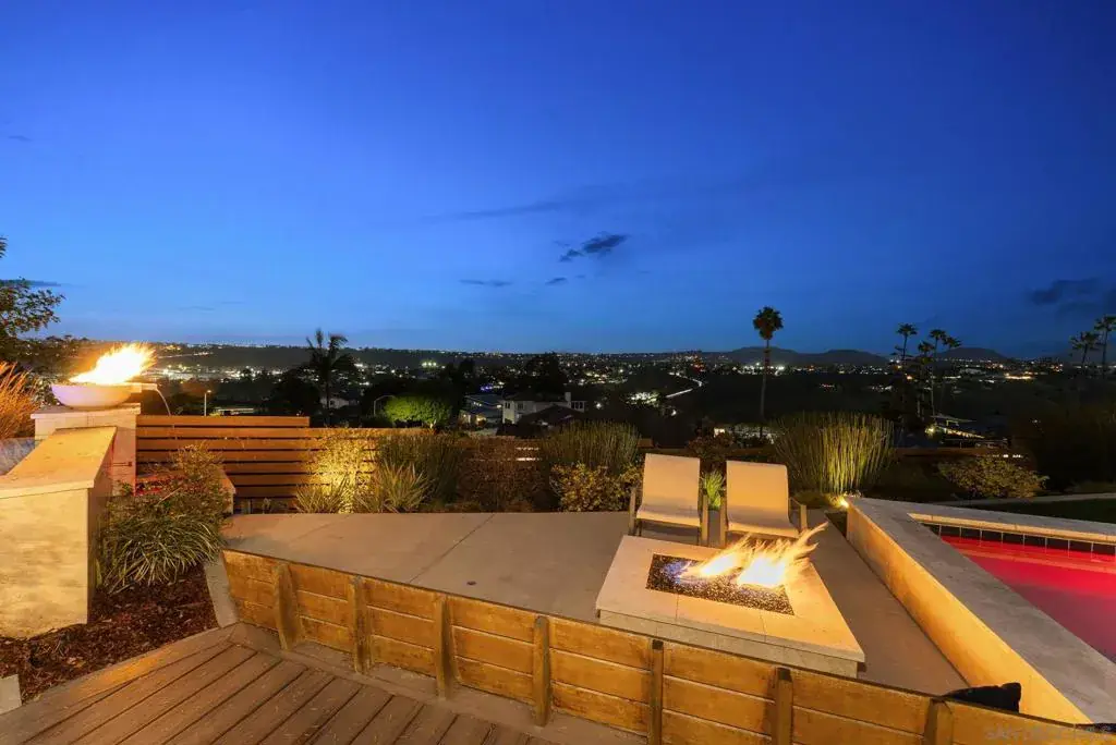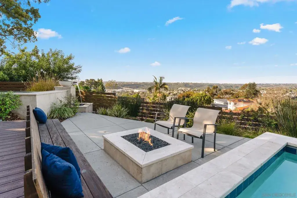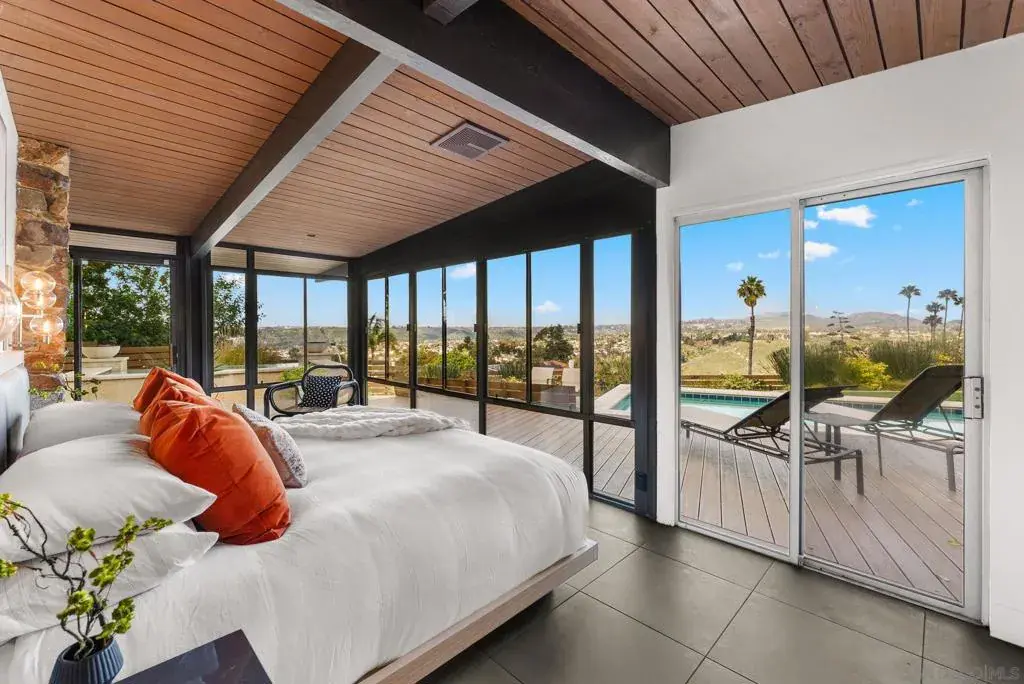 A documented Mid-Century Modern residence designed by Henry Hester, built in 1959 and officially recognized as the Lyn Schwartz Residence. From the street, the low-profile post-and-beam structure immediately distinguishes itself from surrounding homes. The original architectural intent remains intact, with a strong connection between indoor and outdoor spaces. Walls of floor-to-ceiling glass face west and north, opening the living areas to the panoramic views on a private lot. The original open floor plan is centered around a stone fireplace, maintaining the home’s architectural focus. Hard-surface flooring runs throughout. The kitchen has been fully renovated and features Miele appliances, including an 8-burner dual-fuel range, built-in coffee system, and built in refrigerator. A large island with custom cabinetry anchors the space, along with a mini-bar and wine refrigerator. The primary suite captures breathtaking views and opens to the deck and poolside lounge area. The remodeled primary bathroom includes a soaking tub, custom shower, and a spacious closet area. The other two bedrooms are located on the opposite side of the home and open to a private covered patio. The hall bathroom has also been renovated with thoughtful design upgrades. The outdoor living areas include a built-in BBQ, fire pit, multiple seating and entertaining zones, a pergola-shaded sitting area beneath a mature podacarpus tree, and a custom spa with fire and waterfall features, all anchored by a Palm Springs–inspired pool. The full impact of this home can only be experienced in person. College View Estates is a vibrant and distinct mid-century neighborhood holding traditions such as the First Friday – where neighbors gather monthly for a happy hour style of socializing at a new home each month, the Annual Block Party with a Kona ice truck, entertainment for the kids with rock climbing wall and more, and the Annual Progressive Dinner. This neighborhood is truly is a San Diego’s hidden gem- situated between the gated Alvarado Estates Community and SDSU- it’s tucked away just enough to escape the hustle and bustle of the city, but close enough to shopping like Trader Joe’s, a multitude of dining options, walking distance the Aztec Gym, tennis, swimming, and Viejas Arena for year around entertainment.