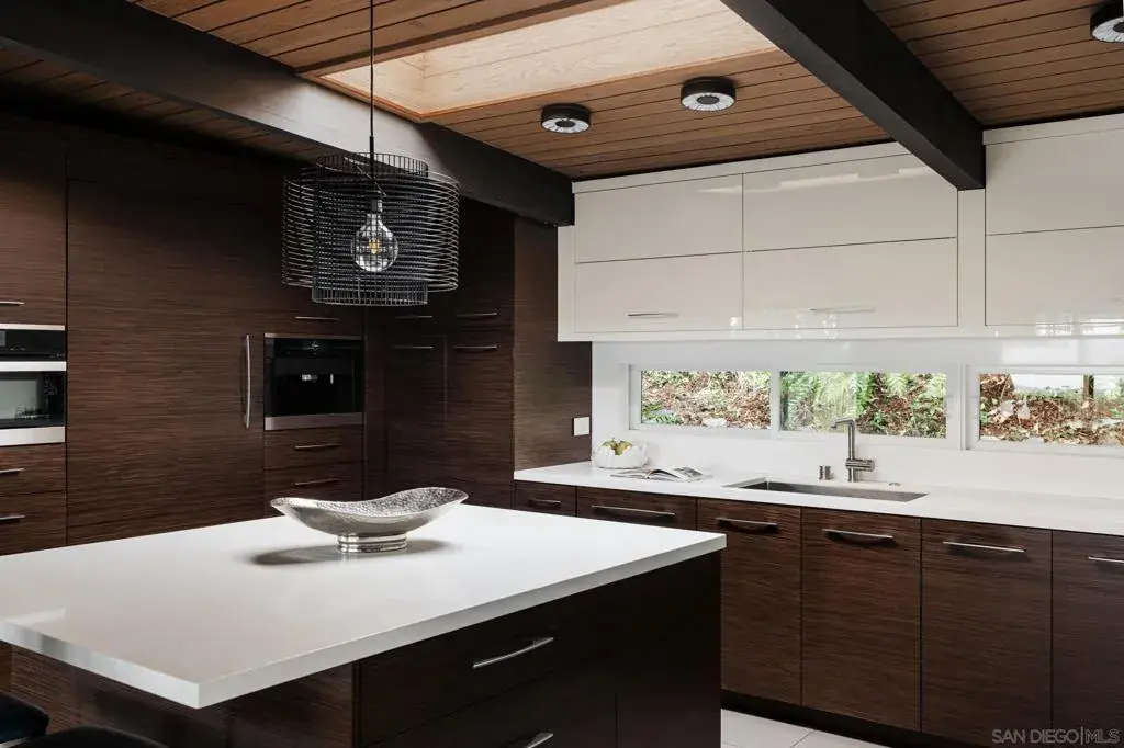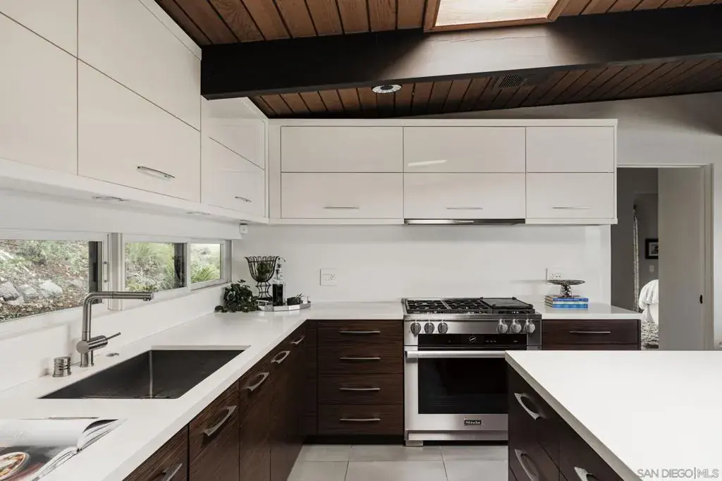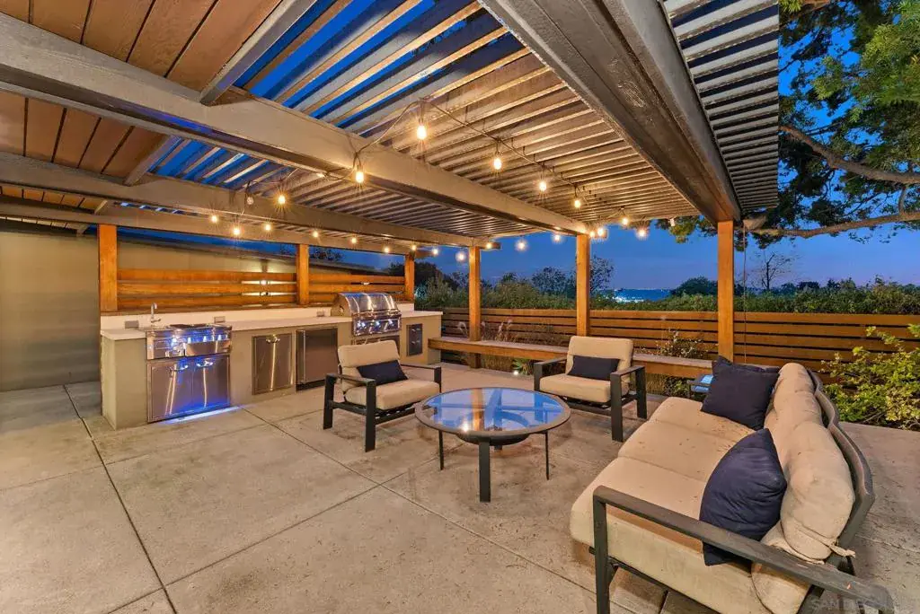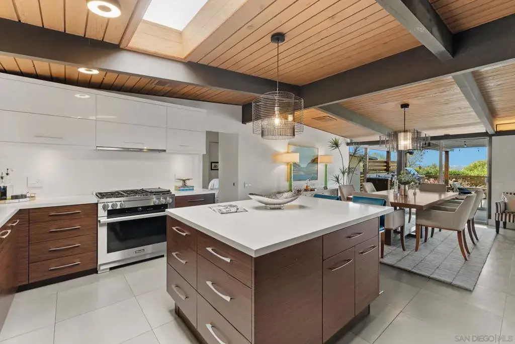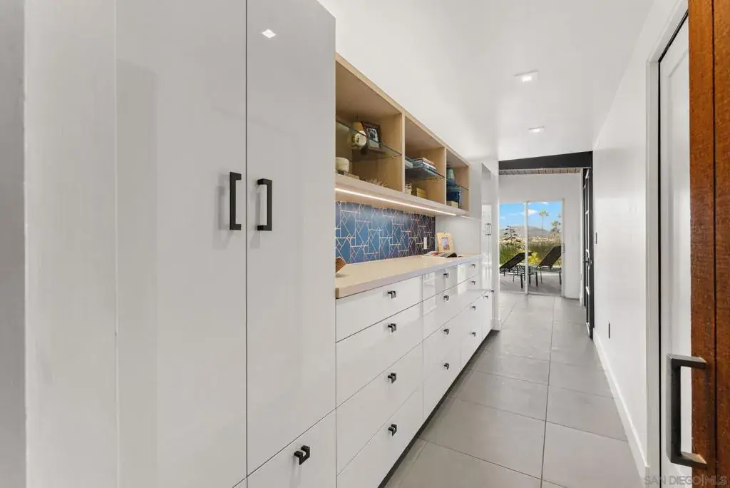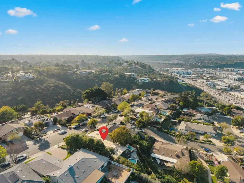 A documented Mid-Century Modern residence designed by Henry Hester, built in 1959 and officially recognized as the Lyn Schwartz Residence. From the street, the low-profile post-and-beam structure immediately distinguishes itself from surrounding homes. The original architectural intent remains intact, with a strong connection between indoor and outdoor spaces. Walls of floor-to-ceiling glass face west and north, opening the living areas to the panoramic views on a private lot. The original open floor plan is centered around a stone fireplace, maintaining the home’s architectural focus. Hard-surface flooring runs throughout. The kitchen has been fully renovated and features Miele appliances, including an 8-burner dual-fuel range, built-in coffee system, and built in refrigerator. A large island with custom cabinetry anchors the space, along with a mini-bar and wine refrigerator. The primary suite captures breathtaking views and opens to the deck and poolside lounge area. The remodeled primary bathroom includes a soaking tub, custom shower, and a spacious closet area. The other two bedrooms are located on the opposite side of the home and open to a private covered patio. The hall bathroom has also been renovated with thoughtful design upgrades. The outdoor living areas include a built-in BBQ, fire pit, multiple seating and entertaining zones, a pergola-shaded sitting area beneath a mature podacarpus tree, and a custom spa with fire and waterfall features, all anchored by a Palm Springs–inspired pool. The full impact of this home can only be experienced in person. College View Estates is a vibrant and distinct mid-century neighborhood holding traditions such as the First Friday – where neighbors gather monthly for a happy hour style of socializing at a new home each month, the Annual Block Party with a Kona ice truck, entertainment for the kids with rock climbing wall and more, and the Annual Progressive Dinner. This neighborhood is truly is a San Diego’s hidden gem- situated between the gated Alvarado Estates Community and SDSU- it’s tucked away just enough to escape the hustle and bustle of the city, but close enough to shopping like Trader Joe’s, a multitude of dining options, walking distance the Aztec Gym, tennis, swimming, and Viejas Arena for year around entertainment.