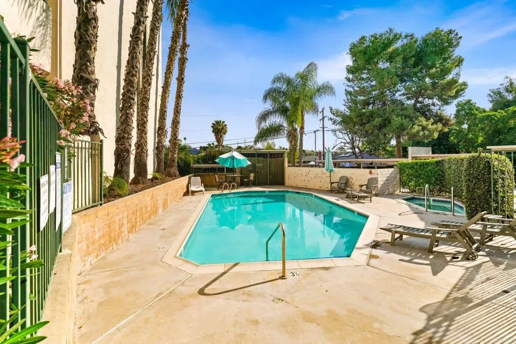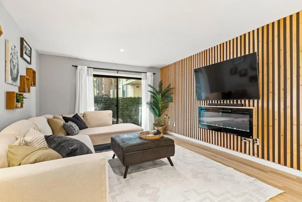 Upgraded condo in a gated, secure community near SDSU. Your lush oasis awaits! Renovated with new LVP floors, custom walnut kitchen cabinets, recessed lighting, modern fixtures, and an electric fireplace framed by a decorative slat wall. The primary ensuite features a dual-sink vanity with upgraded finishes, while energy-efficient updates include dual-pane windows, LED lighting, reverse osmosis water filtration, and a new 14-SEER HVAC with Smart thermostat. Enjoy in-unit laundry, a private patio, and two parking spaces, along with access to a community pool and spa. Set back from the street, this home offers privacy while remaining close to SDSU, shopping, and dining. Centrally located as your jumping off point for all that San Diego has to offer! The lush, gated complex feels like a private oasis, with views of palm trees that evoke a Hawaiian escape in the heart of the city.