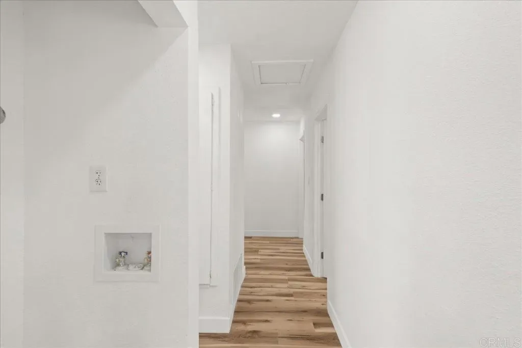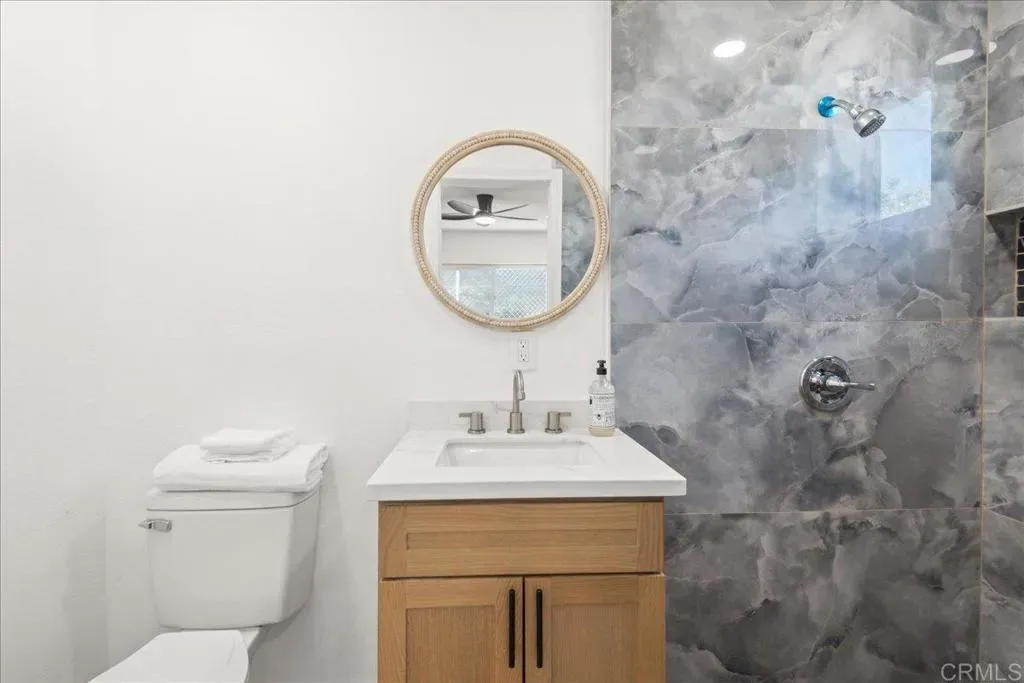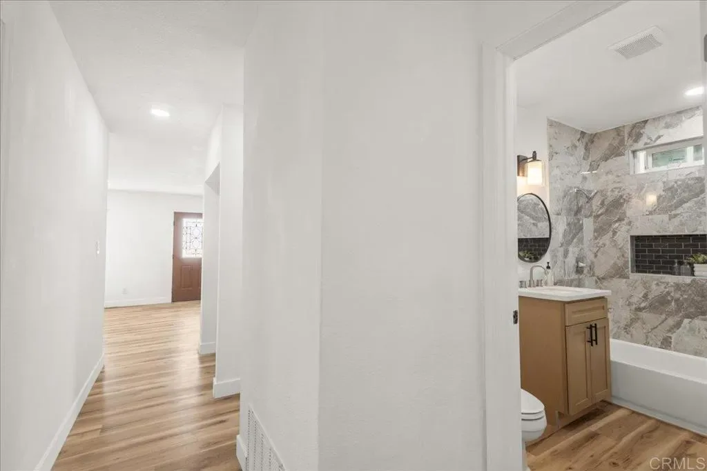 Beautifully remodeled home with a permitted attached ADU offering a total of 5 bedrooms—an ideal setup for multigenerational living, guests, or potential rental income. The main home features 3 bedrooms and 2 bathrooms (1,107 sq. ft.), while the attached ADU, with its own separate address (6126), offers approximately 400 sq. ft. with 2 bedrooms, 1 bath, its own kitchen, washer/dryer hookups, and a dedicated split unit for temperature control. The main residence showcases a stylish, updated kitchen with quartz countertops and new cabinetry that flows seamlessly into the living area, where a cozy fireplace creates a warm, inviting atmosphere. Just off the kitchen, an oversized covered patio provides the ideal space to embrace San Diego’s indoor-outdoor lifestyle—perfect for entertaining or relaxing year-round. Inside, the home features vinyl flooring throughout, recessed lighting, and beautifully remodeled bathrooms with modern tile and new vanities, creating a fresh and contemporary feel. Additional upgrades include dual-pane windows and a recently re-roofed home for added efficiency and peace of mind. The main house also offers central heating, washer and dryer hookups, solar, ceiling fans in each bedroom and the living room. Outside, the property offers expansive parking directly in front of the home along with a large backyard, providing flexibility for multiple vehicles, gatherings, and outdoor activities.