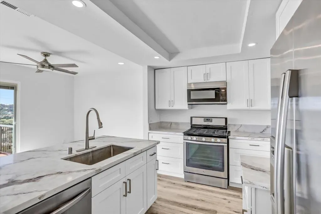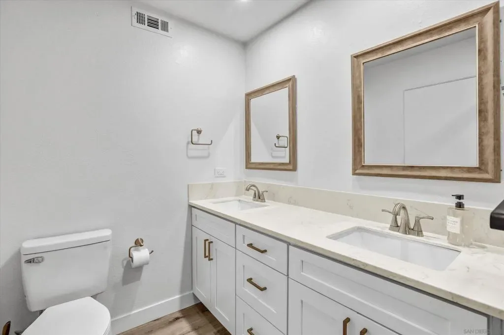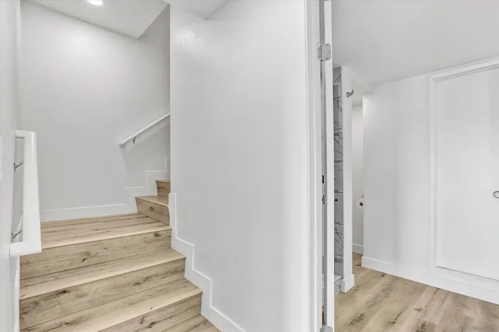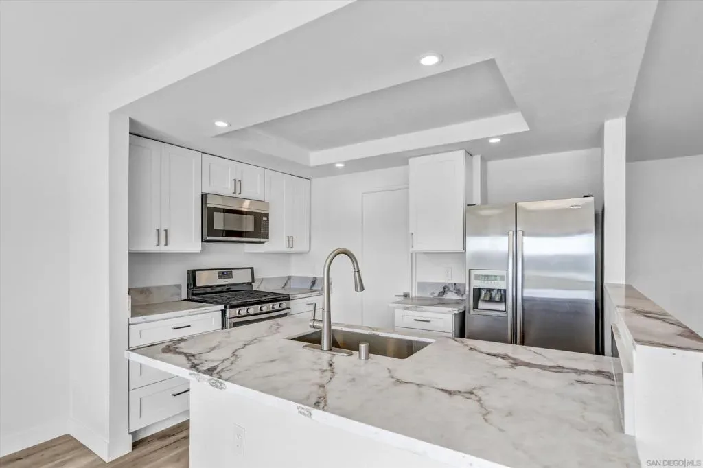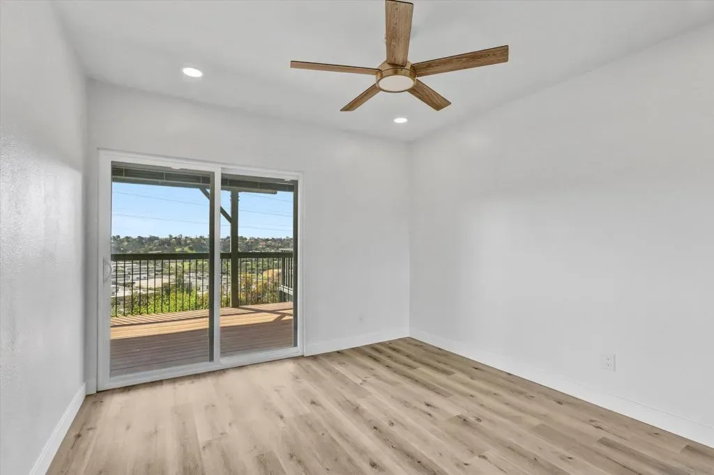 Beautiful view overlooking Fashion Valley. From your balcony you can enjoy stunning views of the mountains and lush greenery, and even from the kitchen you can see the beautiful mountains. The home features spacious balconies on both levels, including the upper level and the bedroom level, perfect for relaxing and enjoying the scenery. One bedroom is conveniently located at the main entrance level with its own private door, and downstairs there are two additional bedrooms, each with its own private bathroom, offering comfort and privacy. Recently remodeled, this property is located in a community that offers tennis courts, a swimming pool, and a jacuzzi. The location is very central, with several freeways just a few blocks away, making commuting easy. The complex is ideal for enjoying peaceful walks, and the home is filled with natural light, with windows that include built-in blinds.