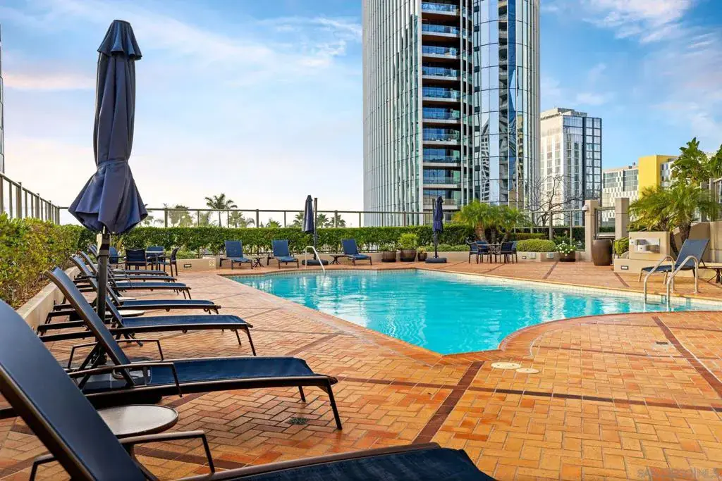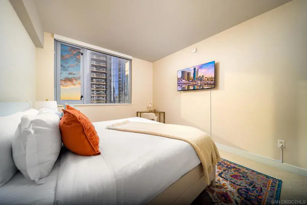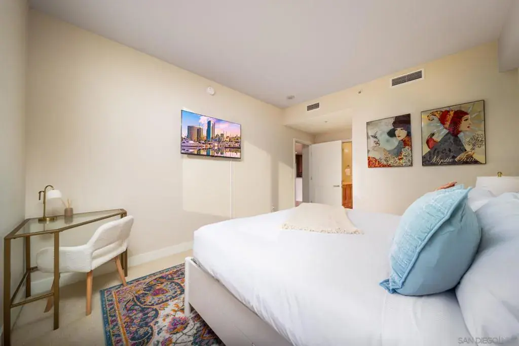 MID- & LONG-TERM FURNISHED RENTAL – Electra Building 2BR with Views, Pool, Sauna & Spa Enjoy an elevated extended stay in the iconic Electra, San Diego’s tallest residential tower, offering full-service amenities and custom elegant decor throughout. This beautifully appointed two-bedroom residence features sweeping bay and water views and a prime location just steps from the waterfront, Little Italy, and downtown dining and entertainment. The light-filled open living area flows seamlessly into a fully stocked kitchen, creating a comfortable space to cook, dine, and unwind while enjoying the views. Sliding glass doors open to a private balcony with lounge seating, ideal for morning coffee or evening relaxation. The primary bedroom serves as a serene retreat with a walk-in closet, en-suite full bathroom with soaking tub, dedicated work desk, and smart TV. The second bedroom offers flexible accommodations with one double bed and one twin bed, making it well suited for guests, family members, or shared mid-term living. In-unit washer and dryer provide everyday convenience. Residents enjoy Electra’s exceptional amenities including a lap pool, jacuzzi, fitness center, sauna, BBQ area, and beautifully landscaped grounds that feel like a private urban oasis. One assigned parking space with EV charging at the stall is included. Ideal for professionals, relocations, or extended stays seeking comfort, convenience, and downtown sophistication. Sleeping setup accommodates up to five guests. Rates vary by season and length of stay. lectra by Bosa Development has created a landmark and set a new standard for luxury living in Southern California. This iconic building will be treasured for generations with historic detailing preserved by Bosa to create a world class residential tower. Be amazed at the transformation of historical 1928 SDG&E ‘Station B’ into an unrivaled living experience. Upon entering you will be engaged by the grand porte-cochere & Electra’s stunning lobby. Incredible millwork and stone detailing reserved for only the finest boutique hotels abound. The intricate glass dome is the crowning glory of the 7-story ‘Conservatory’, perfect for stargazing. Hand wrapped books complete the luxury decor of the stunning library. Enjoy soft music from the grand piano, sophisticated furnishings, art, and the stunning Art Deco detail of the early 20th century columns and arches, painstakingly restored by Bosa’s craftsman. Electra is much more than San Diego’s ‘Tallest Residential Tower’; it is a historic treasure that can not be duplicated at any price. Electra services and amenities include: concierge, parking attendant (self parking), spa, steam, sunny outdoor pool, fitness center,