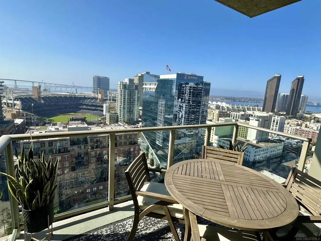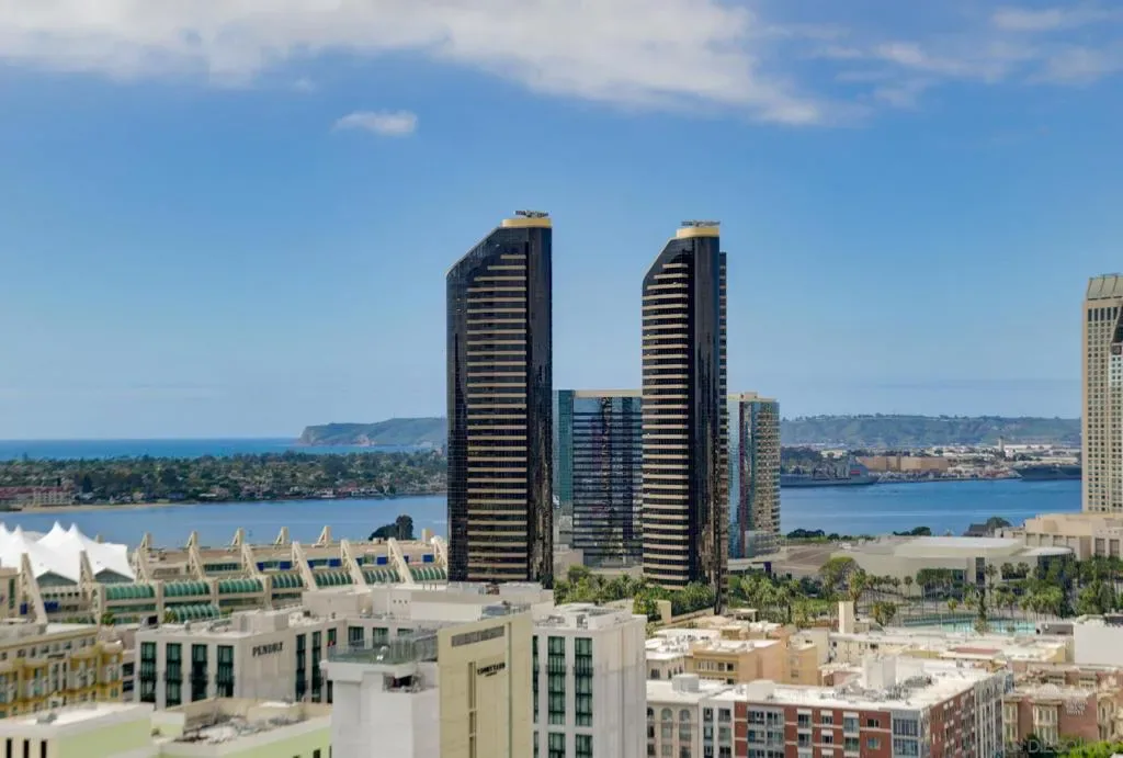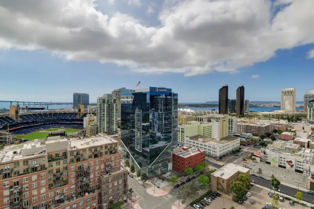 Experience extraordinary panoramic views from this exceptional residence, offering sweeping vistas of Petco Park, Coronado, the Bay, Point Loma and Ocean placing San Diego’s iconic skyline at center stage. Two private balconies provide the perfect setting to enjoy sunrise coffee or evening sunsets framed by the city lights or enjoy watching baseball at Petco Park and live shows at Gallagher Square. Designer upgrades incl. brand new $30K luxury laminate wide plank floors, motorized shades, renovated bathrooms & a beautifully renovated Chef’s kitchen with sleek cabinetry, stainless steel appliances & a contemporary backsplash. New microwave & dishwasher. The open-concept design seamlessly connects the living, dining & kitchen spaces, for entertaining & everyday living with option to easily convert dining space into a second bedroom where closet has been thoughtfully installed already. Primary suite with balcony access, blackout motorized shades & spacious walk-in closet. Two secured parking spaces & storage unit add convenience and peace of mind, while resort-style amenities—including a lap pool, spa, fitness center, full kitchen, fire pits and pizza oven. Multiple lounge areas and four dedicated barbecue stations. Ideally located with immediate access to the vibrant Gaslamp Quarter, Little Italy dining scene, The Rady Shell waterfront concert & event venue and this residence also places baseball enthusiasts moments from the action at Petco Park. A rare opportunity to own a view-driven urban retreat combining modern sophistication with premier lifestyle access. Rising 33 stories above the vibrant East Village, The Mark defines sophisticated urban living in downtown San Diego. Surrounded by acclaimed dining, cafés, entertainment venues, shopping, and major sporting events, residents enjoy an unmatched walkable lifestyle just minutes from the bay. The building’s striking glass-and-metal architecture is complemented by 11 distinctive brick townhomes, creating a bold yet refined presence. There is an expansive outdoor retreat featuring a lap pool and spa, fully furnished terrace with outdoor kitchen, fire pits, pizza oven, multiple lounge areas, four barbecue stations, and outdoor showers with private restrooms. Additional amenities include a state of the art fitness center and conference room with Wi-Fi. It It has a private loading dock, and service elevator ensuring convenience for extra large pieces of furniture. All offered with remarkably low HOA fees—an exceptional opportunity for luxury downtown living.