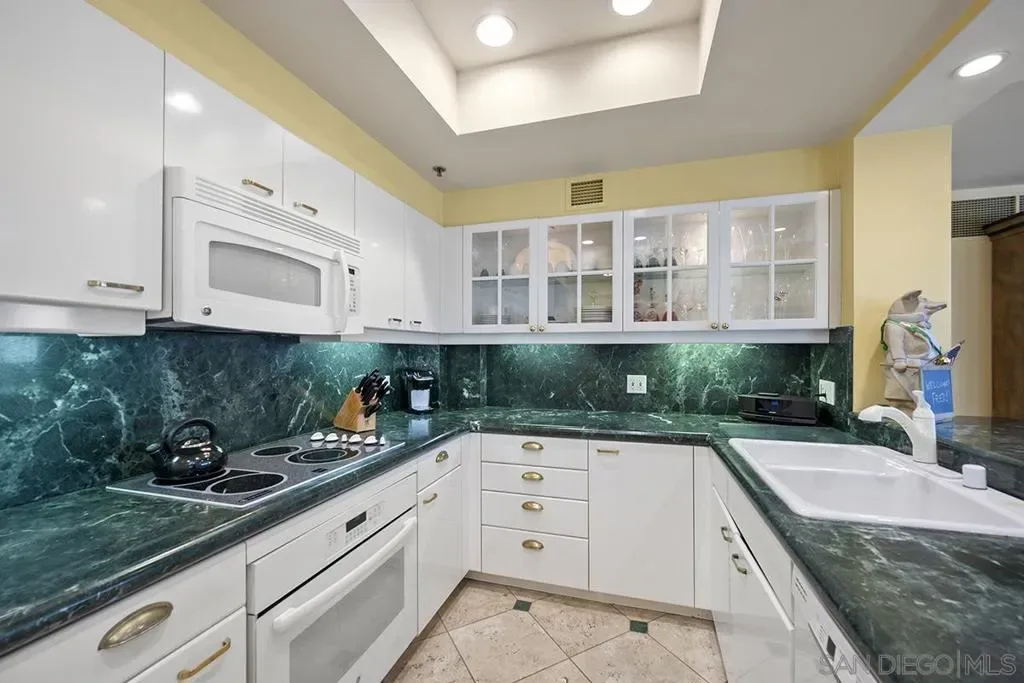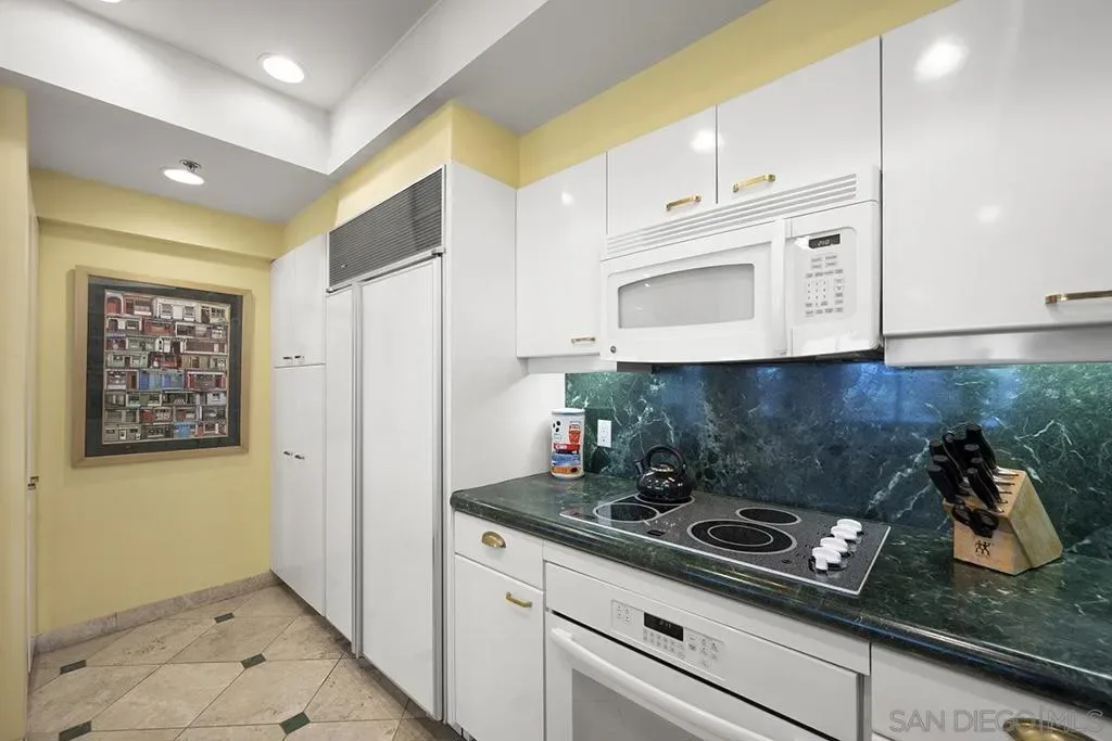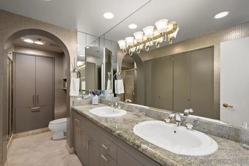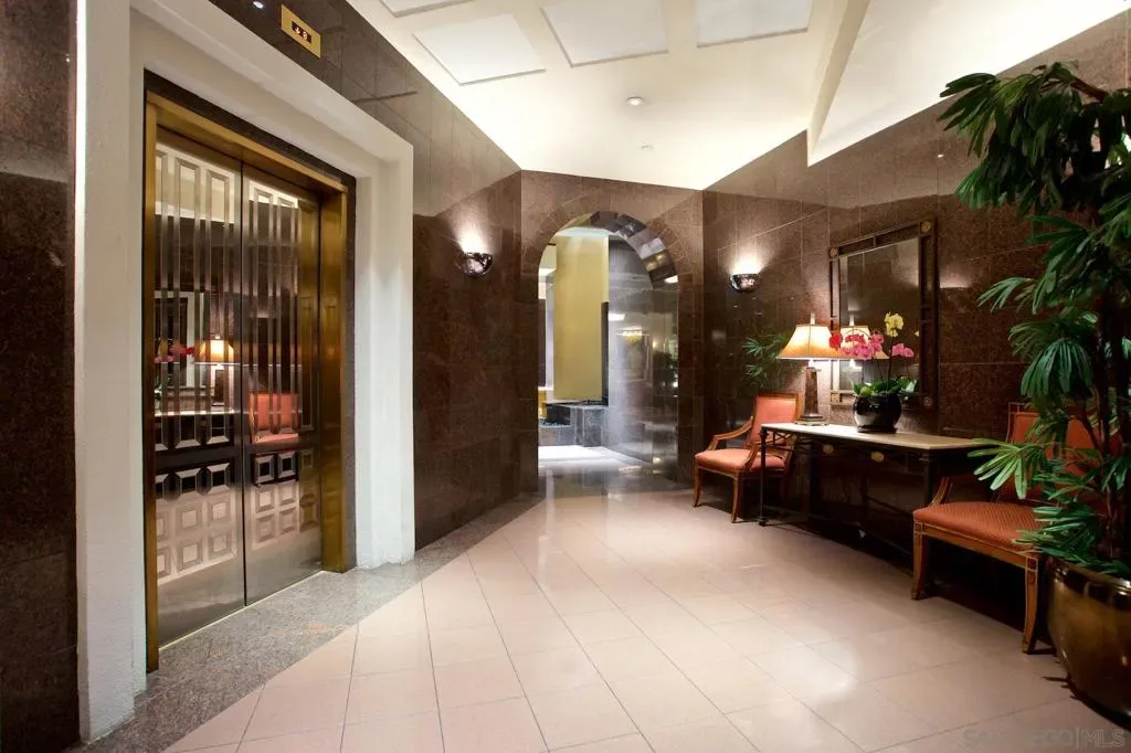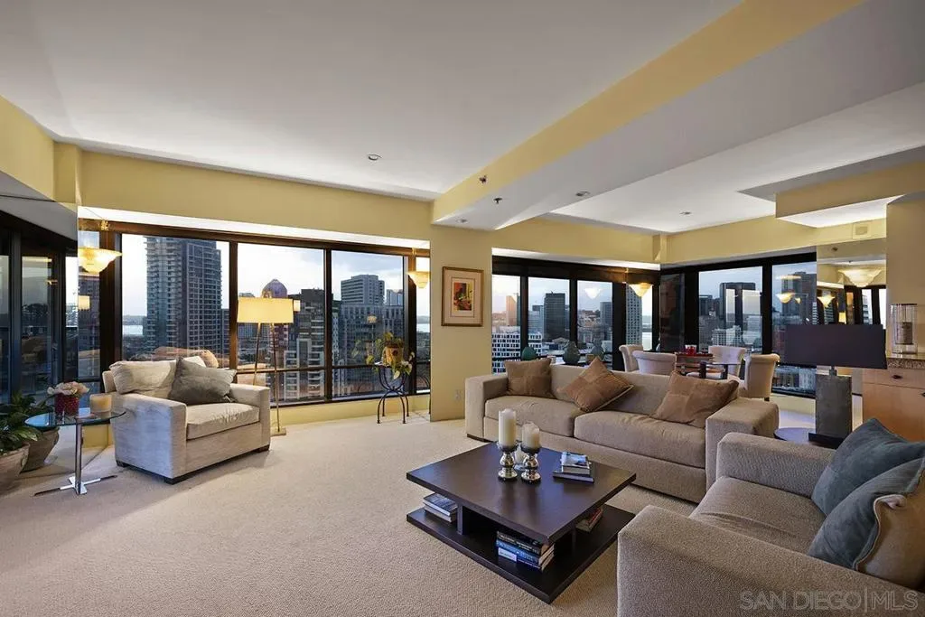 This Harbor Club residence offers breathtaking views of San Diego Bay and the cityscape. The private balcony and numerous windows provide an unparalleled vantage point to take in the blue water panoramas and stunning sunsets. Inside, the living room is elegant with plush carpeted floors, Alabaster wall sconces, mirrored walls, and a built-in cabinet featuring a beverage chiller. The kitchen is well-appointed with granite surfaces, designer backsplash, glass-front cabinets, and a Travertine floor with insert. The primary bedroom suite is spacious with built-in cabinetry, carpeted floors, and a ceiling fan for comfort. The remodeled shower and granite vanity offer a luxurious spa-like experience. The tub has been replaced with a built-in closet, designer wallpaper, and dual medicine cabinets. The second bedroom is currently used as a den with built-in bookshelves and direct access to the balcony, making it an ideal guest room or home office. This stunning property is a must-see and a perfect place to call your own. Residents of the Harbor Club enjoy a wide range of resort-style amenities including 24-hour front desk attendant, fully equipped gym, a beautiful pool deck, club room, library/business center, and so much more. Located in the highly desirable Marina District locale, you are sure to enjoy easy walkability to transportation, excellent restaurants, shopping, the ballpark, Gaslamp Quarter, East Village, and the Embarcadero which is a perfect place for a stroll around the bay. At the foot of Harbor Club, a myriad of retailers just an elevator ride away, including famous Morton’s of Chicago Steakhouse, a salon, and more. Delight in the casual elegance amidst the convenience of sophisticated urban living. Life is good at the Harbor Club!