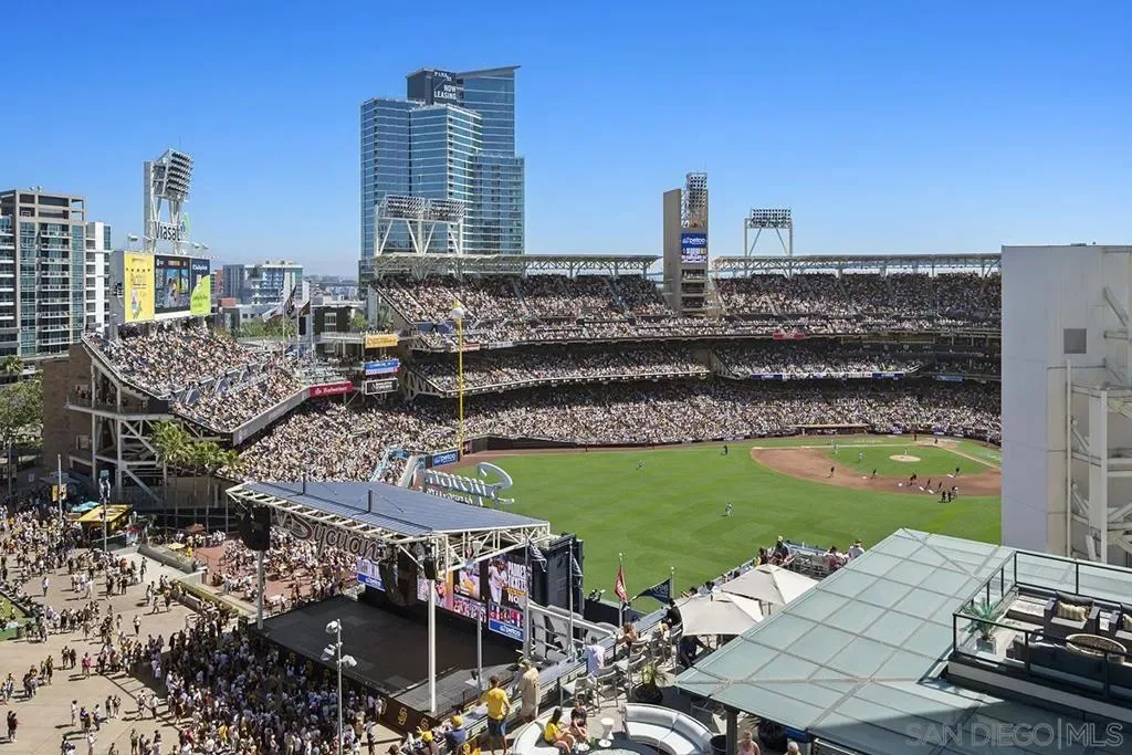This 10th floor 2-bedroom, 2-bath condo at The Legend delivers exactly what the address promises — front-row seats to San Diego’s most iconic neighborhood. The views look directly into Petco Park, meaning baseball games and open-air concerts are as much a part of your living room as your own furniture. The spacious balcony extends that experience outside, and when you want to take it to the next level, the 7th floor deck, ‘Club Legend’ is one of the best amenity spaces in all of Downtown. Inside, the home has been freshly painted and outfitted with newer grey LVT flooring throughout, giving the space a clean, cohesive feel from room to room. Expansive windows bring in generous natural light throughout. The open-concept kitchen features granite counters, stainless appliances including a modern 4-door refrigerator, and a layout that flows easily into the living and dining areas. One of the building’s best parking spaces and a private storage unit just steps from your front door round out the package. See supplement for more details. The gourmet kitchen is a chef’s dream, showcasing top-of-the-line stainless appliances, granite countertops, European-style cabinetry, and an inviting eat-at bar illuminated by elegant pendant lighting. Floor-to-ceiling windows not only flood the condo with natural light but also offer breathtaking, unobstructed views of Petco Park and Gallagher Square. Split-bedroom floor plan perfect for privacy for roommates or guests. The primary bedroom suite doesn’t skimp on views either. The ensuite bathroom features a dual vanity, tasteful custom tile backsplash, and frameless glass-enclosed shower. The Legend is the only residential high-rise to be built inside the gates of our Major League Ballpark & the only residential tower to be built on the 3-acre Park at the Park / Gallagher Square! This iconic building overlooking the Padres ballpark (voted the best ballpark in America) will be treasured for generations with historic detailing preserved by Bosa to create a world-class residential tower. Legend is centrally located just a few blocks from the Gaslamp Quarter & Marina District for convenient access to endless shopping & dining options. Legend’s amenities include a 2nd floor rooftop deck looking out over Park at the Park complete with pool & spa, fully equipped fitness room, roof garden, barbeque area, steam, sauna, and changing rooms. Your guests & clients will love ‘Club Legend’ located on the 7th floor, complete with a huge roof deck overlooking Petco Park and an outdoor fireplace lounge, as well as guest parking spaces, available by reservation through a simple mobile app. The concierge service and, 24-hour security add a sense of belonging while an ambiance of refinement & contemporary sophistication is apparent throughout the building.