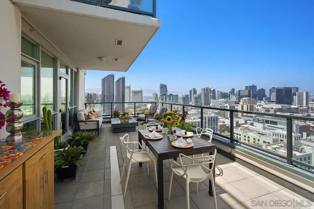The epitome of Downtown living! Footsteps to the convention center, Gaslamp Quarter, restaurants, and Petco Park is realized in this extraordinary northwest corner penthouse residence on the 21st floor of The Legend with a nearly 400 SQ FT ROOFTOP TERRACE! Stunning views span to the bay, ocean, and city skyline. Boasting a highly desirable floor plan with 2 separated bedrooms for enhanced privacy. 2 side-by-side parking spaces plus a motorcycle space (owners have parked 3 cars in the spaces), 1 storage room and 1 storage cage! Complete with recently installed wood floors, upgraded lighting, ceiling fans, pre-wired for surround sound, and a stainless/granite kitchen with Sub-Zero refrigerator, you will love where you live. Quite possibly the best unit in the entire building with the combination of the views and roof deck – enjoy Petco Park events from ‘Club Legend’ but then retreat to the quietest corner of the building for some rest and relaxation! Dynamic views are framed by expansive windows in this fabulous residence at the Legend. An entertainer’s dream, you will love the space and functionality offered in this condo. Delight in a spacious kitchen with stainless steel appliances, granite counters including an eat-at bar, a convenient pantry closet, Sub-Zero refrigerator, and desirable gas range. Retreat to the primary bedroom boasting a generous walk-in closet with custom organizers. The primary en-suite bath features a dual vanity with upgraded granite counters, a walk-in shower, plus a Toto Washlet. Complete with additional storage and 2 side-by-side parking spaces plus a 3rd space for a motorcycle, this is an idyllic Downtown dwelling. The Legend is the only residential high-rise to be built inside the gates of our Major League Ballpark and the only residential tower to be built on the three-acre Park at the Park! This iconic building overlooking the Padres Ballpark will be treasured for generations with historic detailing preserved by Bosa to create a world-class residential tower. Enjoy a premium central location only steps away from the Gaslamp Quarter and Marina District for convenient access to endless shopping and dining options. The Legend’s amenities include a second-floor rooftop deck looking out over Park at the Park complete with pool and spa, a fully-equipped fitness room, rooftop garden, barbecue area, steam, sauna and changing rooms. Your guests and clients will also love ‘Club Legend’ located on the seventh floor, complete with a huge deck overlooking the ballpark and an outdoor fireplace lounge. An elegant courtyard entrance, creating a private enclave approaching the lobby provides a fitting and impressive sense of arrival for residents and their guests. The concierge service and 24-hour security add a sense of belonging while an ambiance of refinement and contemporary sophistication is apparent throughout the building.Builder’s brochure indicated 1587 sqft, assessor’s record indicates 1439 sqft.