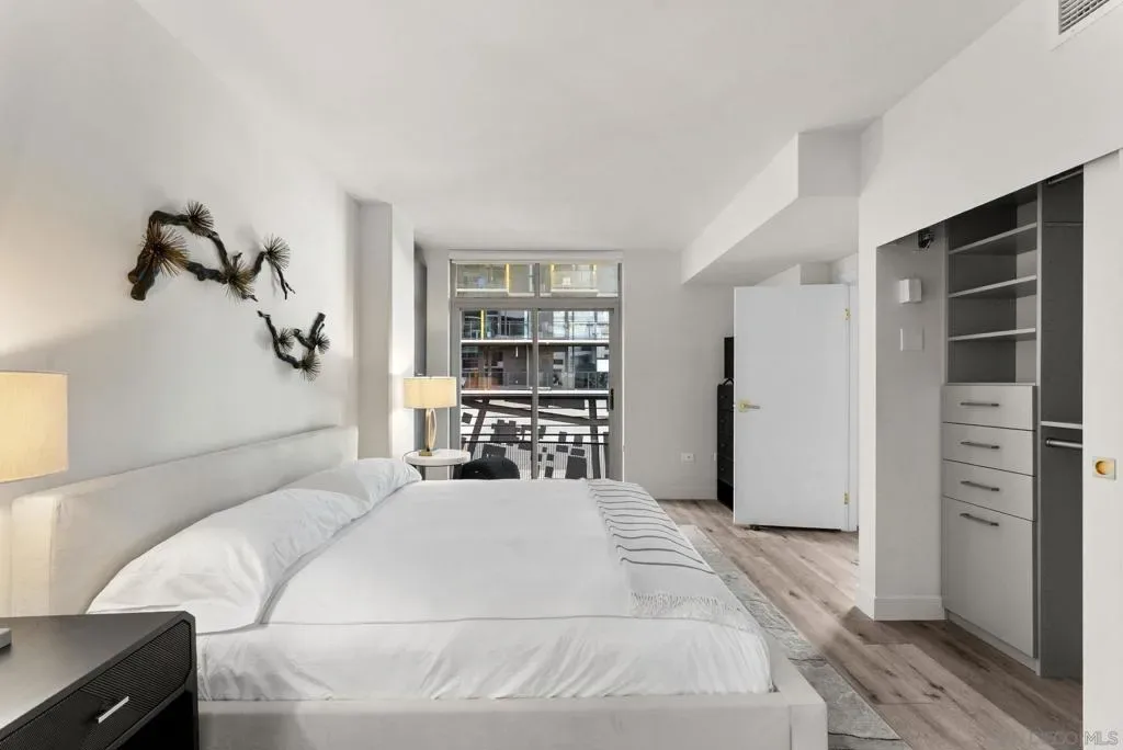 Fully Renovated Little Italy Condo with Designer Finishes, Strong Rental Potential & Resort-Style Amenities. Live in the heart of vibrant Little Italy steps to the famous Farmers Market, transit, 100+ restaurants and more in this completely renovated, light-filled condo that blends modern design with effortless urban living. Every detail has been thoughtfully upgraded—from the sleek quartz kitchen with new stainless steel appliances to the warm, durable luxury vinyl plank flooring throughout. Floor to ceiling windows let in the San Diego sunshine. Charming Juliet balcony invites in fresh coastal air just blocks from the bay. The oversized bedroom is a true retreat, featuring a custom Home Decorators Collection closet system for elevated storage and style. The spa-inspired bathroom offers a walk-in shower, modern vanity, and anti-fog LED mirror—creating a clean, sophisticated feel. Enjoy everyday convenience with in-unit Asko laundry and move-in-ready condition—no projects, no upgrades needed. 1 parking space included, additional parking available to rent. HOA has pool, hot tub, Amazon lockers, fire pits, Cabanas, grills, fitness center, 24/7 on site staff, and so much more! VA & FHA approved. Condo has cash flow investment potential & is ideal for bonus depreciation.