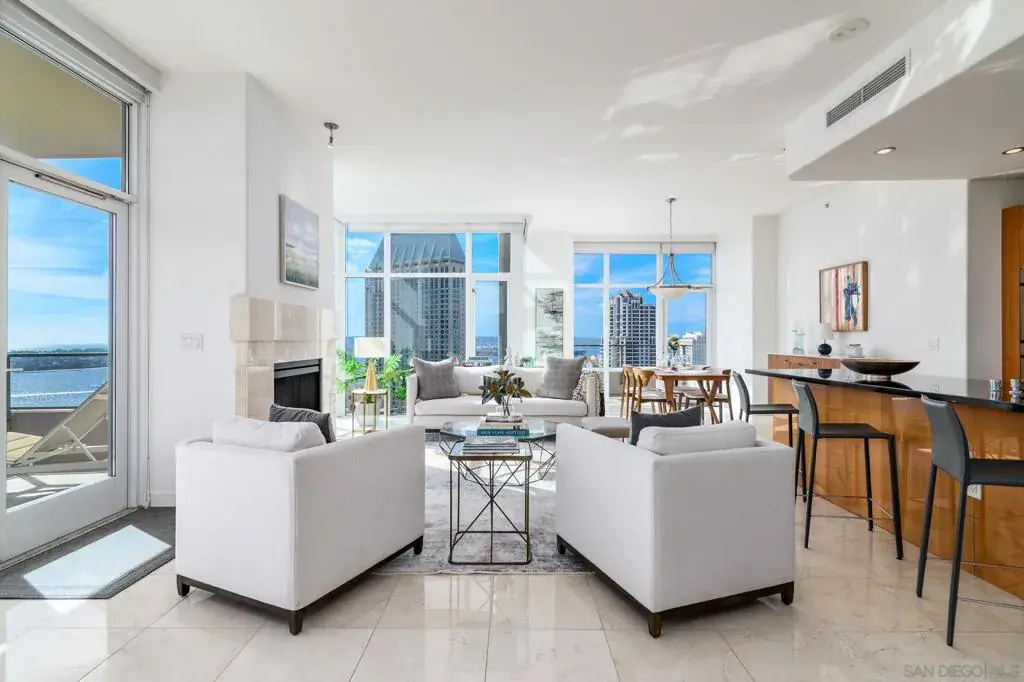 Located on the SW corner of the prestigious Executive 18th floor, this premier 2-bed, 2.5-bath residence at The Pinnacle Marina Tower showcases breathtaking sit-down views spanning the San Diego Bay and Pacific Ocean. Expansive 10+ foot ceilings, elegant marble floors, and dramatic floor-to-ceiling windows flood the open-concept interior with natural light, perfectly framing the ever-changing coastal panorama. The chef’s kitchen features Sub-Zero and Bosch appliances, sleek Snaidero Italian cabinetry, wine cooler, and refined finishes throughout. Two private balconies offer ideal vantage points for spectacular views of the ocean and city- perfect for morning coffee at sunrise and evening sunsets. The combination of floor plan, elevation, and southwest orientation is among the most desirable in all Downtown San Diego—and rarely becomes available. Situated in the heart of the Marina District, The Pinnacle delivers an unmatched urban coastal lifestyle surrounded by San Diego’s most iconic destinations. Just moments away are Waterfront Park, Seaport Village, The Headquarters at Seaport, and the Rady Shell at Jacobs Park—home to world-class performances by the San Diego Symphony. Nearby you will also find The Gaslamp Quarter, Little Italy, and Petco Park – perfect for dining, shopping, nightlife, and entertainment. Residents enjoy a full suite of resort-style amenities including 24-hour concierge and security, a state-of-the-art fitness center with steam room and sauna, heated Olympic-style pool and jacuzzi, guest suite, social lounge, conference room, and an outdoor BBQ area. Complete with two secured parking spaces and additional storage, this exceptional residence offers a rare blend of luxury, convenience, and refined Downtown sophistication.