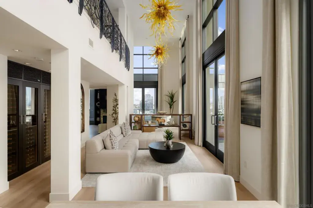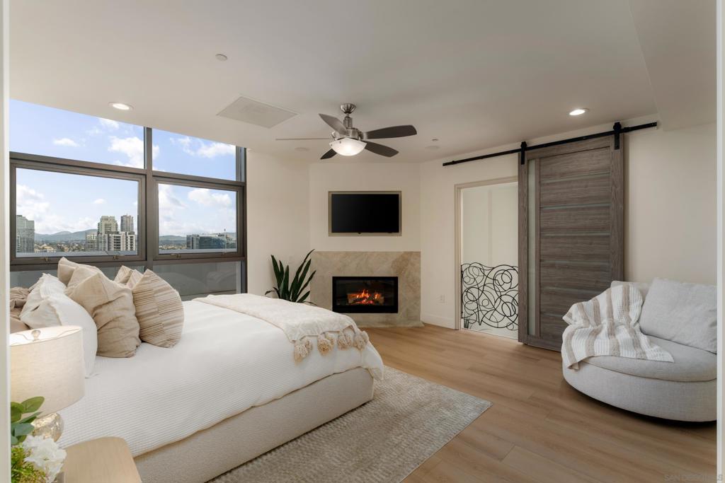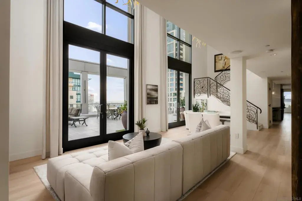 Welcome to Renaissance Penthouse Residence 2204, a recently renovated, top-floor, two-story home occupying the entire southern half of the building with over 2,400 sq. ft of private outdoor living space. This rare residence offers sweeping views with mountains to the east, Downtown and Coronado to the south, and expansive bay and ocean views to the west. Recent renovations include wide plank luxury vinyl flooring throughout the main living areas, plush new carpeting in the primary suite and office, smooth-finished walls, fresh paint, custom drapery, upgraded hardware, and a redesigned powder room. The home features multiple living and entertaining spaces, including formal living and dining areas, a family room with an Onyx stone wet bar and fireplace, a private office, and a 6-zone Sonos sound system. There is also the option to install an elevator. The primary suite offers a massive walk-in closet, a dedicated vanity area, and a spacious two-person shower. The kitchen is finished with Taj Mahal quartzite countertops and full-height backsplashes, a Wolf gas range, dual Sub-Zero frig/freezers, 2 sinks, and 2 dishwashers. Additional highlights include custom railings by artist Linda Joanoue, 3 hand-blown, Chihuly-inspired glass chandeliers, and a temperature-controlled 300+ bottle wine refrigerator. Designed for entertaining, this home can comfortably host over 150 guests. Offered with 3 parking spaces and 3 large storage lockers, this penthouse presents a rare opportunity to own a one-of-a-kind residence in the heart of Downtown.