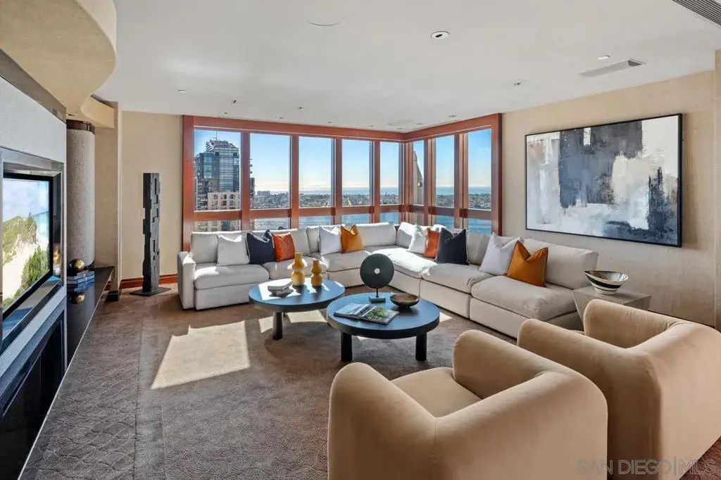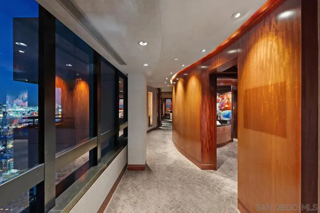 One Of A Kind. Penthouse 2701 stands as a unique testament to architectural brilliance, nestled in the dynamic core of downtown San Diego. Transformed and meticulously maintained, this residence boasts nearly 3,400 square feet of artfully crafted living space. It offers unobstructed vistas of the ocean, city, bay, and mountains. Designed to provide serene seclusion while showcasing art, light, and volume, the home gracefully unfolds through expansive open areas, sculptural forms, and fluid indoor-outdoor transitions that captivate from dawn to dusk. Positioned at the very top, this exceptional penthouse is a rare offering of scale, privacy, and prestige. Meticulously curated, with panoramic views spanning downtown San Diego, the waterfront, coastline, and ocean. A formal gallery-style entry sets the tone, leading to expansive living and dining areas framed by floor-to-ceiling windows, automated custom blinds, and wraparound terraces. The exhibition kitchen is a showpiece, featuring custom book-matched Cuban mahogany cabinetry, single-slab granite counters, premium appliances including Sub-Zero and Gaggenau, an eat-at island, integrated workspace, and balcony access. Entertaining is seamless with a theater-style media wall, central audio-visual system, specialty lighting for artwork, and designer wall treatments throughout. The primary suite is a private retreat with upholstered walls, wool carpeting, stunning views, dual custom dressing rooms, and a spa-inspired bath with steam shower, jetted tub, and bespoke finishes. A second bedroom/office suite offers custom cabinetry, built-in desk, morning bar, and ensuite bath. Additional highlights include two balconies, 12’6” custom ceilings, sound-enhanced construction, motorized shades with UV-protective glass treatments, and two parking spaces. Renowned for its cutting-edge technology and forward-thinking design, this penthouse offers enduring appeal and timeless style. Truly an irreplaceable opportunity, tailored for those who cherish space, perspective, and distinction above all else. The Meridian offers unparalleled amenities: 24-hour concierge and 24-hour valet parking, 2 state-of-the-art fitness centers with sauna and steam room, and a resort-style deck with heated pool and spa, cabanas, lounging area with firepit, outdoor grills, and lush gardens. Designed for both elegance and privacy, this iconic building delivers a lifestyle of ease, beauty, and cultural connection—just steps from San Diego’s finest dining, arts, and waterfront experiences.