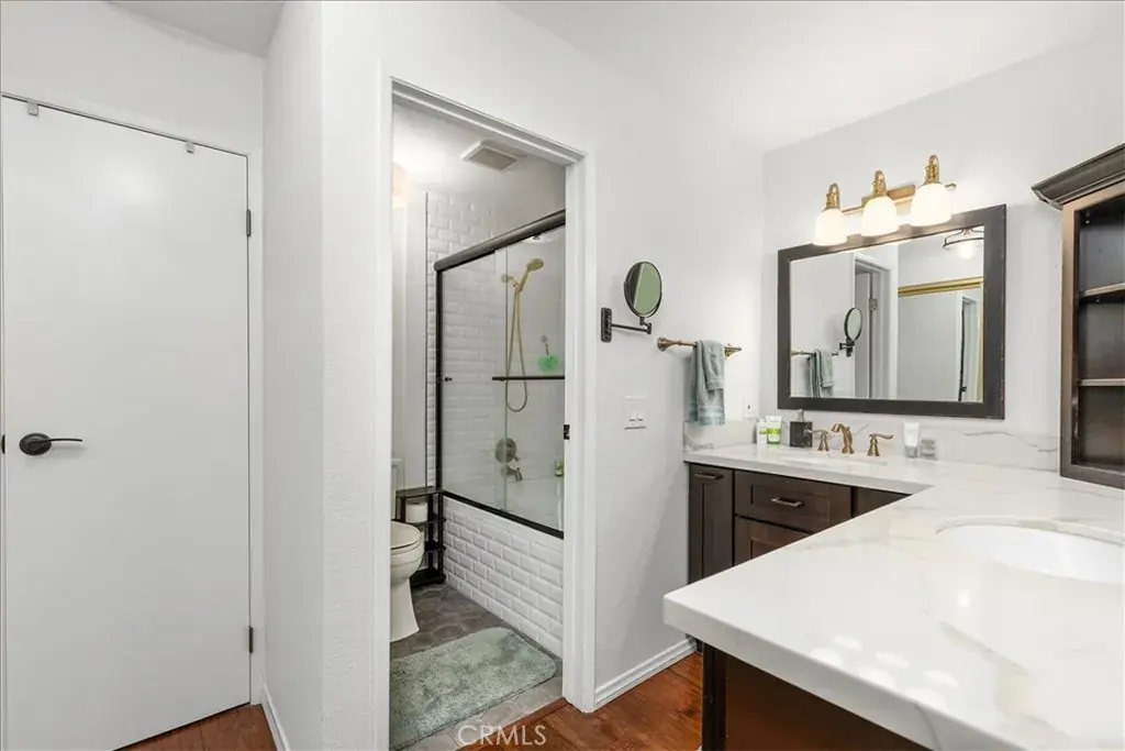 The bedrooms are of good size and have natural daytime light as well. The primary bedroom has two closet spaces and extra storage. The bathrooms have been nicely remodeled in the past with quartz countertops, tiled showers, fixtures, and tiled floors in the wet areas. There are laminate wood floors throughout, central AC and heat, an indoor laundry area, and hallway storage. There is secured underground tandem parking with storage that you can access by stairs or elevator, and permitted guest parking behind the building. There is no unit below, and unit is elevated above ground level with landscaping for privacy. The complex is well kept with a front and back gated entrance and a nice courtyard.