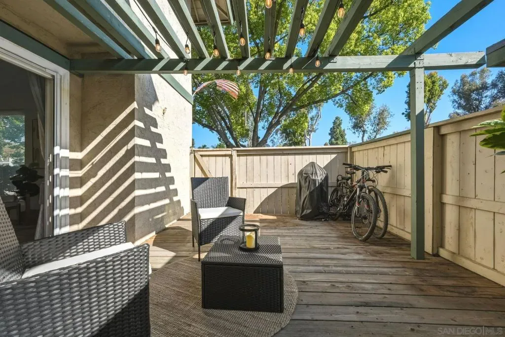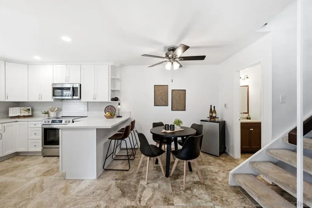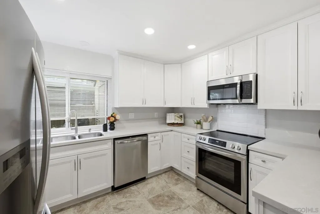 Remodeled and expanded kitchen in November 2025; sellers spent $30K! Cupboards, appliances, fixtures, paint, quartz counters, new shaker-style cabinets, backsplash, lighting flooring. Opened up the space and expanded the breakfast bar into the dining nook. Bright, open and spacious! Bathooms remodeled in November 2025. Dual vanity, shower-in-tub. Oversized bedrooms. All bedrooms are upstairs. Vinyl slider and windows. Private fenced patio – perfect for relaxation and entertaining! Laundry room off the patio, two dedicated parking spots. Two pools and spas, water is included in HOA fee. VA and FHA spot approval available, too! Superb accessibility for all that the I-15 corridor offers: Miramar Lake, multiple restaurants and movie theater, shopping, Miramar College, Hourglass Community Park, Aquatic Center, Home Depot , Arc & Kin Coffee Shop. Easy freeway access and close to get onto MCAS Miramar to beaches to downtown for sports and concerts. Welcome to Mira Mesa!