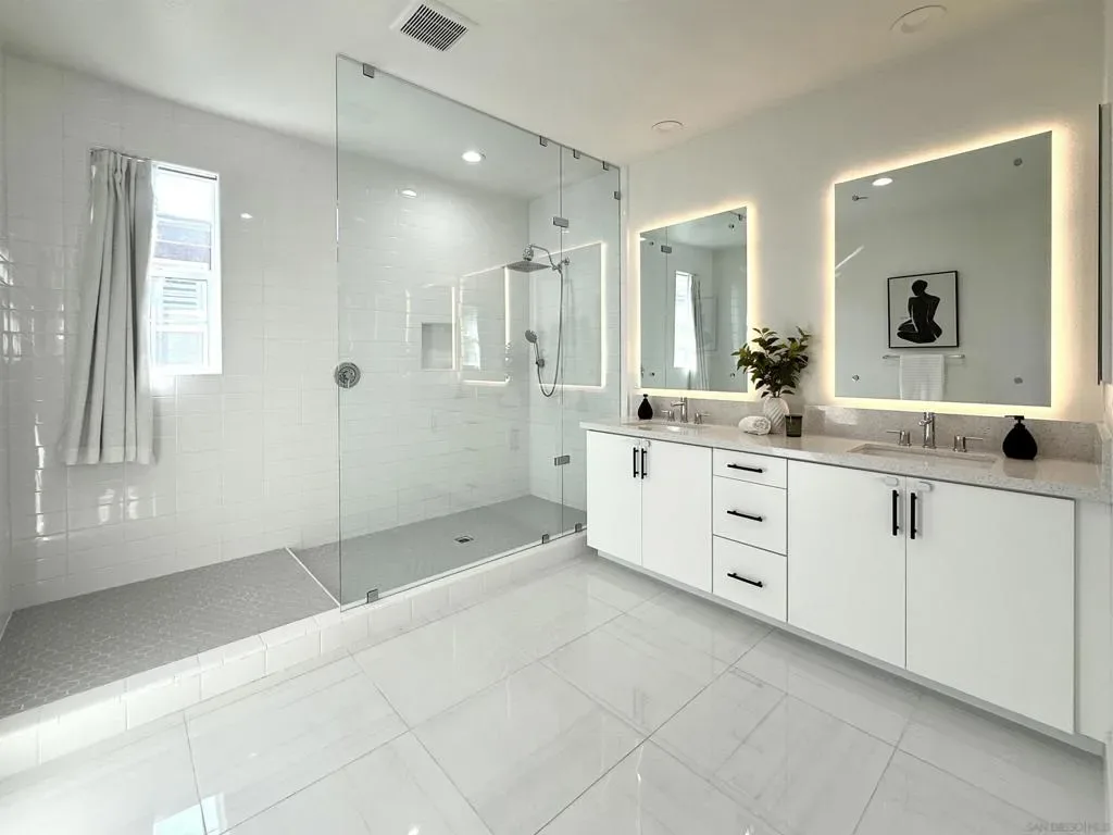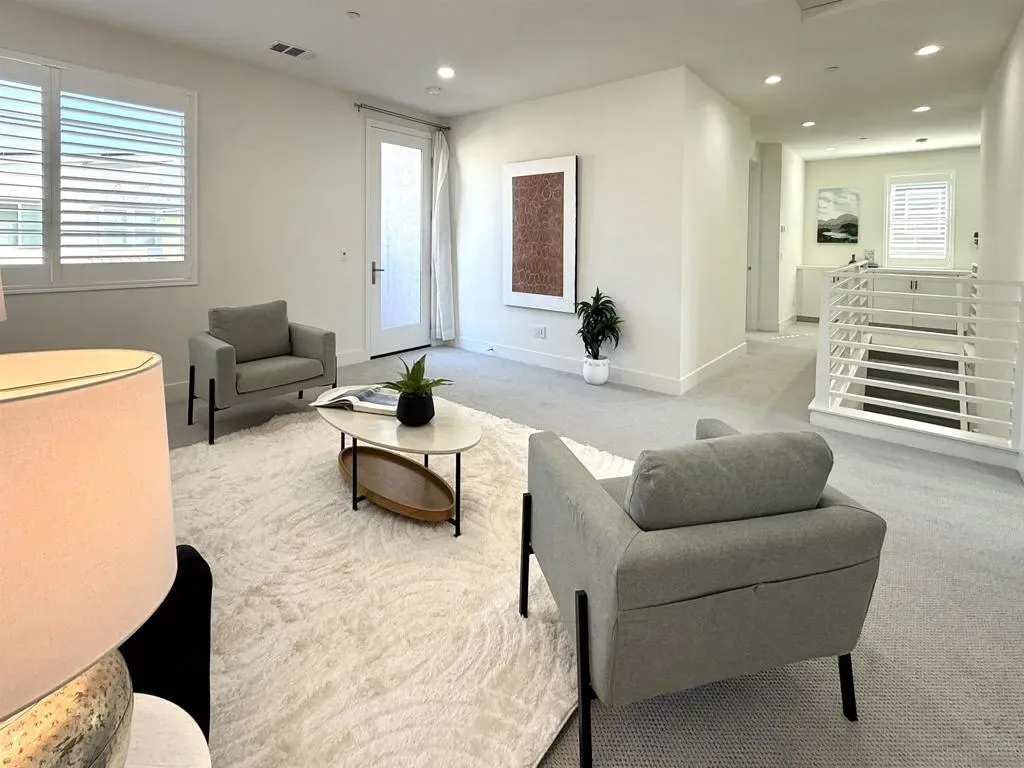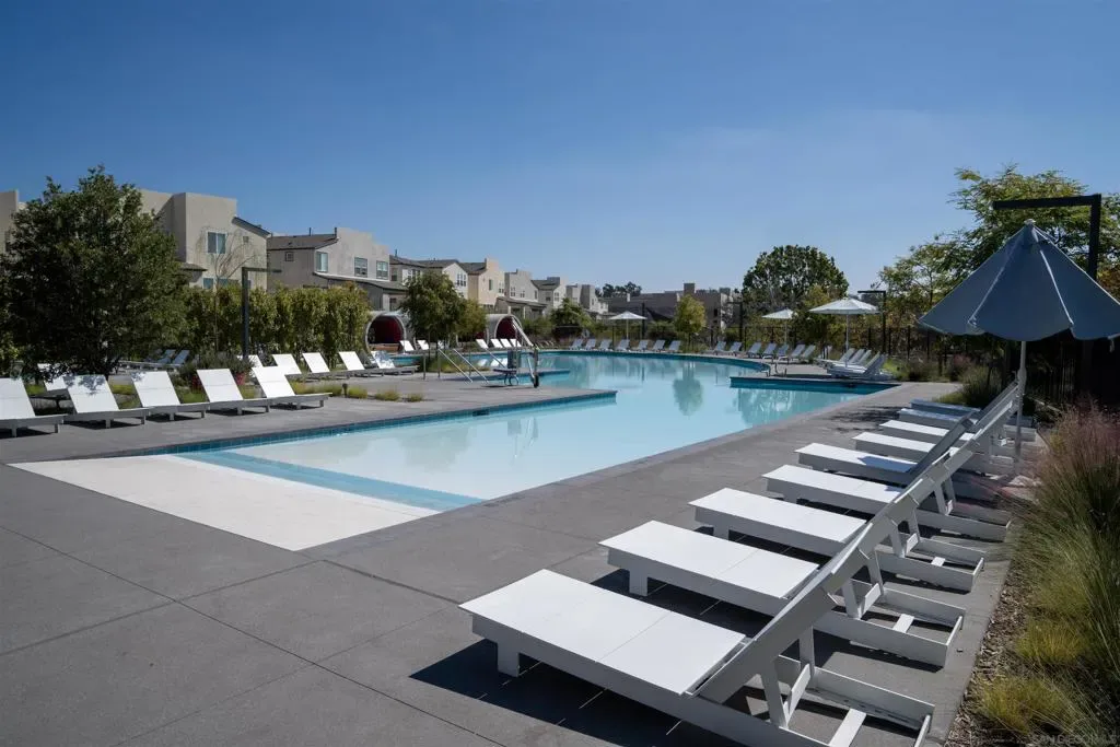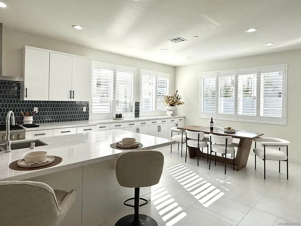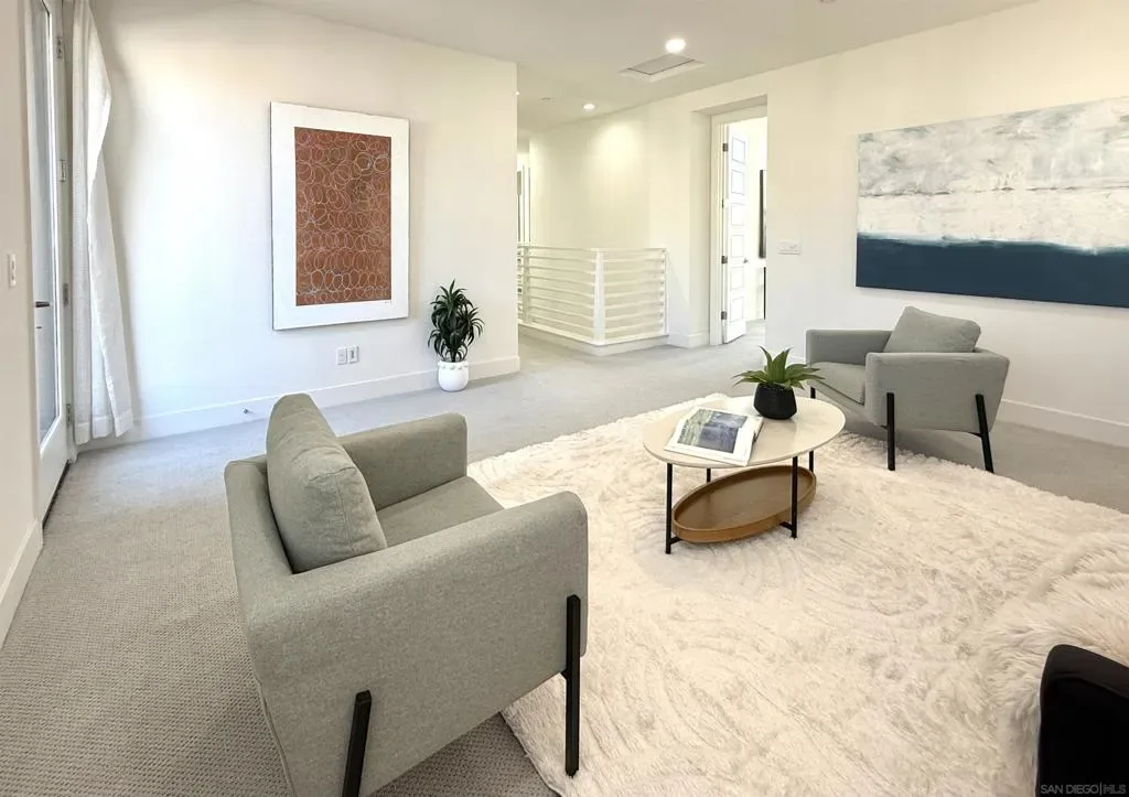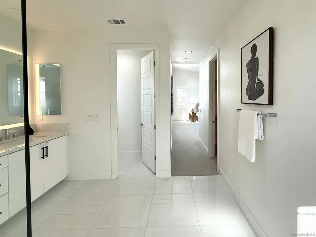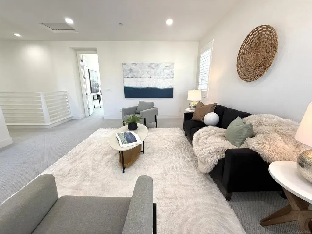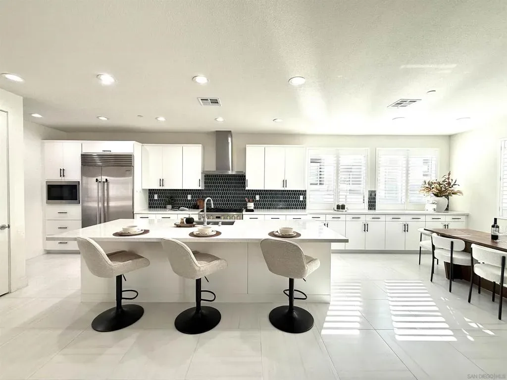 Welcome to the highly sought-after 3Roots master-planned community in Sorrento Mesa. The open-concept main living areas are filled with natural light and finished with oversized, contemporary tile flooring, creating a clean, seamless look throughout the living room, kitchen, dining area, and bathrooms. The chef’s kitchen features quartz countertops, an expansive island, upgraded backsplash, GE Monogram Wi-Fi enabled appliances, 6-burner gas range, Sub-Zero refrigerator, smart faucet, and a spacious walk-in pantry. The living room opens through collapsible glass doors to an upgraded California Room with fireplace, finished with premium, slip-resistant tile flooring that extends into the beautifully designed backyard. The backyard offers a resort-style setting with coordinated large-format tile, built-in concrete bench with designer tile accents, antimicrobial turf, solar-powered fence lighting, multicolor LED accent lighting, outdoor water access, and power for an outdoor television—ideal for year-round entertaining. The front entry is enhanced with elegant large-format tilework, complemented by professionally installed live landscaping and a Wi-Fi controlled irrigation system, creating a polished and low-maintenance arrival experience. The primary suite features a spa-inspired bathroom with upgraded tile finishes and a custom walk-in closet. Additional highlights include a loft with balcony, window shutters throughout, smart lighting and thermostats, HEPA air filtration, whole-home water filtration, EV-ready garage, and a fully paid solar system. Residents enjoy access to resort-style pools, fitness center, clubhouse, parks, and miles of scenic trails. Centrally located near shopping, dining, beaches, and major tech and biotech employers.