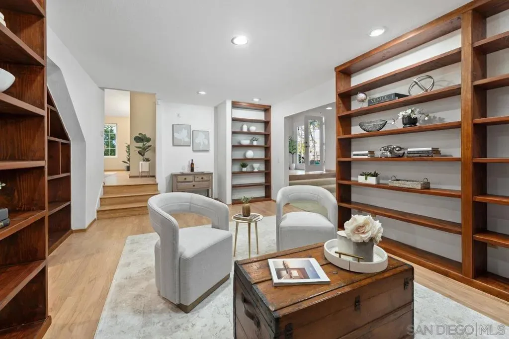 Situated on a nearly ¼-acre flat cul-de-sac lot backing to a private canyon with serene, park-like views, this home offers a beautifully landscaped, resort-style backyard with artificial turf, mature fruit trees, and an expansive Trex deck (2020) ideal for outdoor living and entertaining. Inside, the open floor plan features formal living and dining rooms with oak hardwood flooring, a separate library/den with gas fireplace, and an expanded great room with wood-burning fireplace, built-in entertainment center, surround sound, and window seating. The chef’s kitchen includes top-of-the-line appliances, Taj Mahal quartz countertops, custom cabinetry with roll-out drawers, new wood flooring (2024), a breakfast nook, and French doors to the backyard. A downstairs bedroom (currently an office) with custom built-ins is adjacent to a spa-inspired bath. Upstairs offers fresh carpet and paint, a spacious primary suite with dual closets and additional storage, an upgraded bath, and two secondary bedrooms. Additional highlights include owned solar, major system updates, and a 2-car garage with built-ins. Conveniently located near Sorrento Valley, UCSD, beaches, freeways, shopping, and dining.