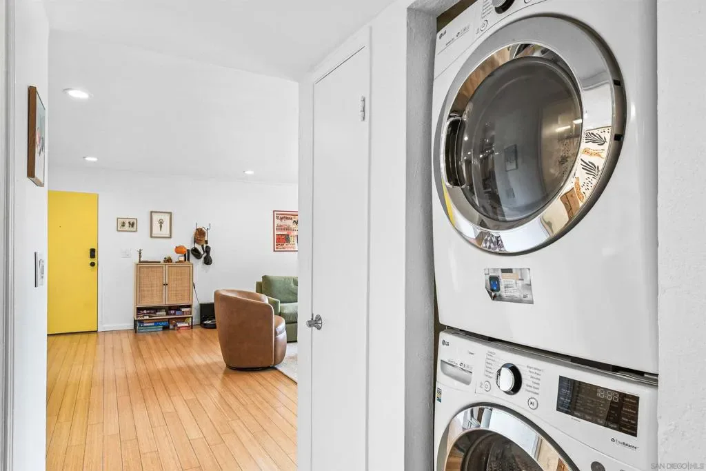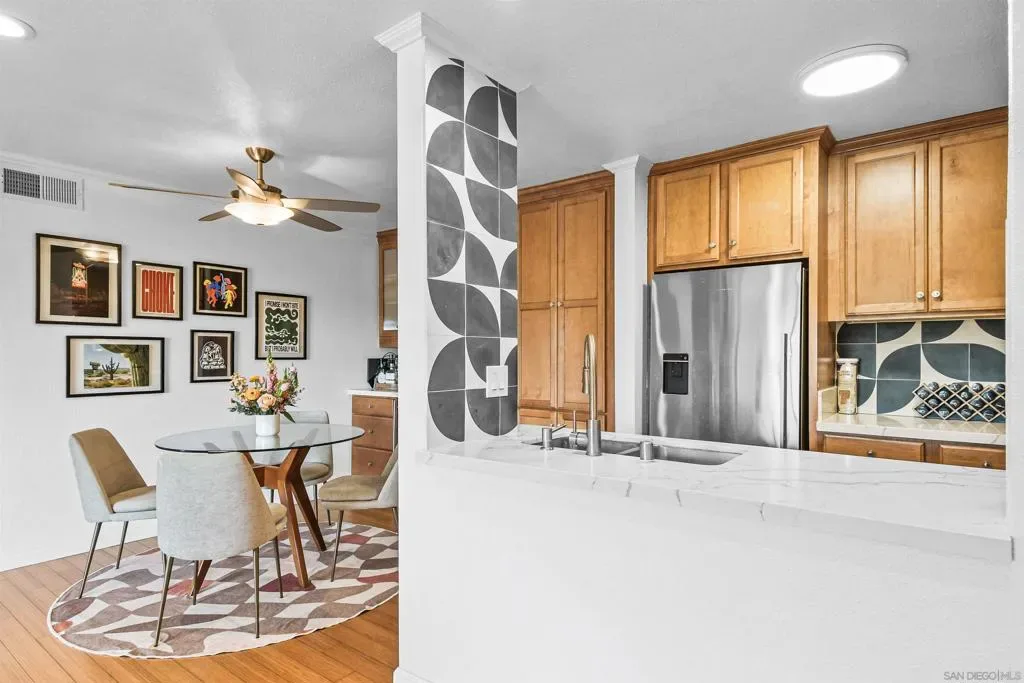 Location, location, location – Mission Hills! Walk across the street to grocery shopping and just a few blocks away from the heart of Mission Hills and Hillcrest and their plentiful neighborhood eateries! An open floor plan in this tucked away corner unit, has southern exposure that provides warm, natural light during the winter and softer, indirect light in the summer. The updated kitchen opens to the spacious living room with sliding doors to a 15′ long balcony facing tree top neighborhood vistas. Wood cabinetry, quartz countertops, SS appliances, encaustic cement backsplash tiles, pantry cabinet w/ pullout drawers, and an envy-inducing dry bar with wine refrigerator all make entertaining, well, entertaining! Bamboo flooring throughout the main living areas and both bedrooms, and gem-colored encaustic cement tiles in both tastefully updated bathrooms. Mission Crest Gardens offers a pool, sauna, and modest recreation and fitness rooms. In unit laundry, central heat and AC, fiber internet accessibility, 2 parking spaces (1 carport assigned and 1 unassigned) and a storage cage round out the amenities! Move-in ready and an outstanding value in Mission Hills!!