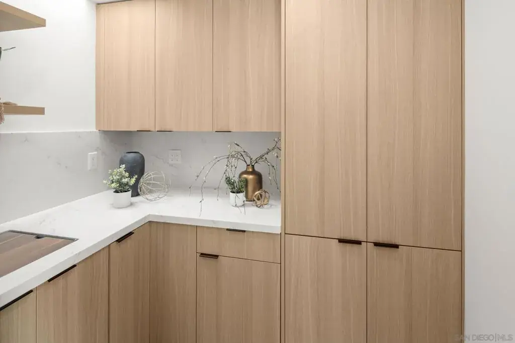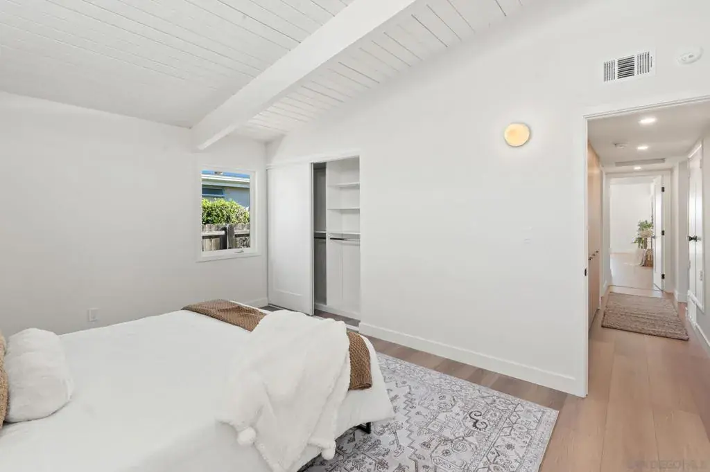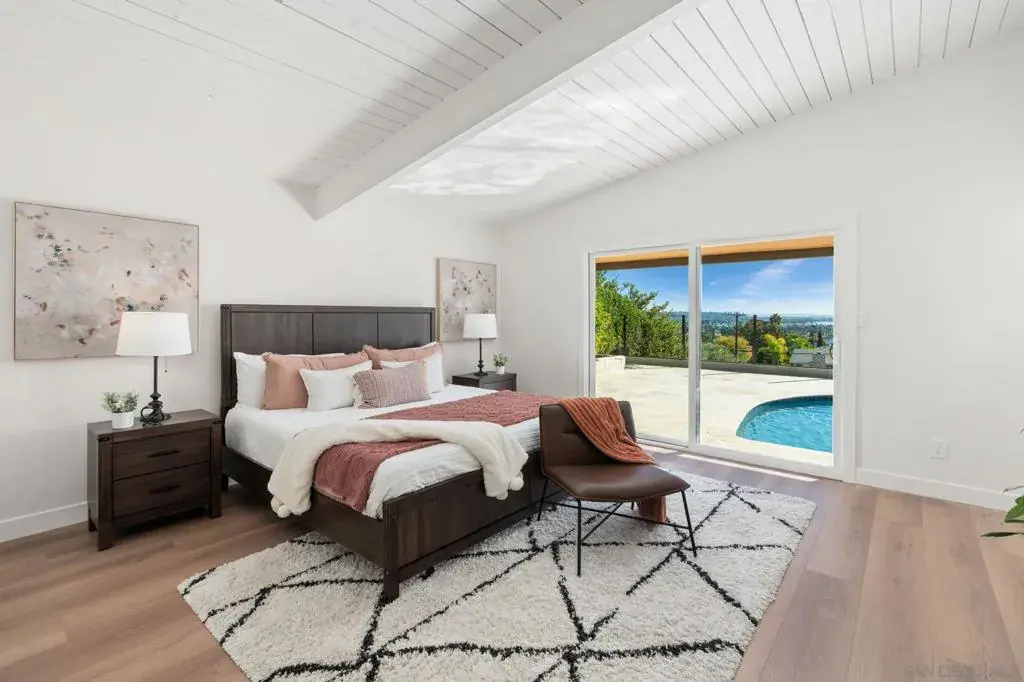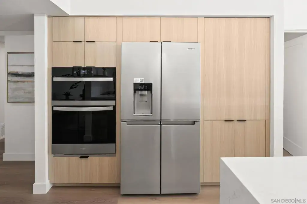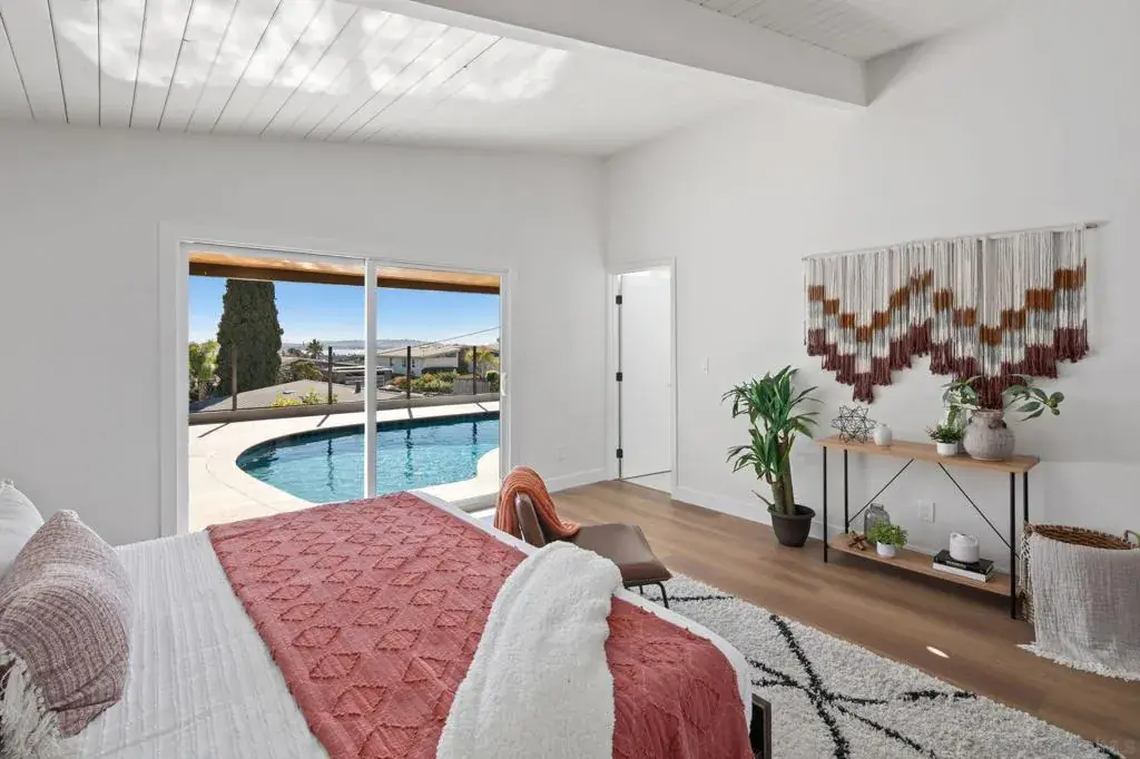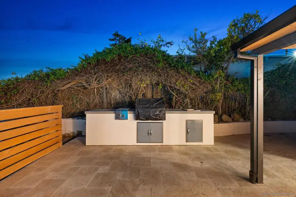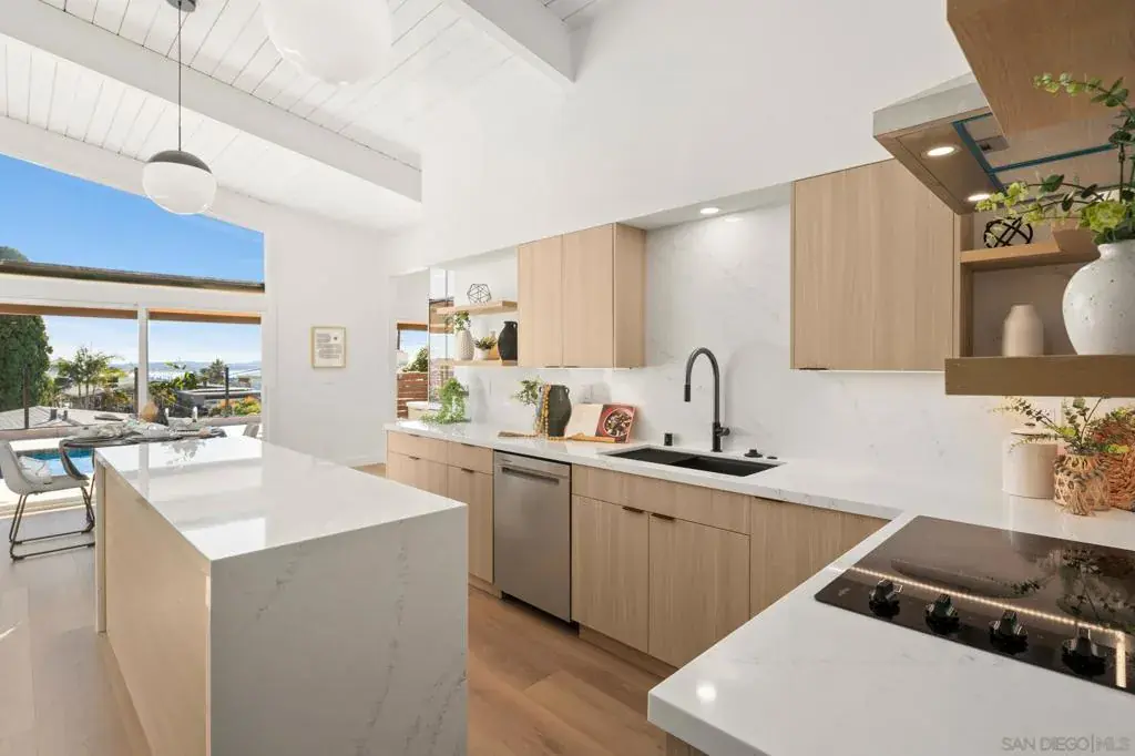 Welcome to this fully reimagined mid-century residence in North Pacific Beach, where iconic architecture meets refined coastal luxury. Every detail has been thoughtfully elevated. Inside, the home features new waterproof laminate and tile flooring, new baseboards and casings, interior and sliding doors, a custom fireplace, fresh paint, and built-in hallway storage. All windows have been replaced with dual-pane glass. Custom closet systems enhance each of the three bedrooms, including the walk-in primary closet. The kitchen is a showpiece, appointed with energy-efficient appliances, custom cabinetry, quartz countertops with extended backsplash, and new plumbing and lighting throughout. A butler’s pantry with sink and added storage offers both beauty and function. Bathrooms boast floor-to-ceiling tile, custom glass in the primary suite, a solid teak dual vanity, and dedicated outlets for smart/bidet toilets. Behind the walls, major foundation repairs, significant plumbing upgrades, a full electrical rewire with panel and sub-panel upgrade, new HVAC, tankless water heater relocation, hardwired smoke/CO detectors, and improved ventilation provide peace of mind. Outdoors, enjoy a completely resurfaced and retiled deep pool with new filter, new gas line for a future heater, and approximately 1,800 sq ft of imported travertine. A custom 12-foot outdoor kitchen, 60 feet of glass railing, new landscaping with irrigation and timer, new stucco with weep screed, gutters, drainage system, aluminum entry shades, new gas meter, new garage door with motor, and EV charger complete this