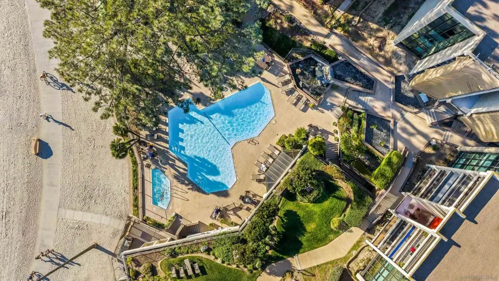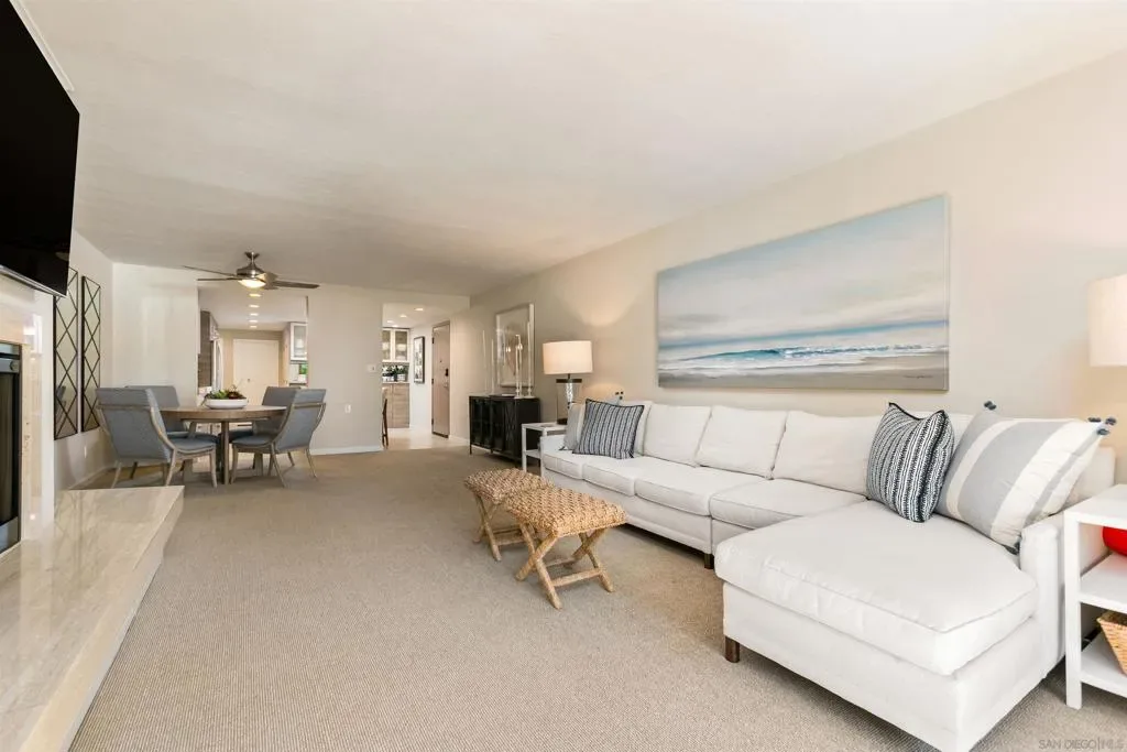 Gracing the shoreline of Sail Bay, this exceptional top-floor penthouse in Bay Scene’s coveted Tower One offers refined waterfront living with sweeping southwest views of the bay and Pacific horizon. Framed by a majestic 150-year-old Torrey Pine, panoramic vistas extend from the living room, dining area, kitchen, and both bedrooms. Spanning approximately 1,559 square feet, the beautifully renovated two-bedroom, two-bath residence is designed for privacy and functionality, with no shared living-area walls, ideal bedroom separation, marble surround fireplace, in-unit laundry, and ample storage. Timeless finishes include a remodeled kitchen with quartz countertops, soft-close cabinetry, and stainless-steel appliances. A covered balcony invites you to relax and enjoy the coastal scenery. The home includes two assigned underground parking spaces and access to a secure garage with car-washing area. Bay Scene is Sail Bay’s premier bayfront condominium community, offering resort-style amenities: a heated waterfront pool and spa, BBQ areas, fitness center, clubhouse, kayak and paddleboard storage, elevators, secure entry, and direct access to the sand and boardwalk. Just moments from the ocean, parks, shops, and dining, this rare penthouse delivers luxury coastal living at its finest.