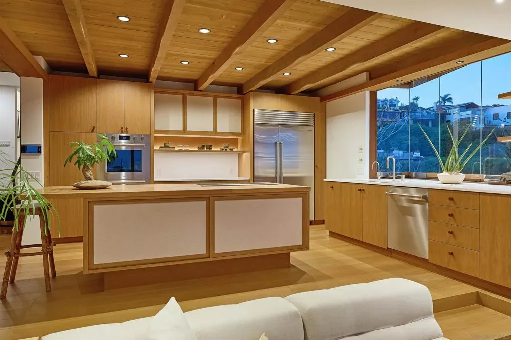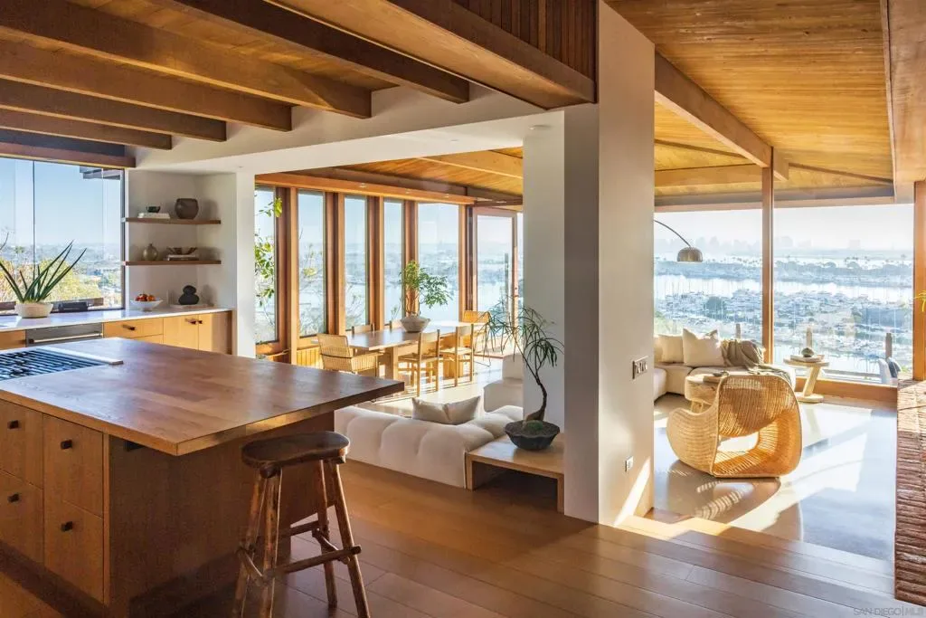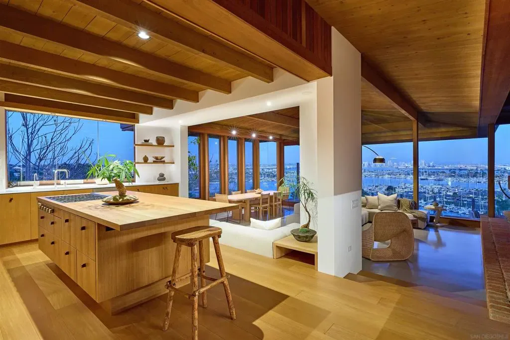 Organic architecture at its most livable. Impeccably designed and soulfully updated, this Kendrick Bangs Kellogg-designed house in La Playa fuses artistry with lifestyle. Intoxicating views frame the marina, downtown skyline, Coronado Bridge & beyond. Restored w/ every modern amenity, the sanctuary is grounded by a textural material palette: timber, concrete & Kellogg’s signature brick fireplace. The floor plan balances social scale w/quiet retreat. The neighborhood mixes old & new w/buzzy coffee shops. Architectural Distinction San Diego architect Kendrick Bang Kellogg designed striking structures—some of the most celebrated ever built—seeking to blend them with their natural environments. Here is one of the earlier examples of his nature-inspired work, featuring plate glass and rough-sawn wood. The house was designed by Kellogg in 1968 and thoughtfully restored in 2021, ensuring its architectural narrative will endure for generations. Anchored on the hillside of Point Loma’s historic La Playa neighborhood, the house is warm, textural, and an organic extension of the landscape. The interplay of natural materials and light reinforces the San Diego Harbor connection, offering a connected living experience that enriches daily rhythms. There’s a mix of soaring and more intimate spaces; the double-height living and dining area draws families together around the massive fireplace. Also a focal point: James Hubbell’s stained glass art creates a rhythmic pattern of color and light in the foyer. Striking a balance between independence and togetherness, the primary bedroom is a front-row retreat, while ensuite bedrooms rest along the eastern edge, set apart for privacy. Three separate bedroom zones create spatial complexity and a subtle separation that promotes household peace and harmony. Landmark Views Situated at the end of the road, the house is crafted to dramatically embrace the breadth of its site, presenting an expansive facade to the harbor. There’s a magical quality of natural light from the moment the sun rises until it sets, then allowing the moonlight to take over. Views frame the quiet excitement of the marina, Downtown San Diego’s skyline, and the Coronado Bridge. In winter, there are snow-capped mountains to the east. Indoor-outdoor spaces create a sanctuary to sit back and survey the world around you. Views embrace the harbor setting, which gently unfolds in a rhythm of daily life. Sailing classes. Regattas. The freedom of a lone Hobie Cat as it sets off on a twinkly sea. The Neighborhood Point Loma has an enviable mix of old-world charm and new-era verve. The house is close to buzzy coffee shops and restaurants, as well as Kellogg Beach, Southwestern Yacht Club, San Diego Yacht Club, and Point Loma Nazarene. Liberty Station is both an arts district and a vibrant dining destination.