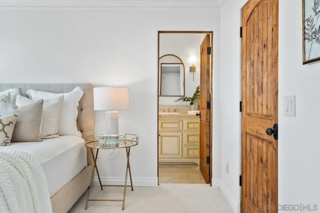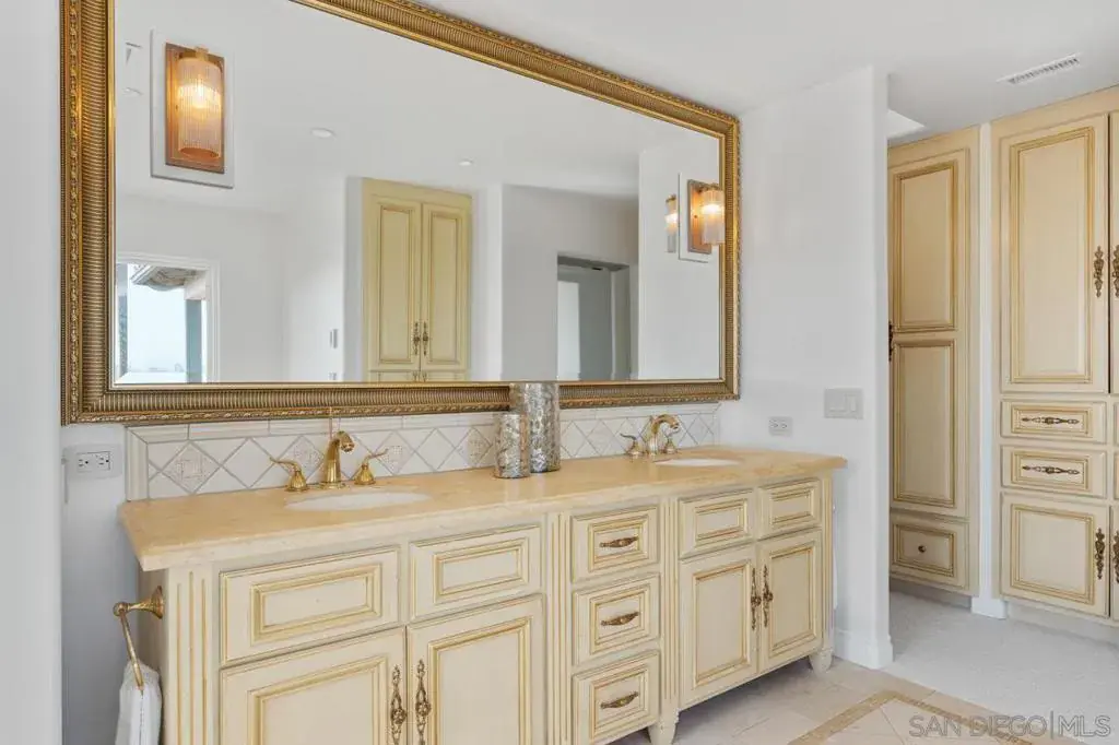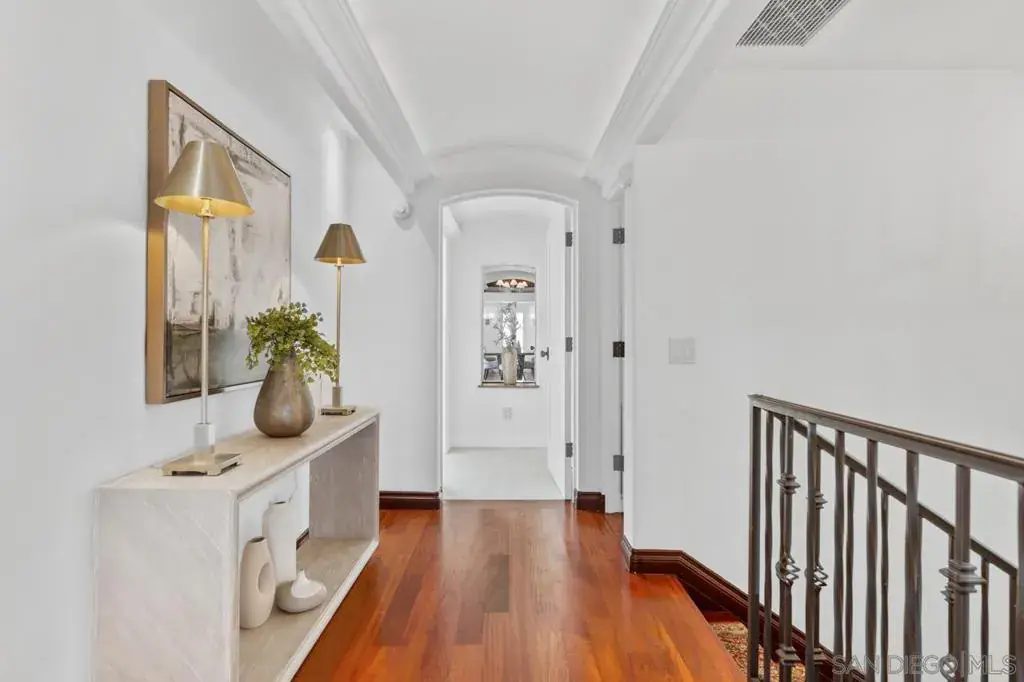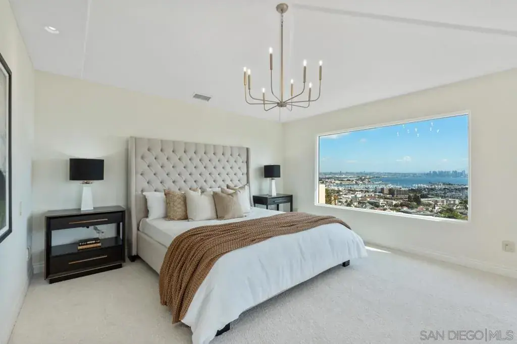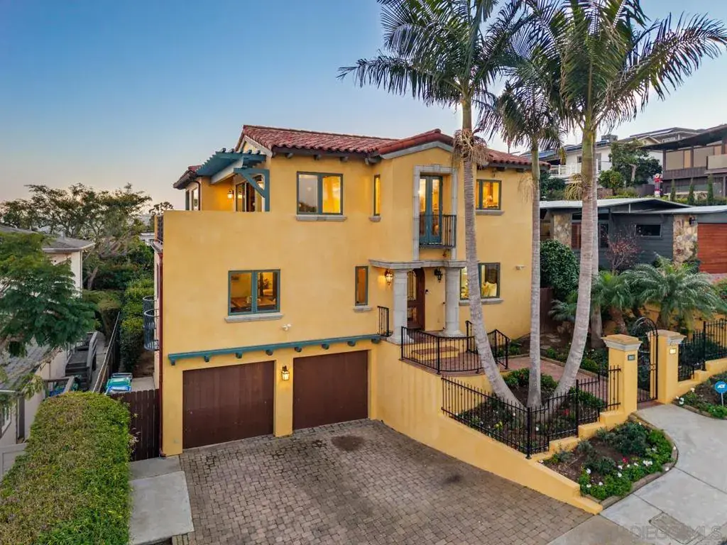 At 3235 Harbor View Drive, the name isn’t aspirational; it’s an understatement. This expansive Mediterranean, five-bedroom Point Loma residence commands a rare, sweeping panorama. Mountain sunrises unfold across Shelter Island’s mast-lined marinas and expand over the glittering expanse of San Diego Bay and the Pacific beyond. Virtually every room is framed by a different chapter of that view. A true chef’s kitchen, outfitted with high-end appliances, and ample cabinetry, fuses with a living space designed for the kind of gatherings where nobody wants to leave. A dedicated office overlooks the bay, turning the daily grind into something closer to meditation. Thoughtful details elevate the everyday: a built-in dumbwaiter ferries groceries from the attached garage level up to kitchen, and a second detached garage off the rear alley is ideal for additional vehicles or future creative use. Architectural details elevate the experience at every turn, from softly arched barreled hallways that guide you through the home to wrought iron Juliet balconies that frame the bay and invite in ocean breezes. Step outside to a spacious view patio and an enchanting, private yard, and you begin to understand why this address delivers an unmatched lifestyle. All of this is just minutes from Liberty Station’s dining and arts scene, the beaches of Sunset Cliffs, highly regarded schools, local yacht clubs and downtown San Diego. This is not simply a home with an incredible view. It is a front-row seat to the best of Point Loma living: elevated, private, and endlessly inspiring. Soaring vaulted ceilings with exposed wood beams lend the open kitchen, dining, and living areas a warmth and scale that few homes on the peninsula can match. Rich hardwood floors carry through the primary living spaces. The kitchen centers on a curved, furniture-grade island with granite countertops and a professional-grade Wolf six-burner range. The office is a showpiece in its own right: ornate pressed-tin coffered ceiling panels in a copper finish, dark wood millwork, built-in library shelving, and dual French doors opening onto a pair of wrought iron Juliet balconies overlooking the bay. A wet bar and additional seating area are just outside the office. The primary suite’s walk-in closet features custom built-in cabinetry and skylights, while the en suite bath is finished with natural stone countertops and crystal sconces. Outdoor living unfolds across multiple levels, including a pergola-shaded Saltillo tile courtyard with vine-covered lattice privacy walls and lantern lighting, plus a separate terracotta-tiled balcony overlooking the yard. Mature tropical landscaping, towering palms, a columned entry portico, and a wrought iron pedestrian gate complete a property where the craftsmanship was considered as carefully as the address.