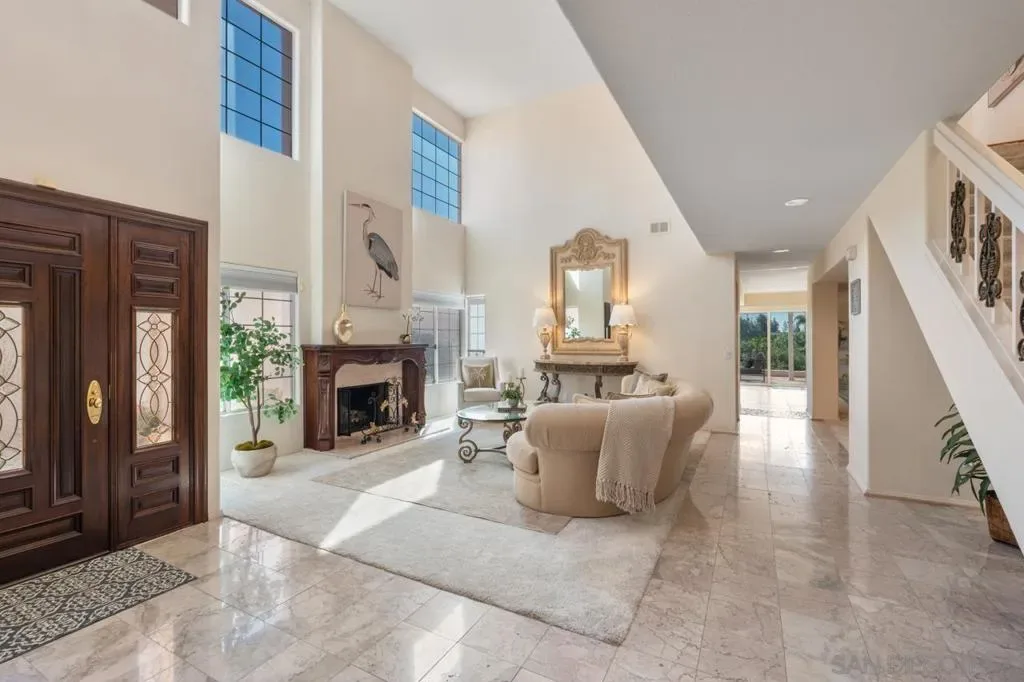 Beautifully updated Bernardo Heights home in the gated community of Los Rios, offering a resort-like setting backing to Bernardo Heights Country Club with panoramic golf course views. The formal living room features soaring ceilings and expansive windows that fill the space with natural light. A separate dining room, ideal for entertaining, opens to a private interior atrium with fountain. The spacious kitchen offers generous counter space, abundant storage, and flows seamlessly into a cozy family room and adjoining breakfast nook. A convenient downstairs bedroom and full bath provide ideal accommodations for guests. Upstairs, the primary suite features a fireplace and a spacious ensuite bath. Two large secondary bedrooms are connected by an open hallway bridge, along with a versatile second-floor balcony deck—perfect for creating an additional outdoor living space. The backyard is designed for relaxation and entertaining, featuring a large patio, covered seating area, newer alumawood patio cover and built-in BBQ. Oversized 2 car garage with finished epoxy flooring & abundant cabinets & storage area! Refrigerator/washer/dryer included. Residents of Los Rios enjoy amenities including a community pool, tennis courts, park, walking paths, and community center. Ideally located near Rancho Bernardo High School, Carmel Mountain Ranch shopping, and dining. A convenient downstairs bedroom and full bath provide ideal accommodations for guests. Upstairs, the primary suite features a fireplace and a spacious ensuite bath. Two large secondary bedrooms are connected by an open hallway bridge, along with a versatile second-floor balcony deck—perfect for creating an additional outdoor living space. The backyard is designed for relaxation and entertaining, featuring a large patio, covered seating area, and built-in BBQ. Oversized 2 car garage with finished epoxy flooring & abundant cabinets & storage area! Refrigerator/washer/dryer included. Residents of Los Rios enjoy amenities including a community pool, tennis courts, park, walking paths, and community center. Ideally located near Rancho Bernardo High School, Carmel Mountain Ranch shopping, and dining.