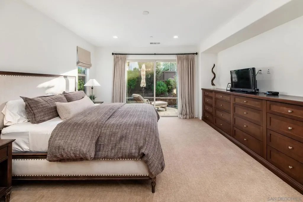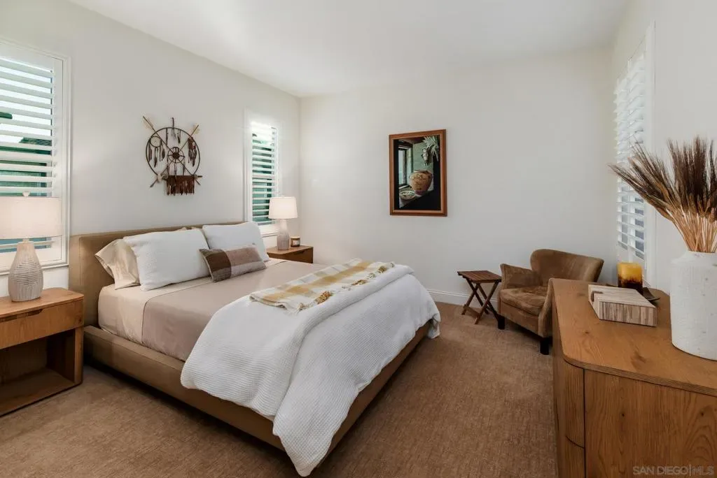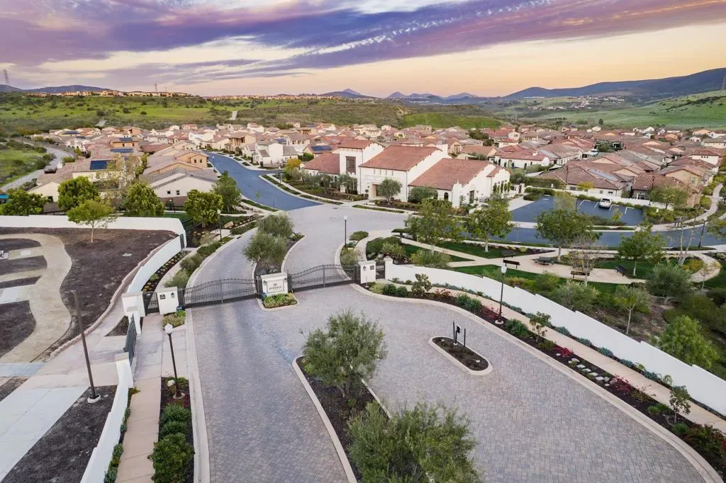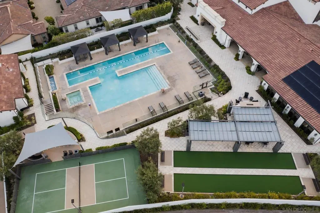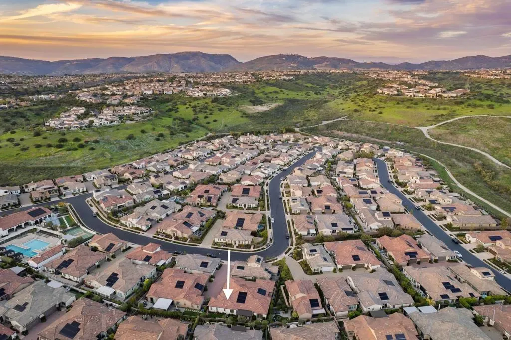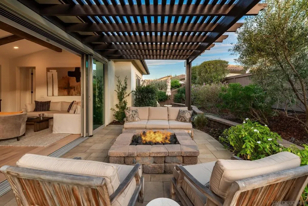 Set within the gated 55+ community of Auberge at Del Sur, this “Cottage” residence blends thoughtful design with relaxed indoor/outdoor living in a neighborhood known for its active & welcoming atmosphere. The home features an open layout where vaulted ceilings & exposed wood beams create warmth & architectural character. A wall of custom built-ins grounds the living room, while expansive sliding doors draw the eye outward to a private backyard retreat centered around a fire pit & surrounded by mature landscaping. The connection between inside & out is effortless making it ideal for everyday living & quiet evenings. The kitchen sits at the heart of the home, designed for both function & flow, featuring a large island, quartz countertops, generous cabinetry, walk-in pantry, & connected laundry room with built-in storage. Positioned for privacy, the primary suite feels serene & tucked away, complete with custom built-ins, direct backyard access, & a spacious bath with soaking tub & walk-in closet. The secondary bedroom serves as the ideal guest room & the optional 3rd bedroom overlooking the lush backyard is the perfect home office with ample built-in storage. Additional features include hardwood flooring, custom window treatments, solar panel system, electric vehicle charging, solar tube skylights, & Culligan water softener system. Residents of Auberge at Del Sur enjoy resort-style amenities including a pool & spa, gym, pickleball courts, clubhouse, dog park, & a full calendar of social activities that foster a connected & engaged community.