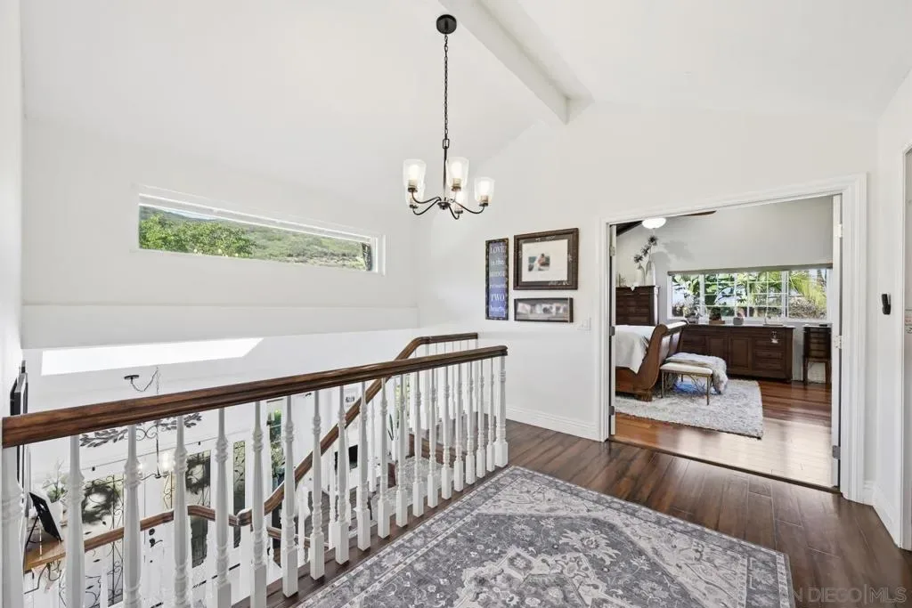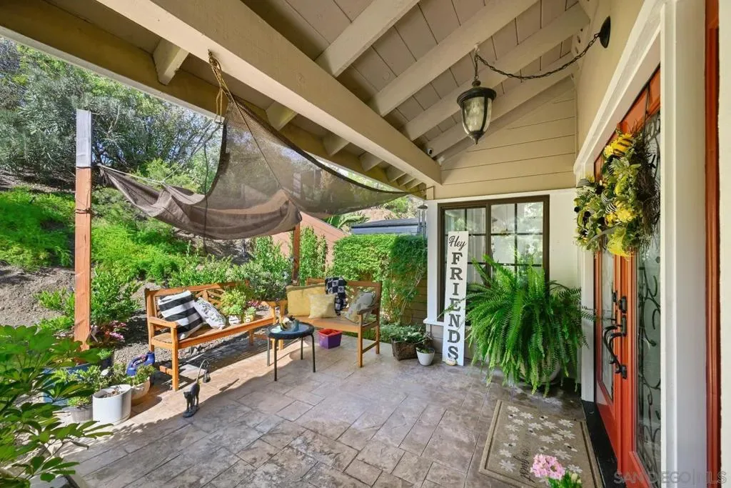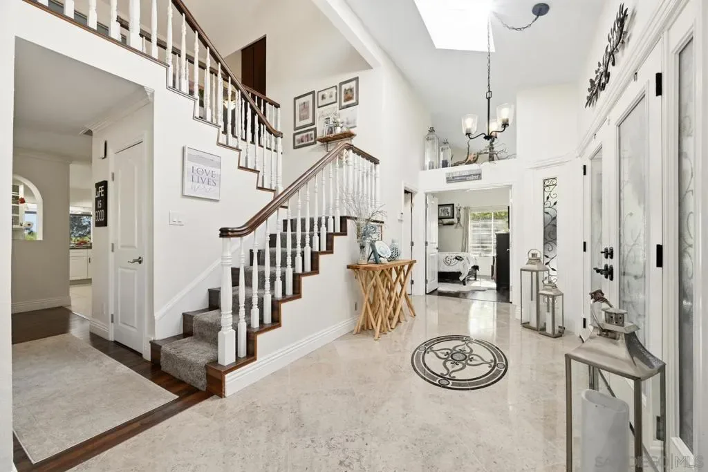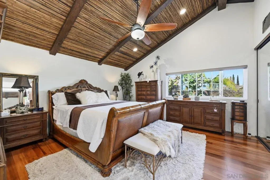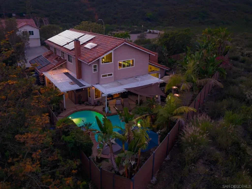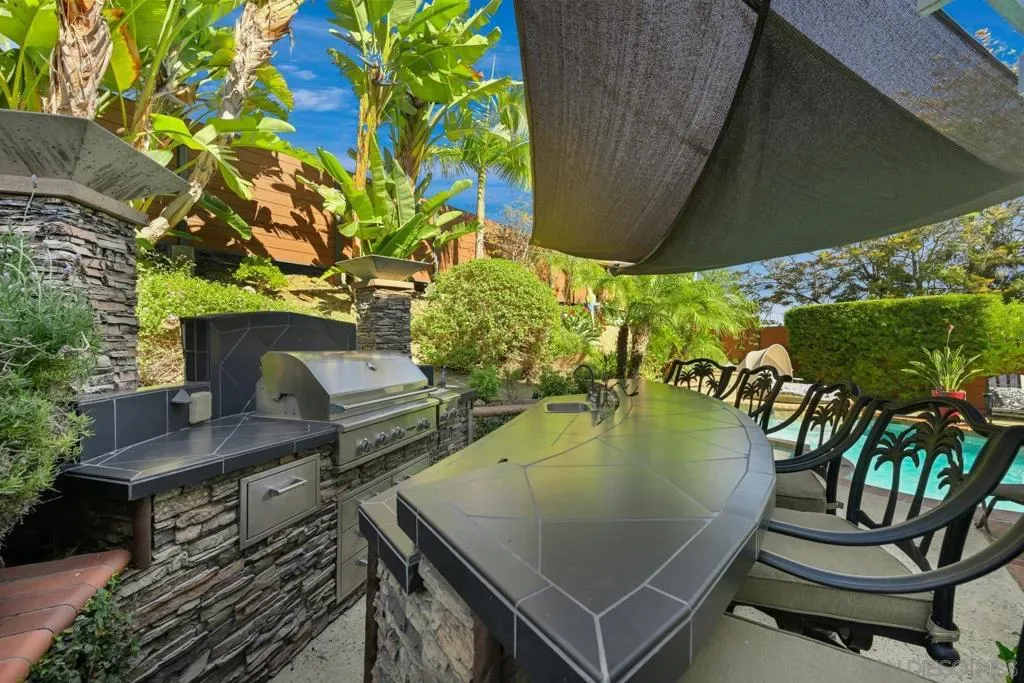 Entertainer’s Dream with Resort-Style Backyard, Ultimate PRIVACY, in Prime Location! Private oasis nestled against the serene Black Mountain Reserve. This bright, open-concept home features vaulted ceilings, 4 bedrooms, 3 full baths (1 bedroom and bath located on the 1st level), and an oversized bonus room—ideal for a home office, gym, or media space. Enjoy true indoor-outdoor living in the stunning backyard, complete with a sparkling pool, spa, waterfall, custom BBQ island with premium Delta Heat appliances, bar seating, customizable uplighting throughout, mature, tropical palm trees, bird-of-paradise, and other plants – the perfect setting for hosting or relaxing. The spacious 3-car garage offers abundant storage with built-in cabinetry, overhead racks, and a workbench. Retreat to the tranquil, island-inspired primary suite, featuring a distinctive bamboo ceiling detail, Brazilian Tigerwood flooring and a custom walk-in shower with rain shower. The updated kitchen includes new stainless steel appliances and a custom bar with a wine fridge. Located in the highly sought-after PUSD school district, minutes from Carmel Ranch Shopping Center, dining, and convenient access to I-15 and Hwy 56. No HOA or Melo Roos! Owned solar! Recent double-paned windows throughout. Dual-zone climate control. Fully-paid solar, NEM-I, zero/almost zero electric bill. All pool/spa functions controlled by app (filter on/off, pool/spa temperature, bubbles, lights, waterfall). Sprinkler system controlled by app. Outdoor electric heaters. Barbeque island has Delta Heat grill, 2-burners, refrigerator, garbage bin, paper towel compartment, storage). High-end outdoor speakers. Storage shed.