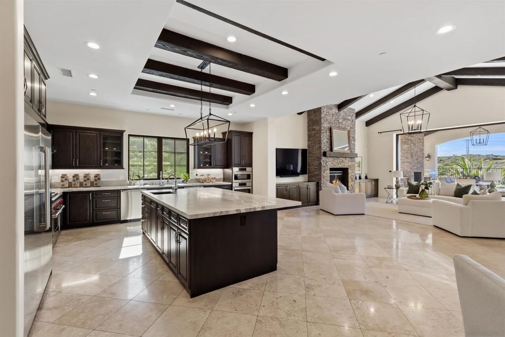 Absolutely stunning custom estate completed in 2022—among the newest homes in the prestigious Crosby at Rancho Santa Fe. Ideally located on a quiet, beautifully curated street of luxury residences within the highly rated Solana Santa Fe (K–8) and Torrey Pines High School districts, and near top private academies. Designed by local architect Scott Grunst, this 6,523 sq. ft. residence blends timeless elegance with modern luxury. A dramatic 22-foot foyer sets the tone with soaring arched windows, hardwood floors, exposed solid wood beams, and a grand staircase with wrought-iron railings. The chef’s kitchen is equipped with an eight-burner Wolf range with infrared charbroiler, 64″ Electrolux refrigerator/freezer, double Electrolux dishwashers, custom stained alder cabinetry, and Brazilian quartzite countertops. Entertain effortlessly with a full wet bar featuring a built-in kegerator and a custom, climate-controlled 800-bottle wine cellar with additional storage. Disappearing pocket doors create seamless indoor-outdoor living, opening the main living space to a covered loggia with fireplace, full outdoor kitchen, and Wolf BBQ. The resort-style backyard offers exceptional privacy with no close neighbors and showcases a rim-flow PebbleTec® pool, vanishing-edge spa, raised fire pits, and unobstructed sunset views over a protected natural preserve. The thoughtful floor plan includes an elegant executive office on the main level with built-ins and fireplace, a main-level guest or secondary primary suite ideal for multigenerational living, and a spacious upstairs primary retreat. Upstairs also features two additional ensuite bedrooms and a game room overlooking the living room below. Additional highlights include an owned solar system, oversized motor court, and a four-car garage configuration: attached two-car garage with Tesla charger plus a detached, insulated two-car garage with A/C wiring—ideal for a gym, studio, or yoga space. Residents enjoy access to The Crosby’s Fred Couples-designed golf course, 35,000-sq.-ft. clubhouse, tennis and pickleball courts, Olympic-size pool, spa, fitness center, dining, and active social calendar. Conveniently located with quick access to Rancho Santa Fe Village via the north gate and Hwy 56, Hwy 15, and Hwy 5 via the south gate for beaches, shopping, and dining.