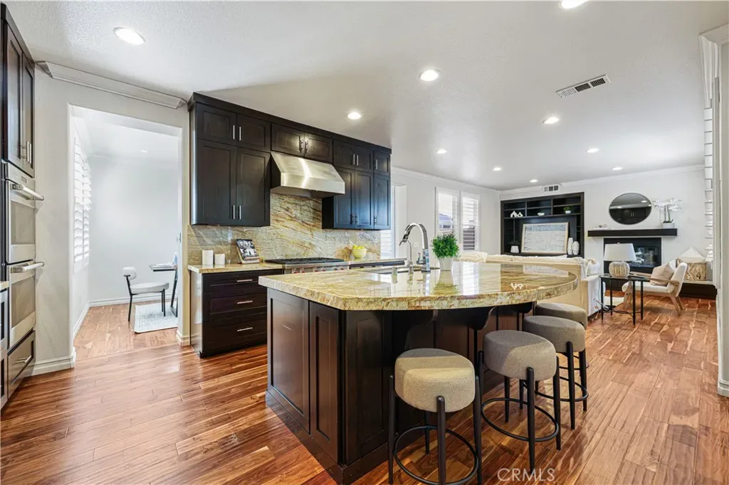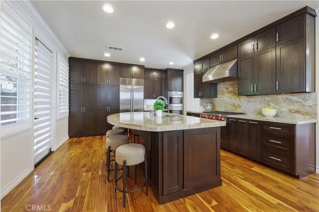 The chef’s kitchen is an entertainer’s dream, featuring granite countertops, premium Wolf appliances, and a Sub-Zero refrigerator, seamlessly opening to a warm and inviting family room.